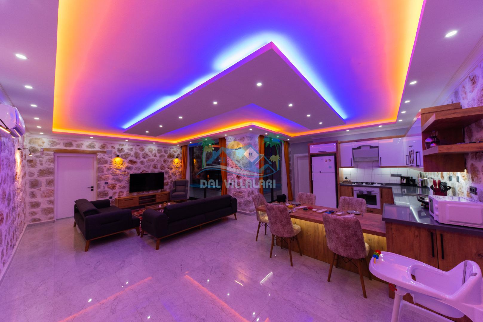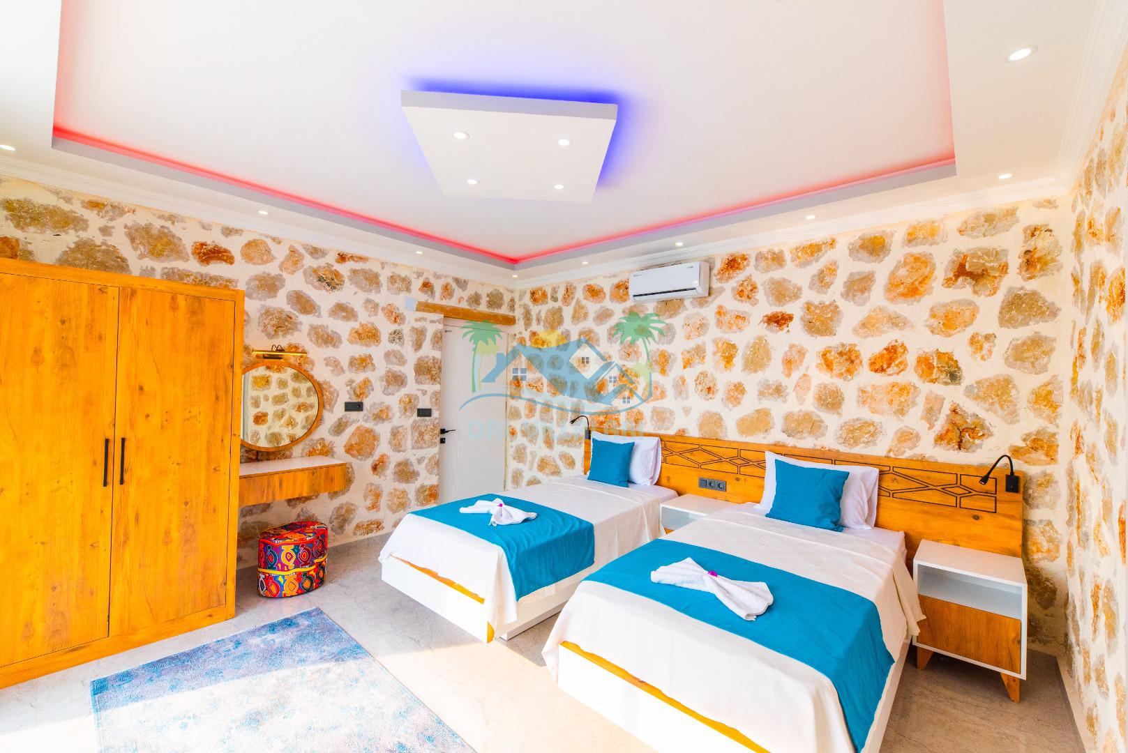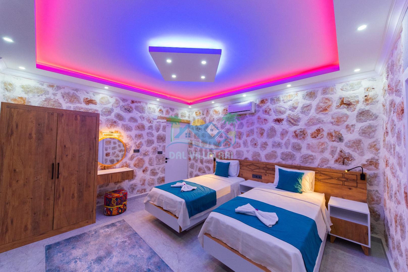 Villamızın iki adet yatak odası ve iki adet banyosu bulunmaktadır. Birinci yatak odası içerisinde bir adet çift kişilik yatak, banyo, jakuzi, klima ve televizyon; ikinci yatak odası içerisinde iki adet tek kişilik yatak, banyo ve klima yer almaktadır. Salon içerisinde mutfak, oturma grubu, televizyon ve klima yer almaktadır.