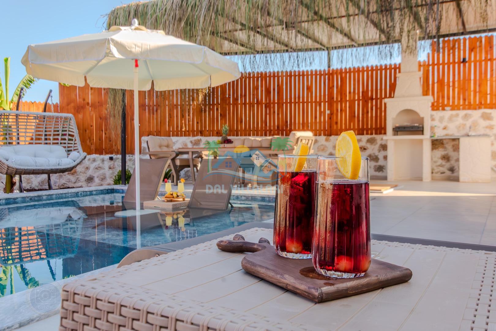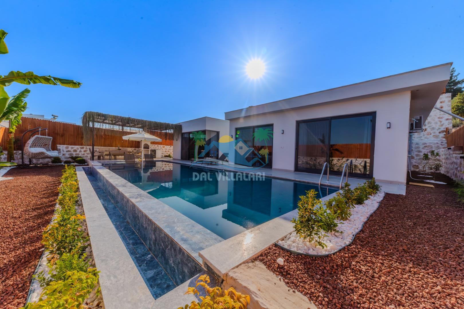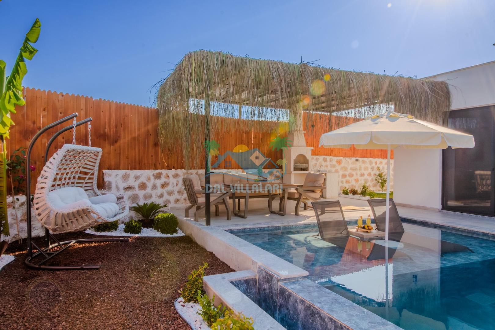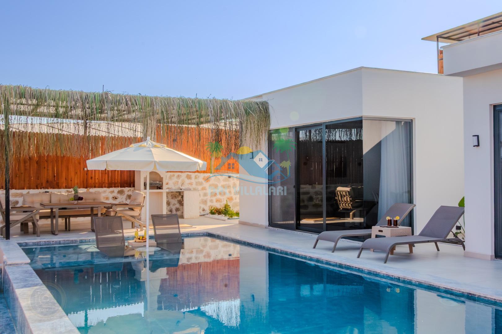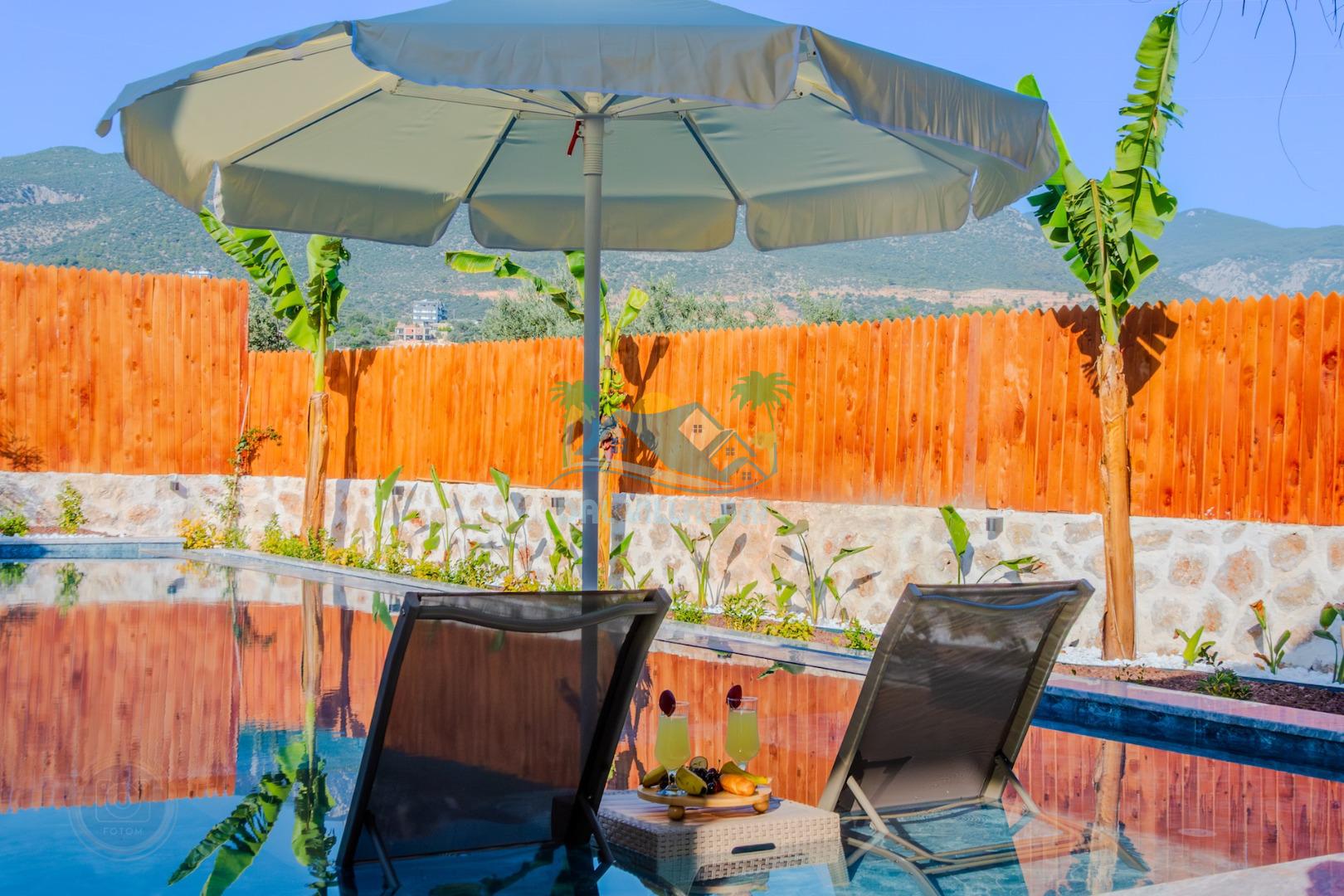 Kalkanda şehir kargaşasından uzak sakin bir konuma sahip olan villa, havuz terasında kapasiteye uygun şezlong takımı, oturma grubu, çocuk oyun ve barbekü alanı, salıncak ile keyifli bir alana sahiptir. Geniş havuz ve bahçesine açılan konforlu oturma odası ve tam donanımlı açık mutfağı bulunmaktadır.