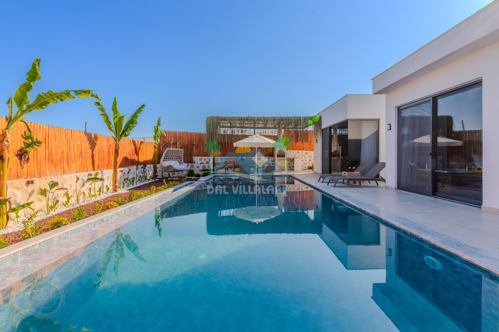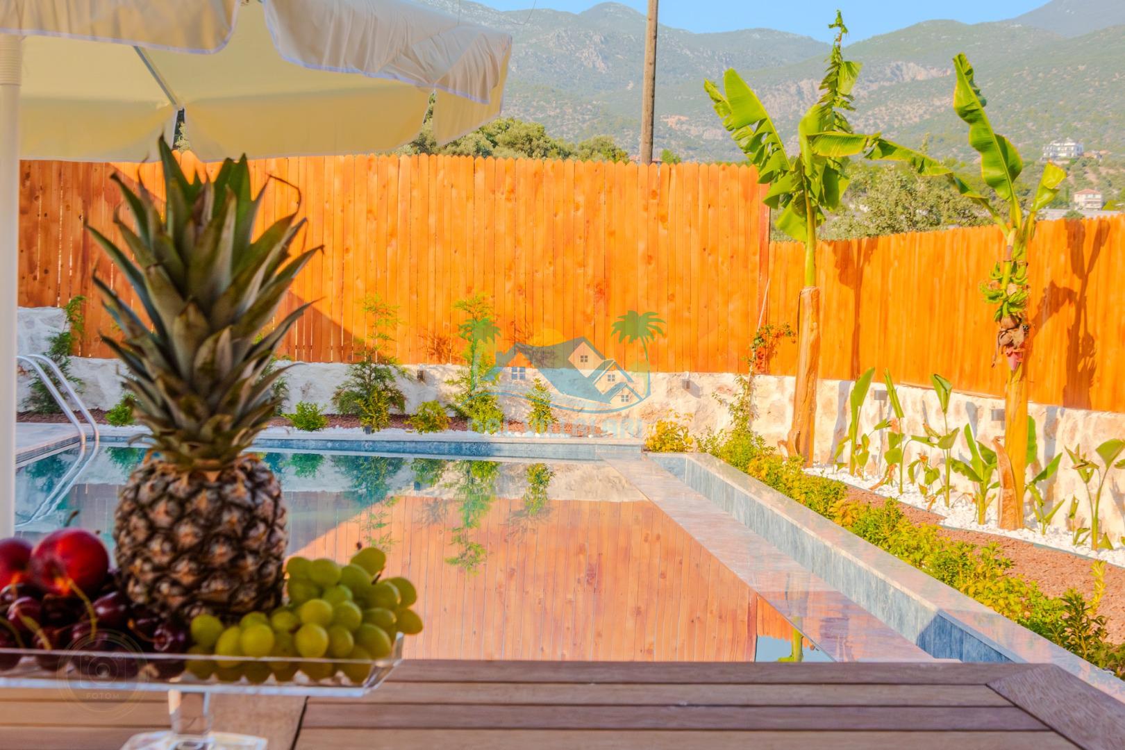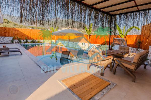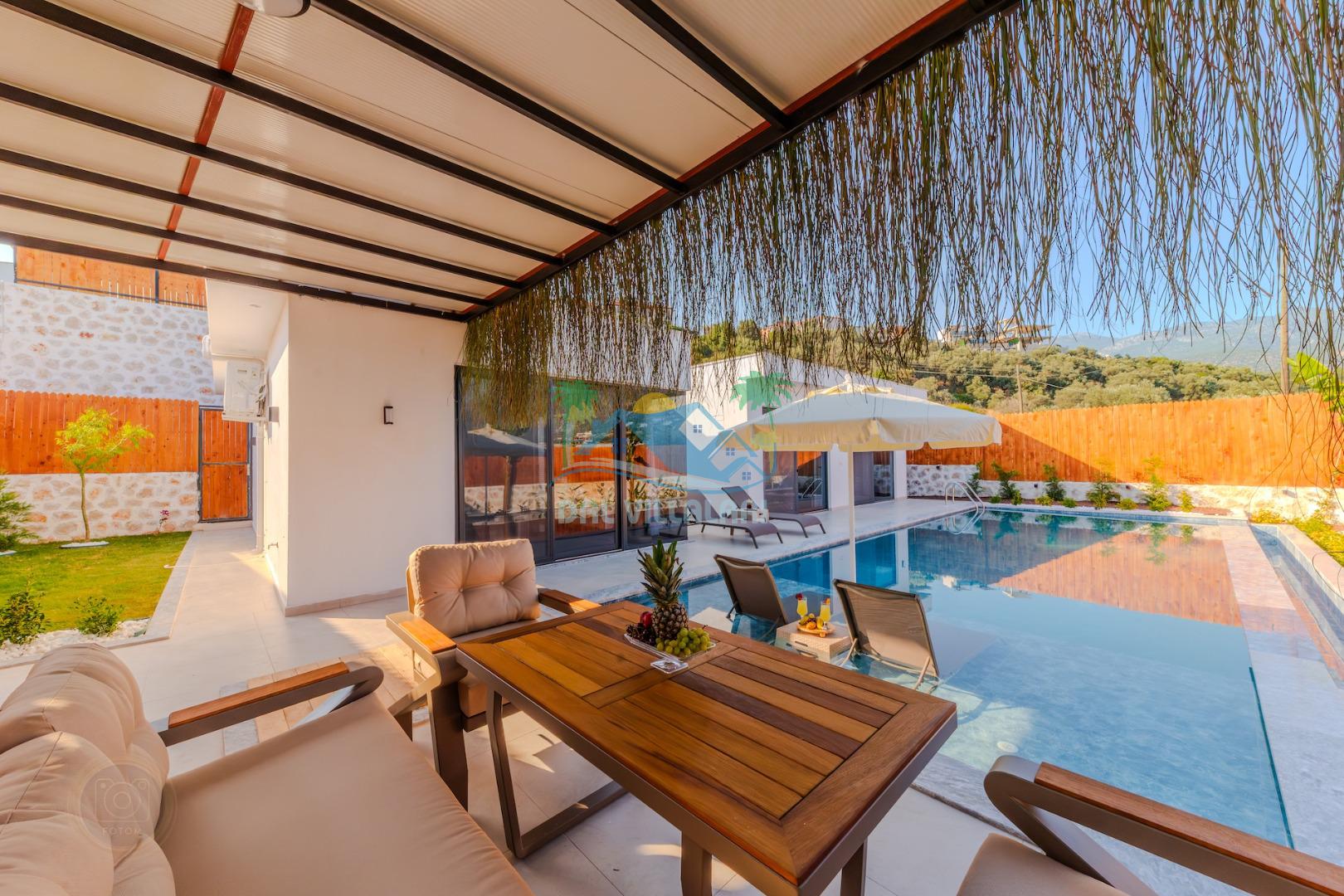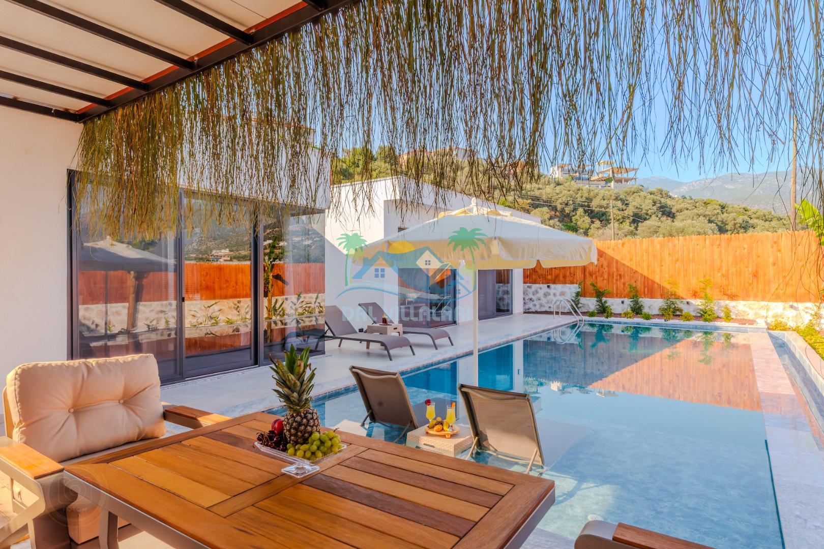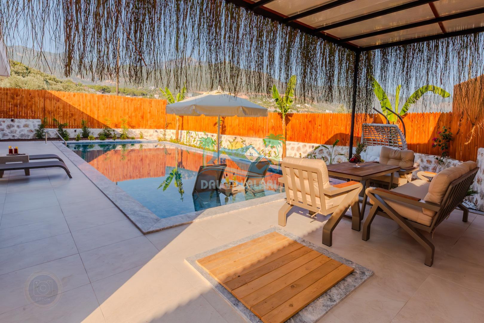 Kalkanda şehir kargaşasından uzak sakin bir konuma sahip olan villa, havuz terasında kapasiteye uygun şezlong takımı, oturma grubu, çocuk oyun ve barbekü alanı, salıncak ile keyifli bir alana sahiptir. Geniş havuz ve bahçesine açılan konforlu oturma odası ve tam donanımlı açık mutfağı bulunmaktadır.