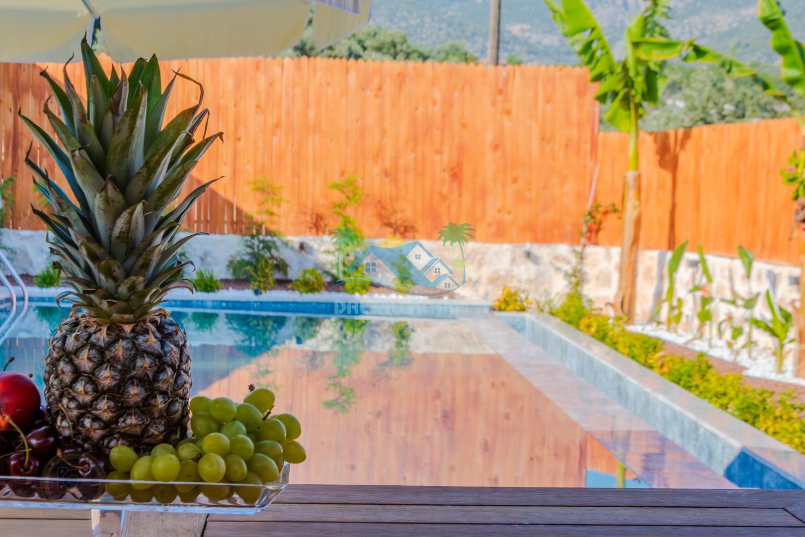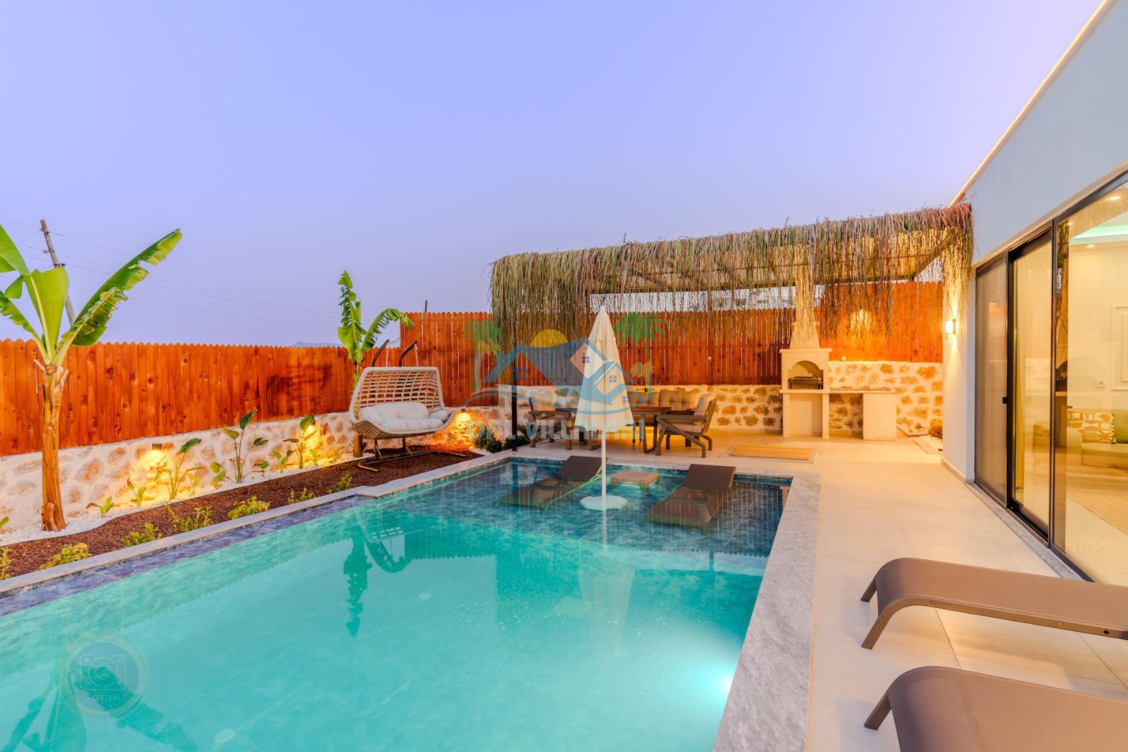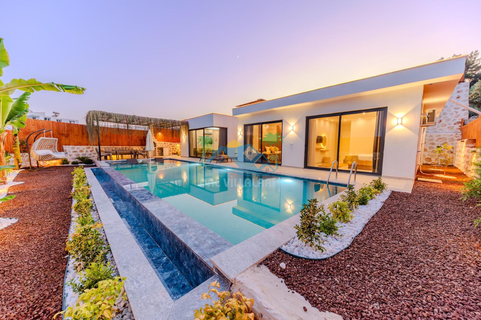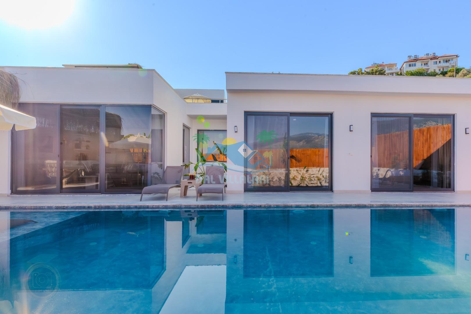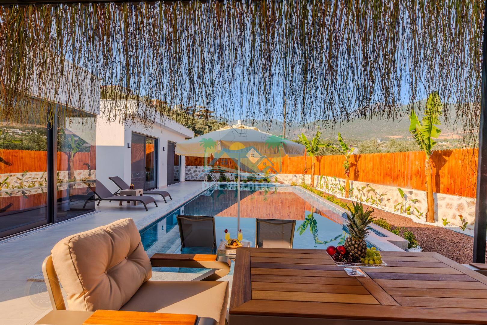 Kalkanda şehir kargaşasından uzak sakin bir konuma sahip olan villa, havuz terasında kapasiteye uygun şezlong takımı, oturma grubu, çocuk oyun ve barbekü alanı, salıncak ile keyifli bir alana sahiptir. Geniş havuz ve bahçesine açılan konforlu oturma odası ve tam donanımlı açık mutfağı bulunmaktadır.