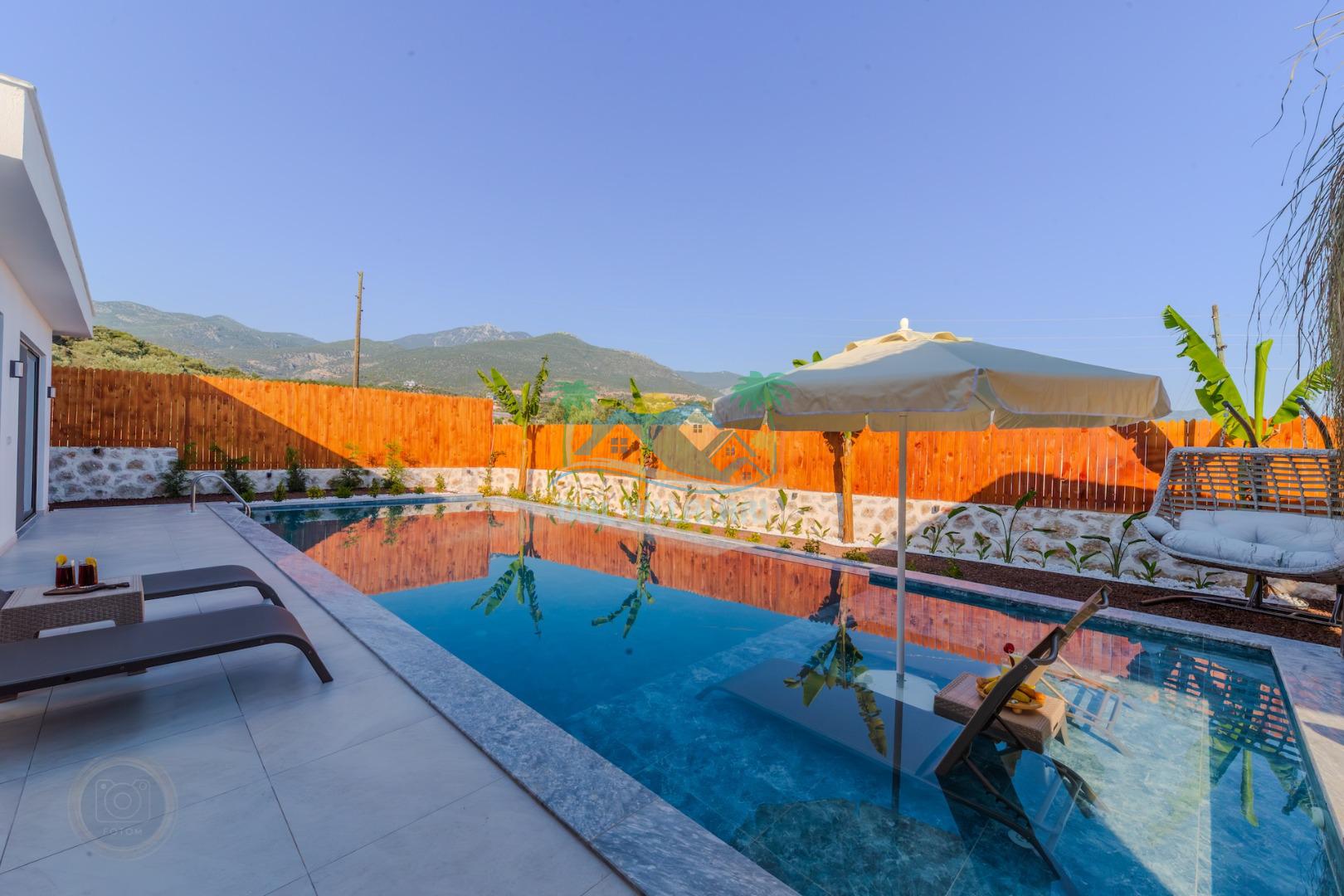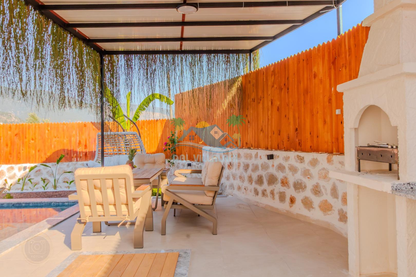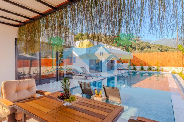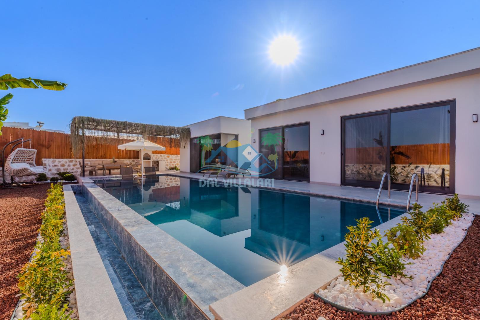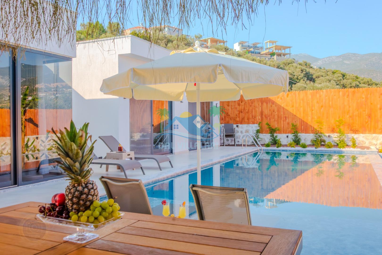 Kalkanda şehir kargaşasından uzak sakin bir konuma sahip olan villa, havuz terasında kapasiteye uygun şezlong takımı, oturma grubu, çocuk oyun ve barbekü alanı, salıncak ile keyifli bir alana sahiptir. Geniş havuz ve bahçesine açılan konforlu oturma odası ve tam donanımlı açık mutfağı bulunmaktadır.