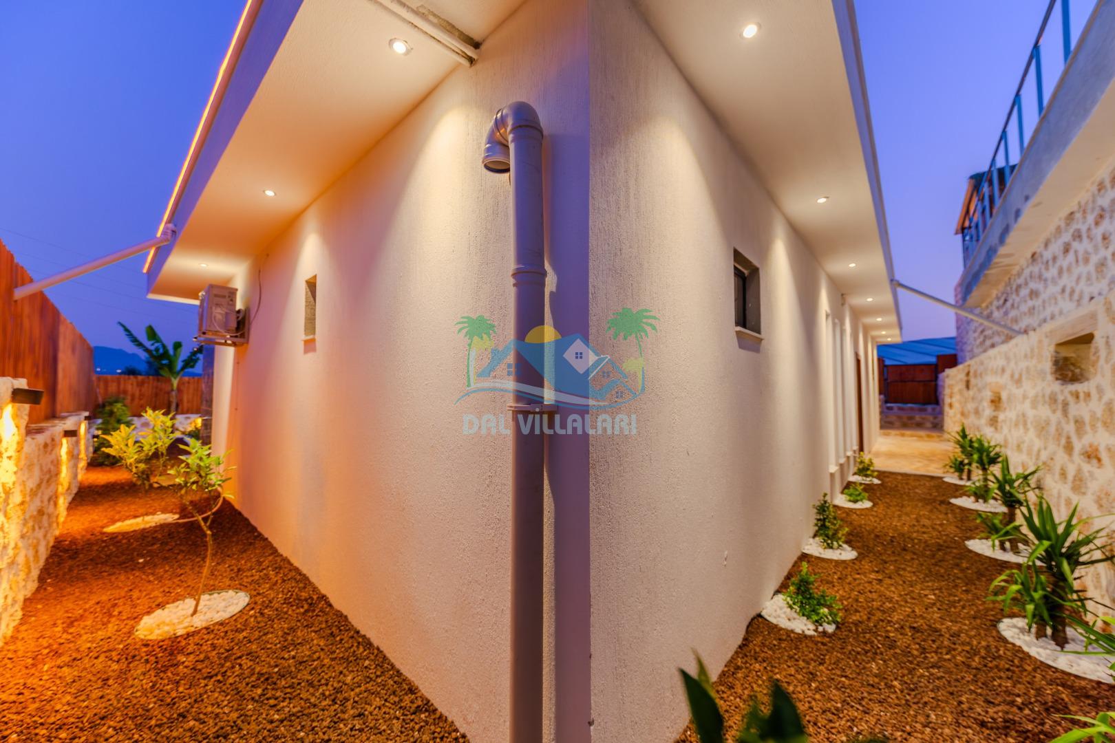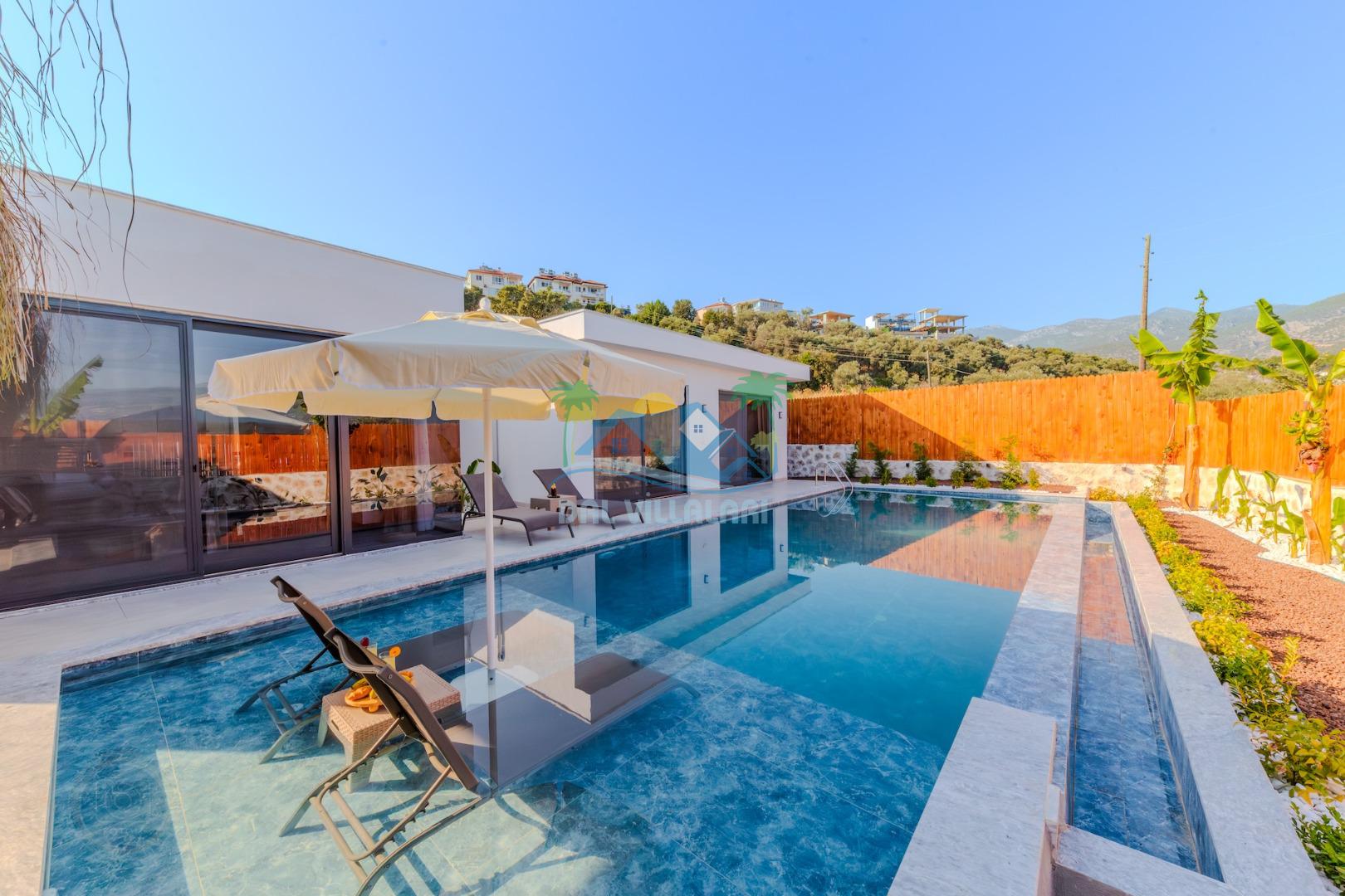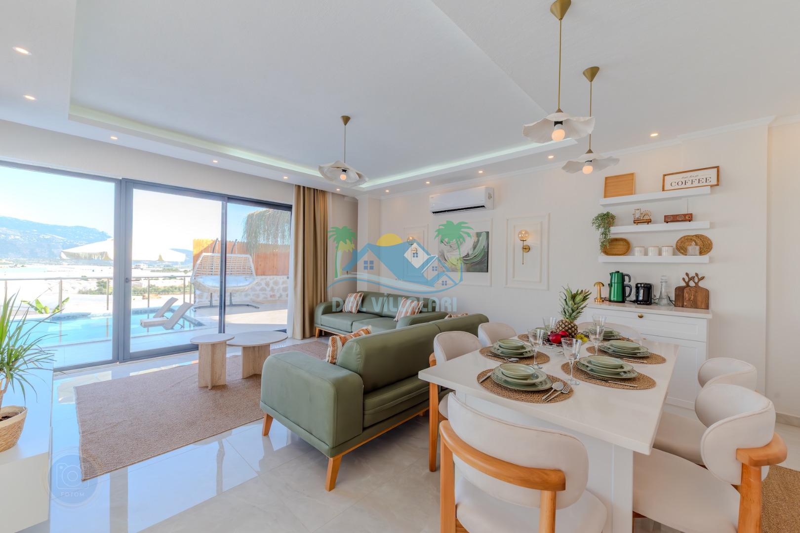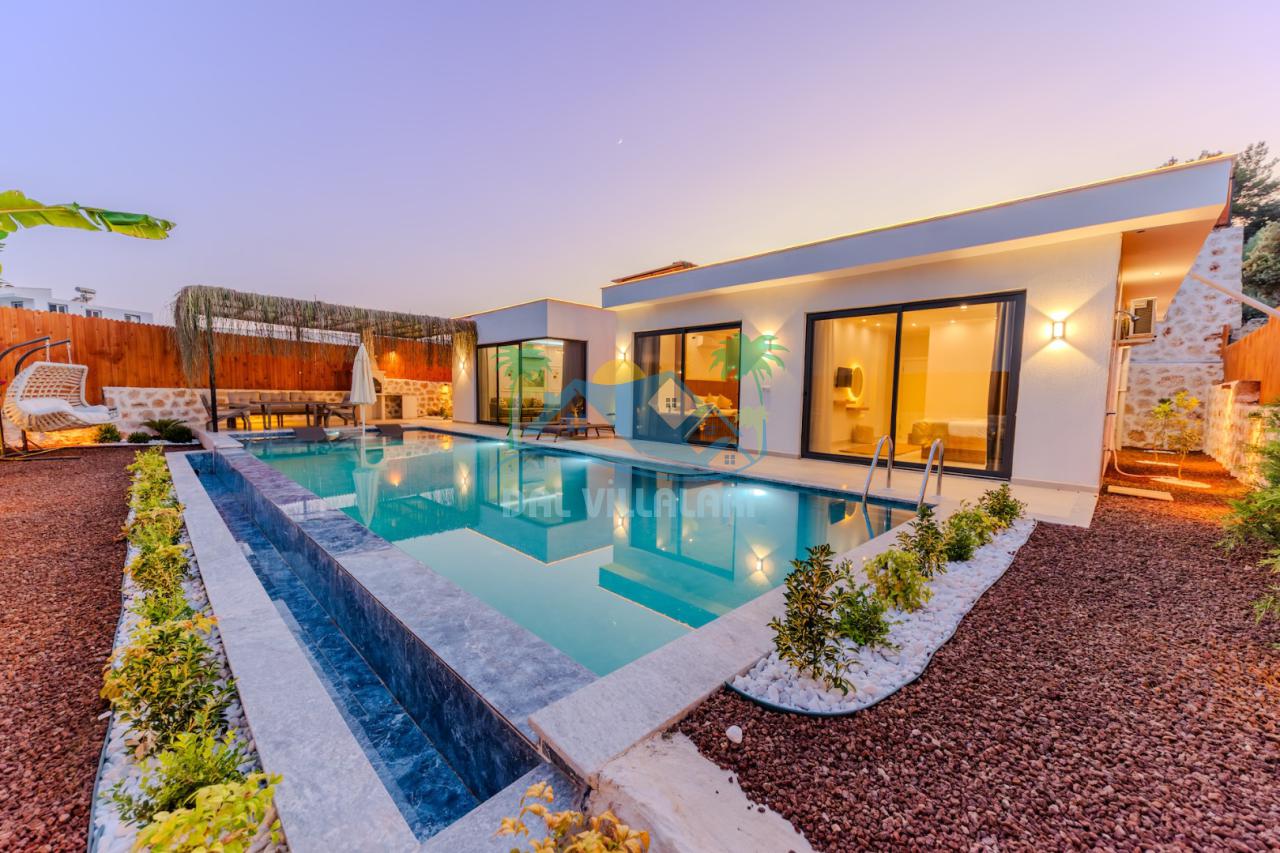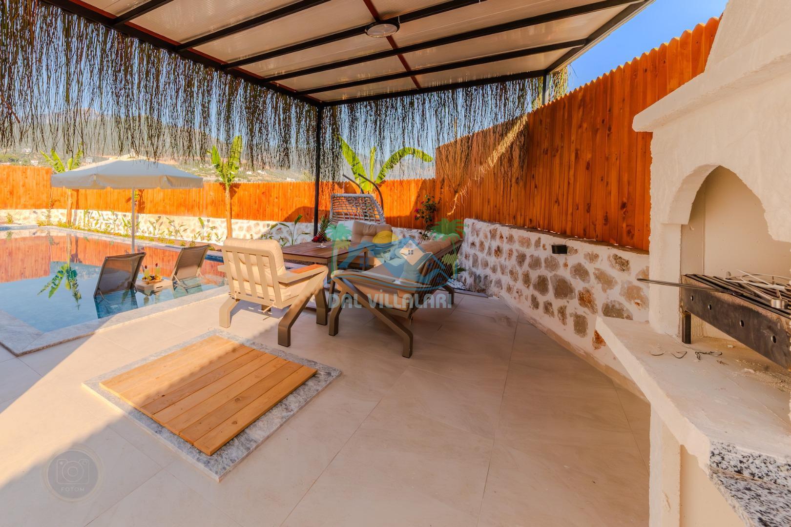 Kalkanda şehir kargaşasından uzak sakin bir konuma sahip olan villa, havuz terasında kapasiteye uygun şezlong takımı, oturma grubu, çocuk oyun ve barbekü alanı, salıncak ile keyifli bir alana sahiptir. Geniş havuz ve bahçesine açılan konforlu oturma odası ve tam donanımlı açık mutfağı bulunmaktadır.