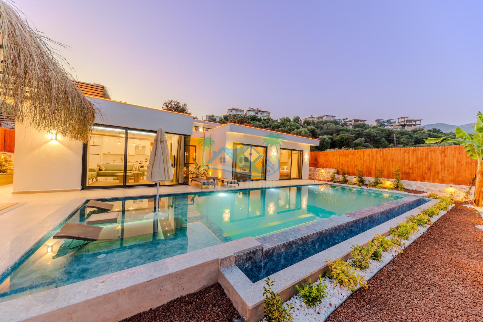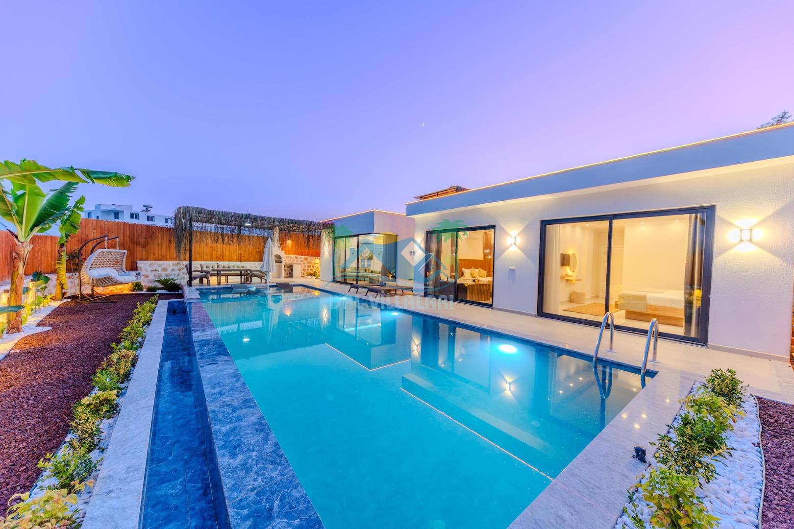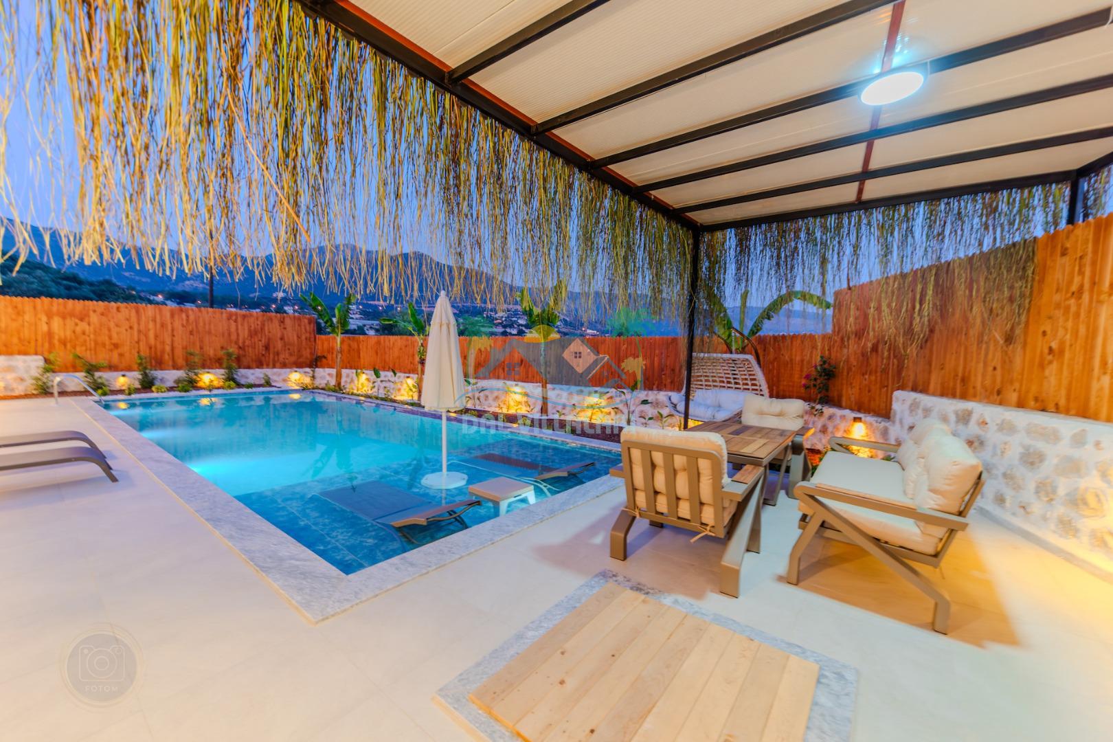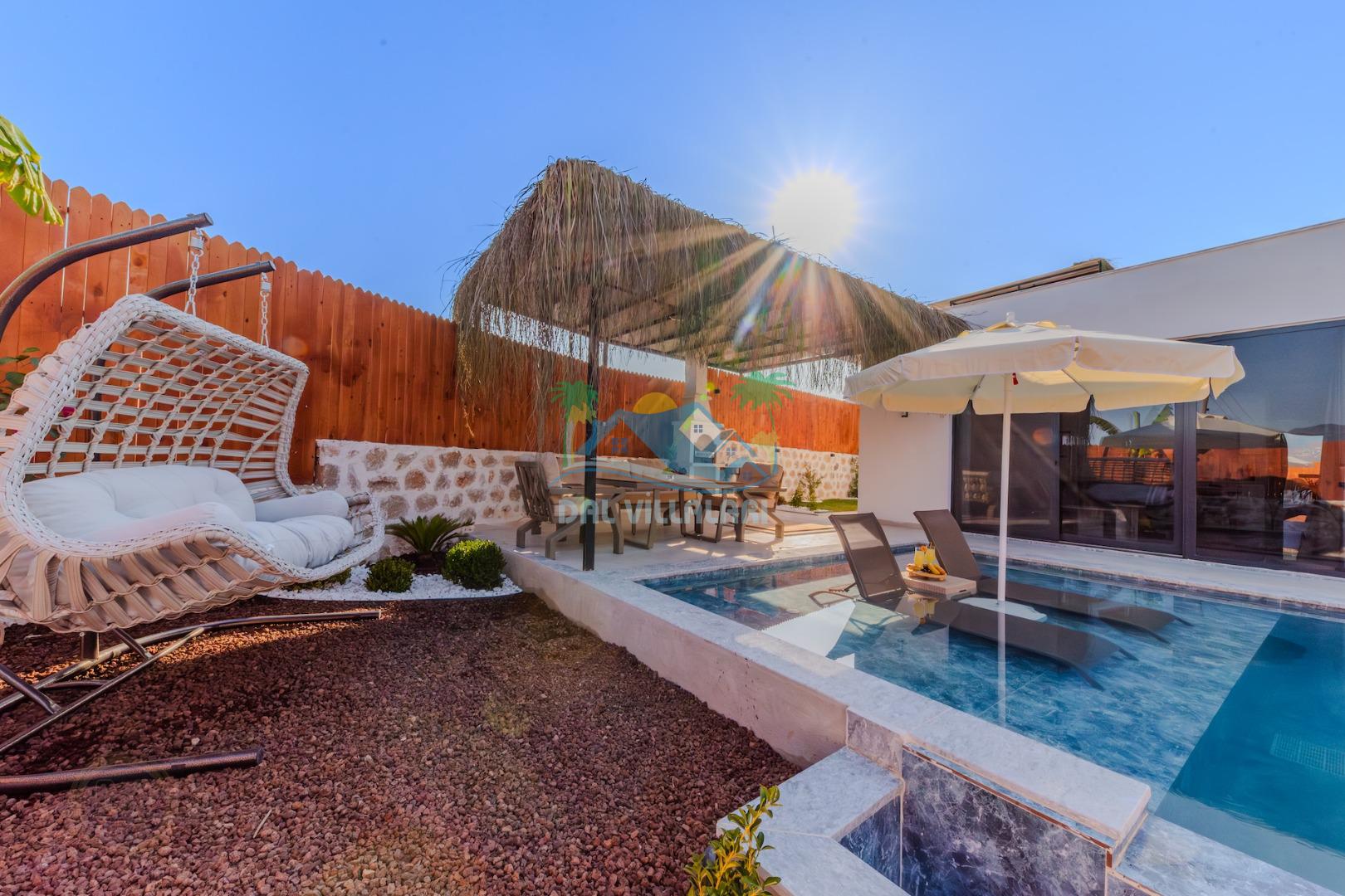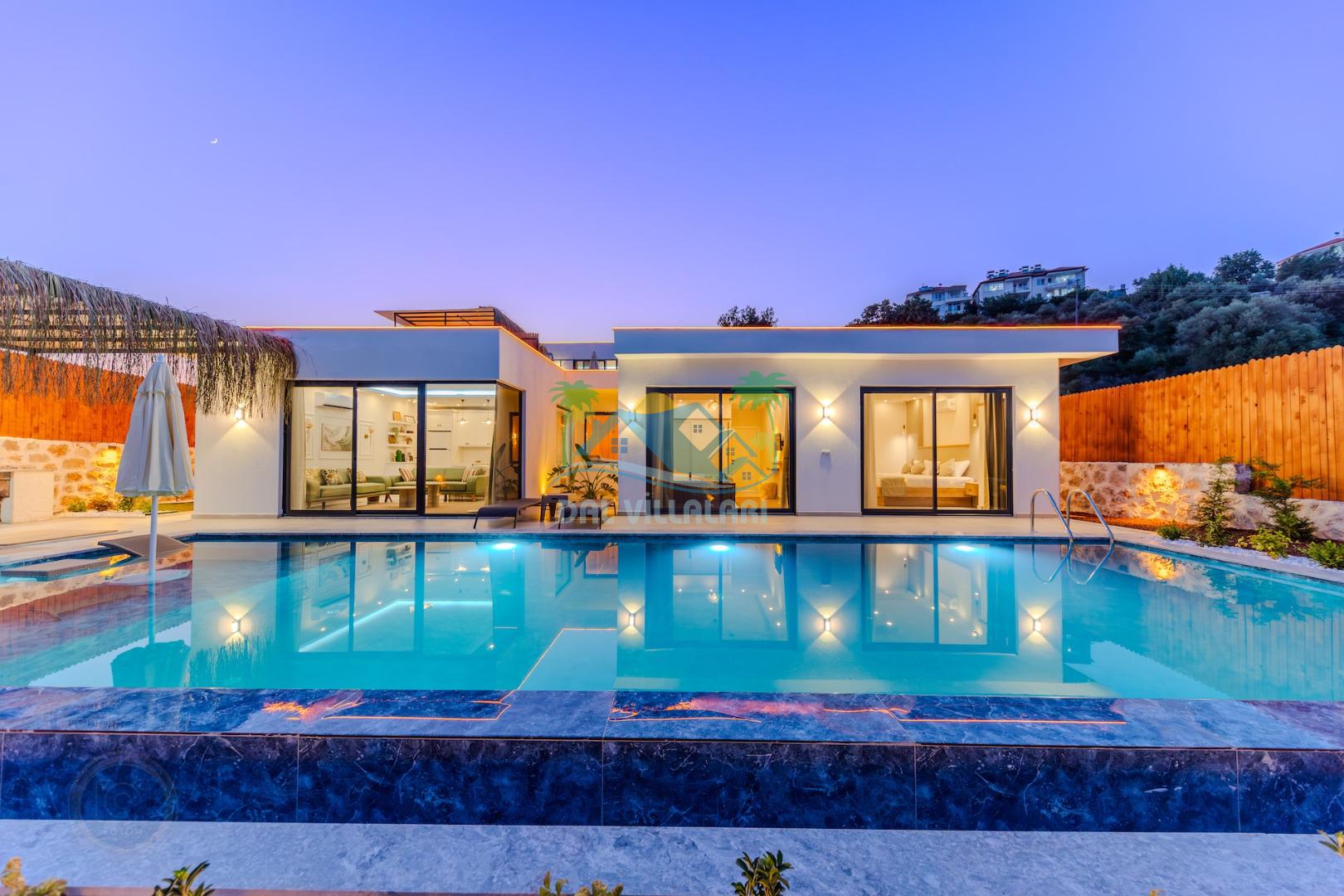 Kalkanda şehir kargaşasından uzak sakin bir konuma sahip olan villa, havuz terasında kapasiteye uygun şezlong takımı, oturma grubu, çocuk oyun ve barbekü alanı, salıncak ile keyifli bir alana sahiptir. Geniş havuz ve bahçesine açılan konforlu oturma odası ve tam donanımlı açık mutfağı bulunmaktadır.