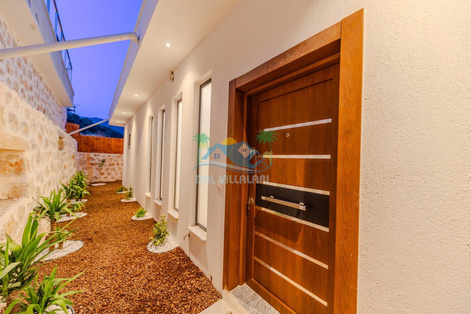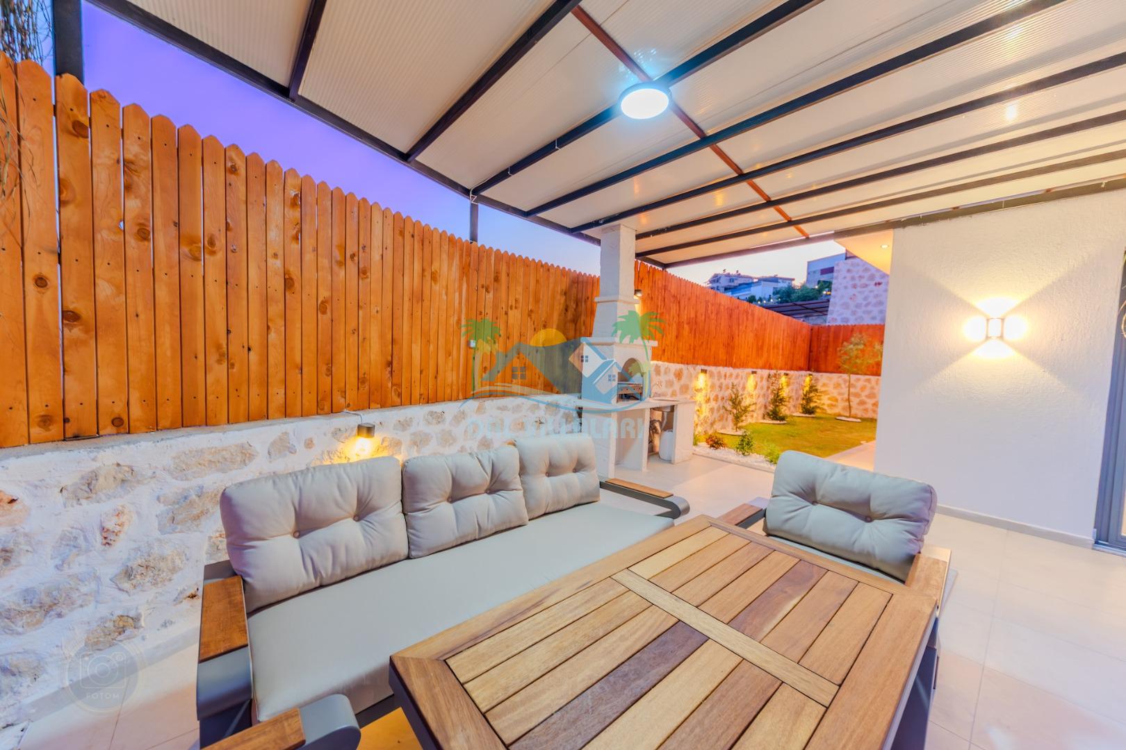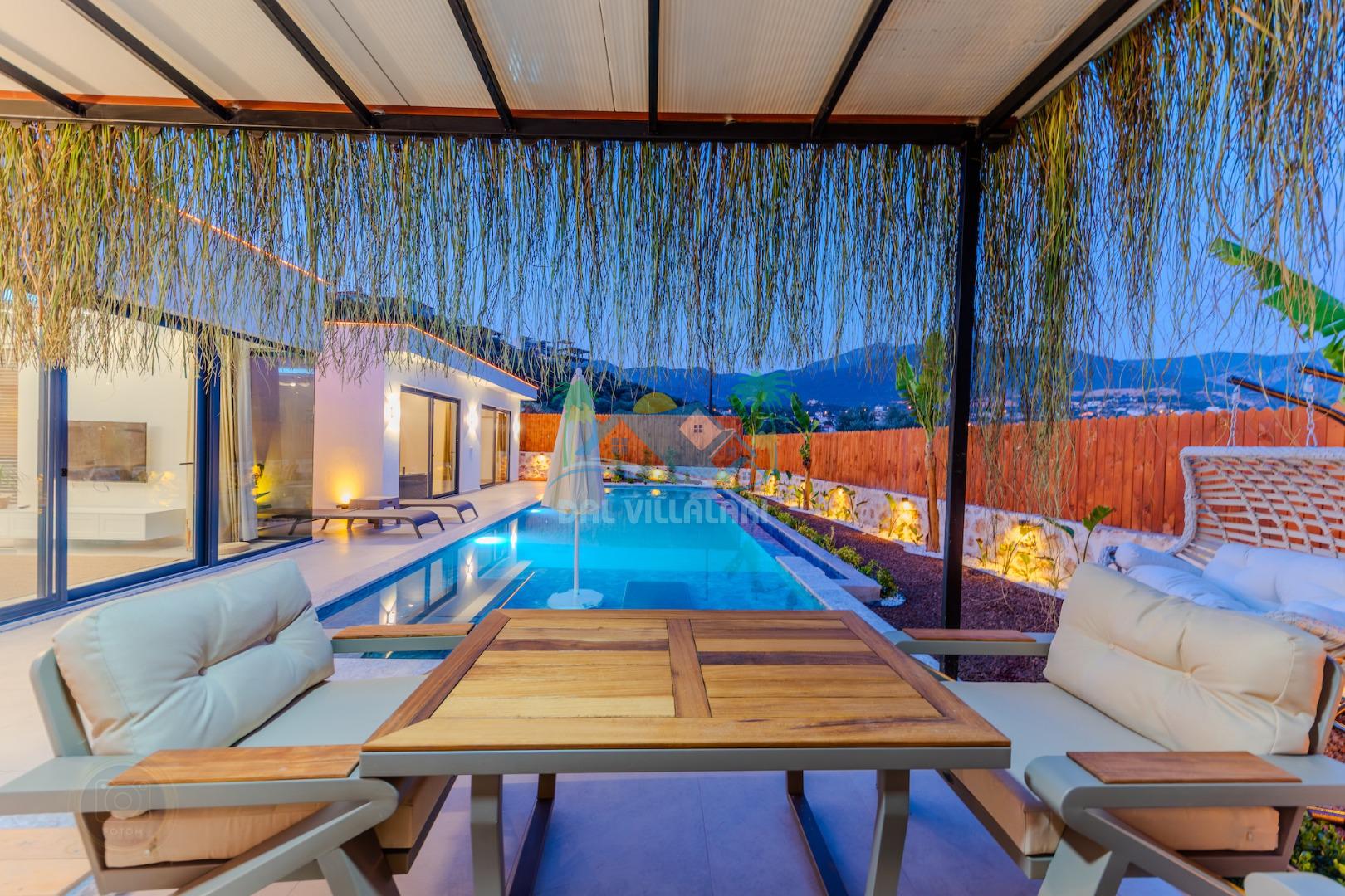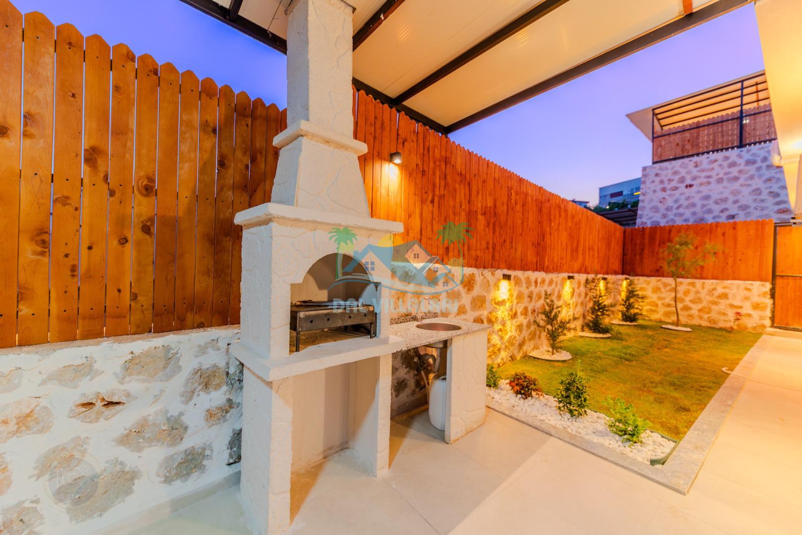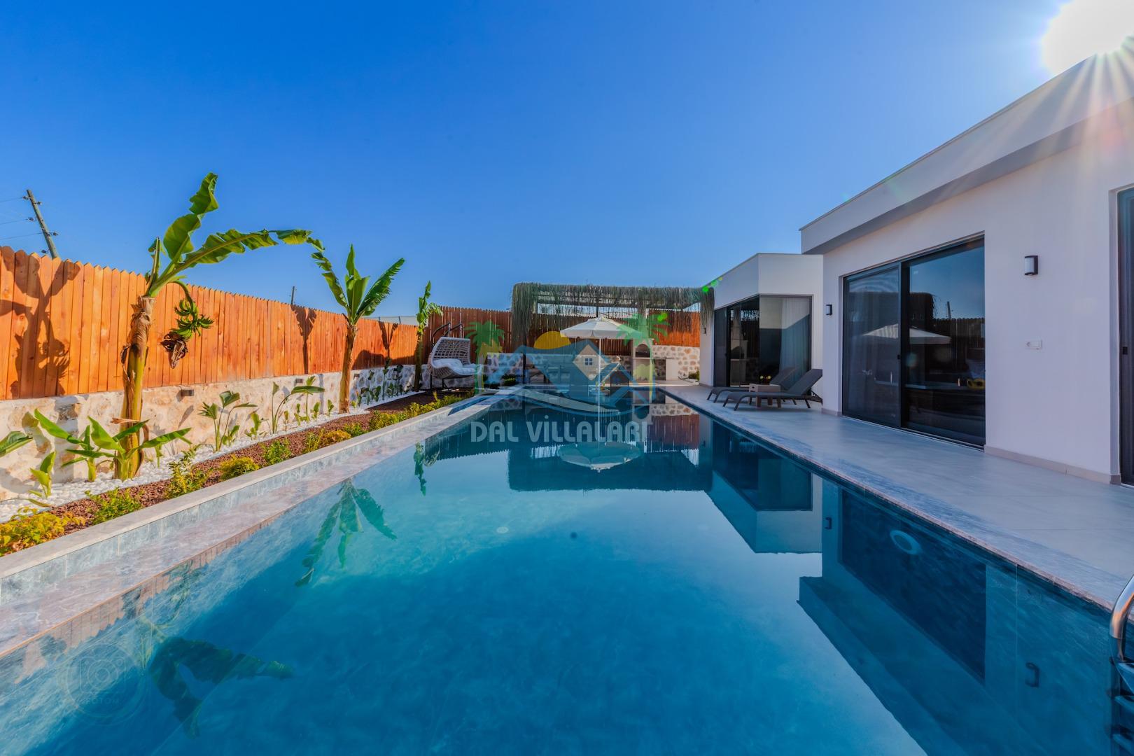 Kalkanda şehir kargaşasından uzak sakin bir konuma sahip olan villa, havuz terasında kapasiteye uygun şezlong takımı, oturma grubu, çocuk oyun ve barbekü alanı, salıncak ile keyifli bir alana sahiptir. Geniş havuz ve bahçesine açılan konforlu oturma odası ve tam donanımlı açık mutfağı bulunmaktadır.