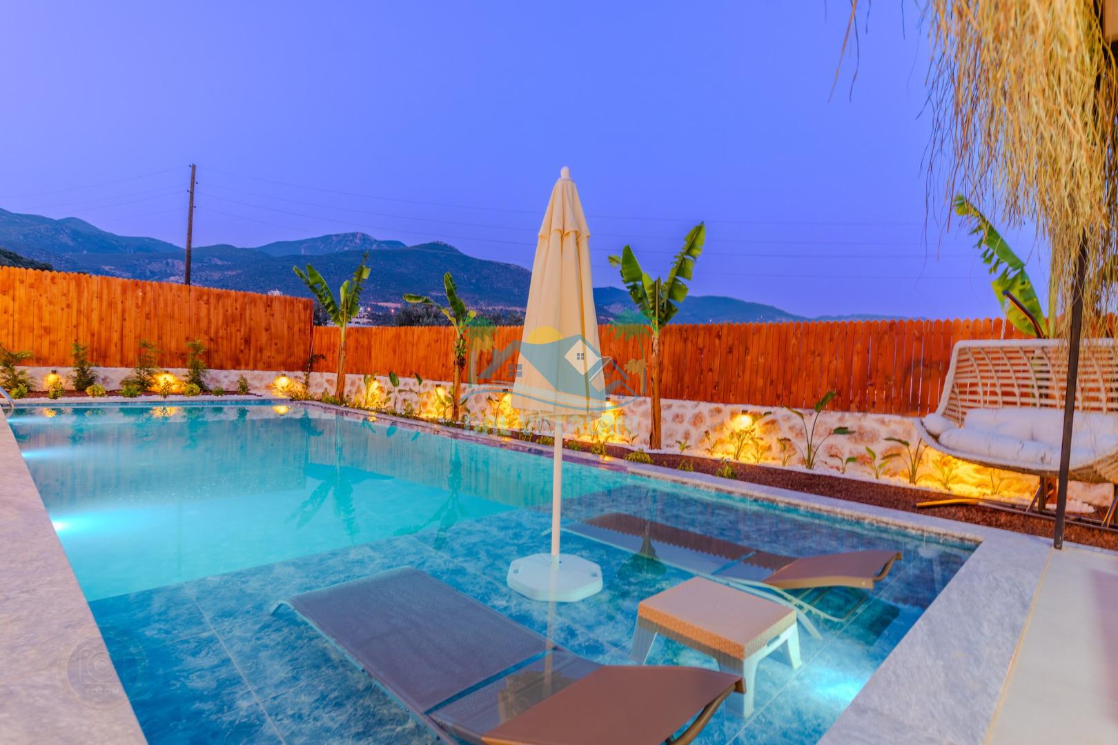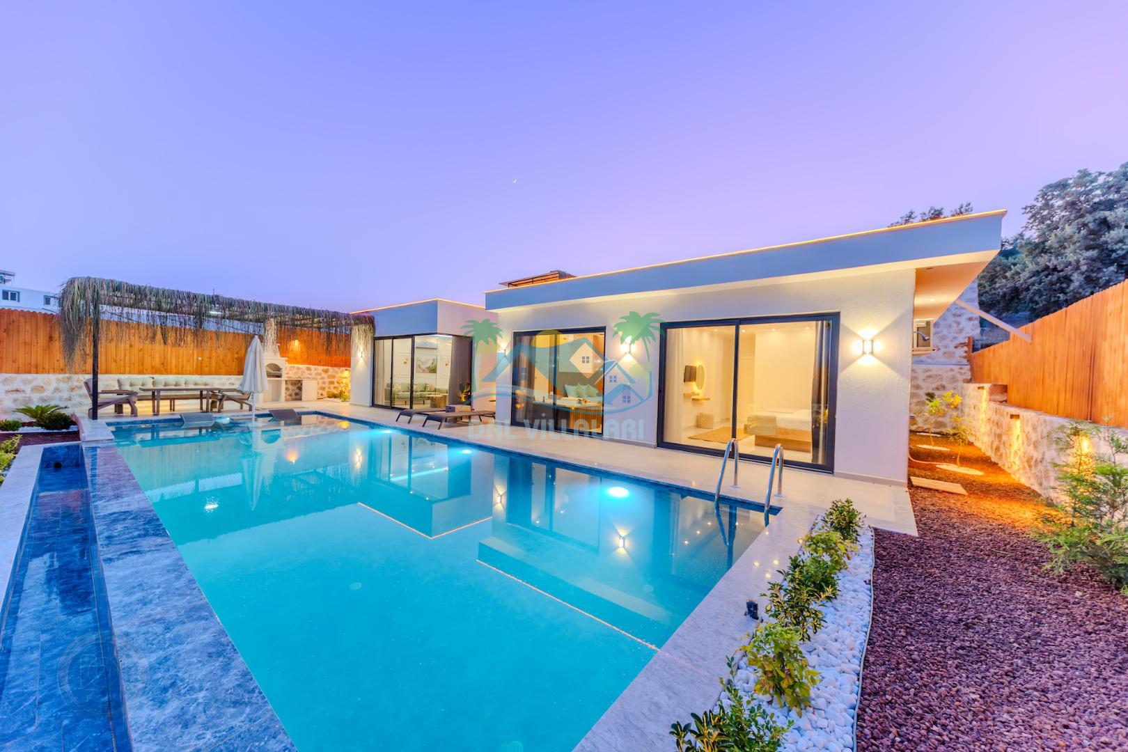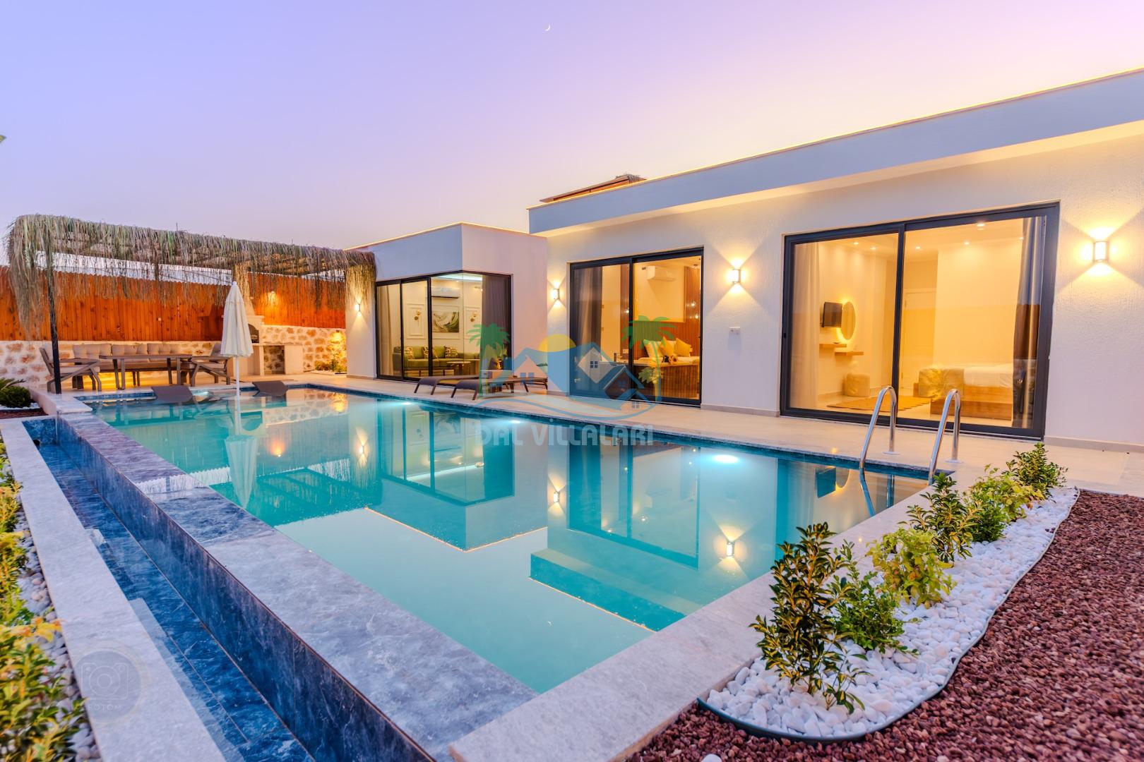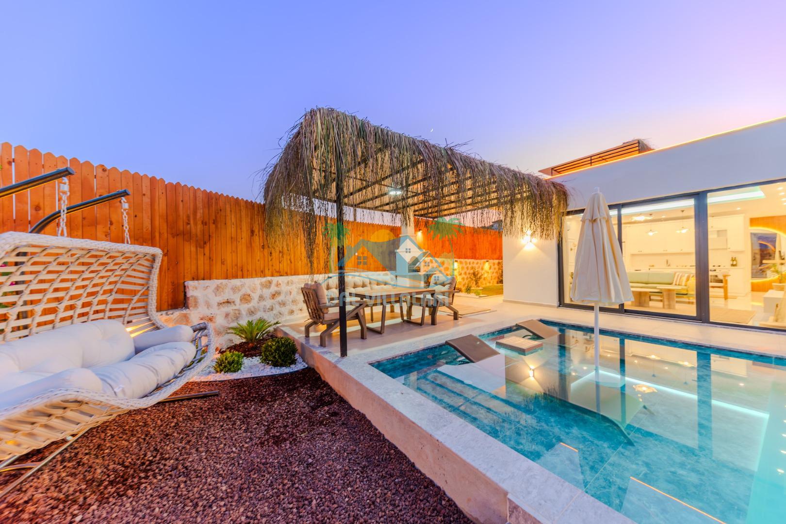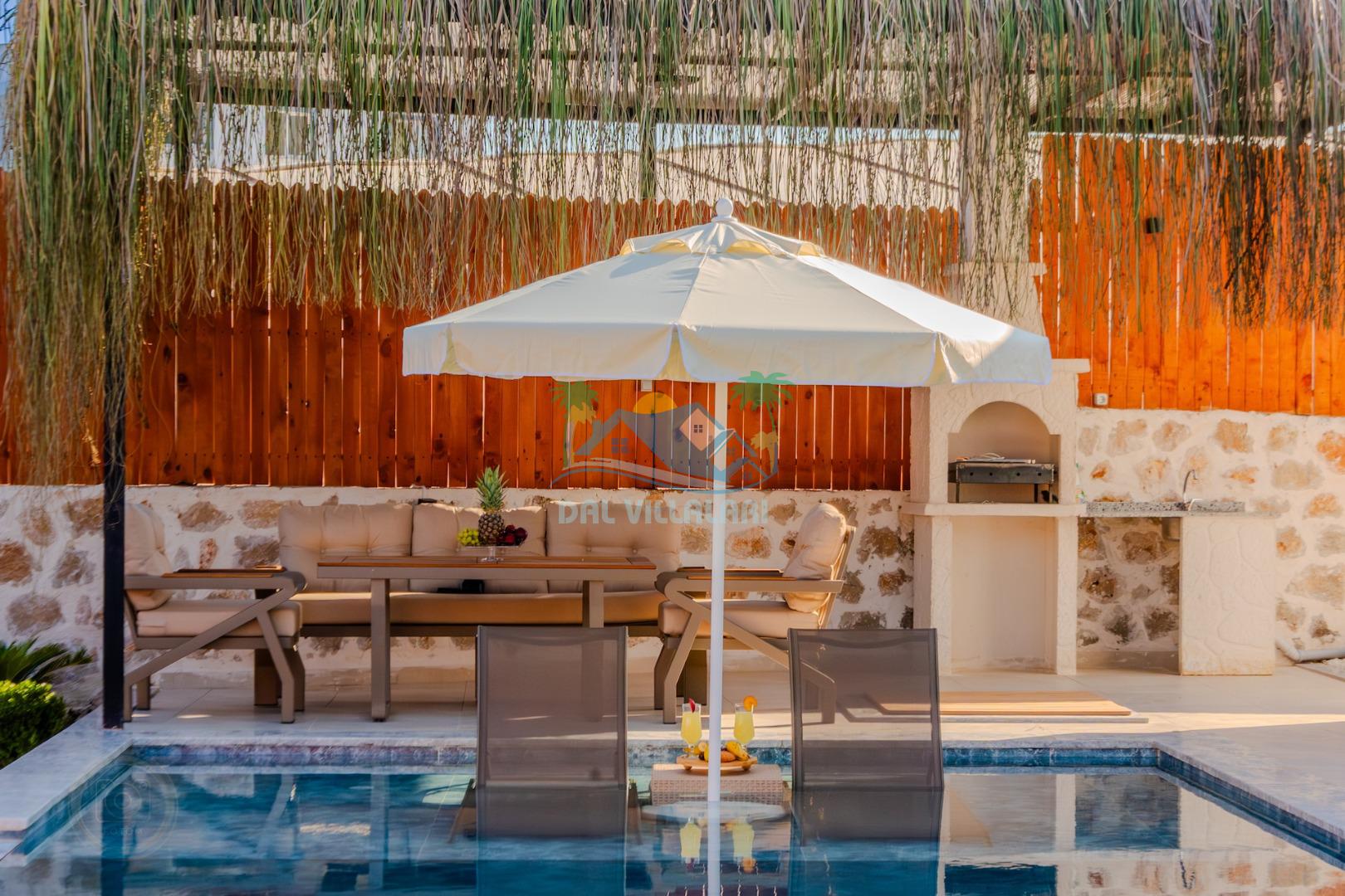 Kalkanda şehir kargaşasından uzak sakin bir konuma sahip olan villa, havuz terasında kapasiteye uygun şezlong takımı, oturma grubu, çocuk oyun ve barbekü alanı, salıncak ile keyifli bir alana sahiptir. Geniş havuz ve bahçesine açılan konforlu oturma odası ve tam donanımlı açık mutfağı bulunmaktadır.