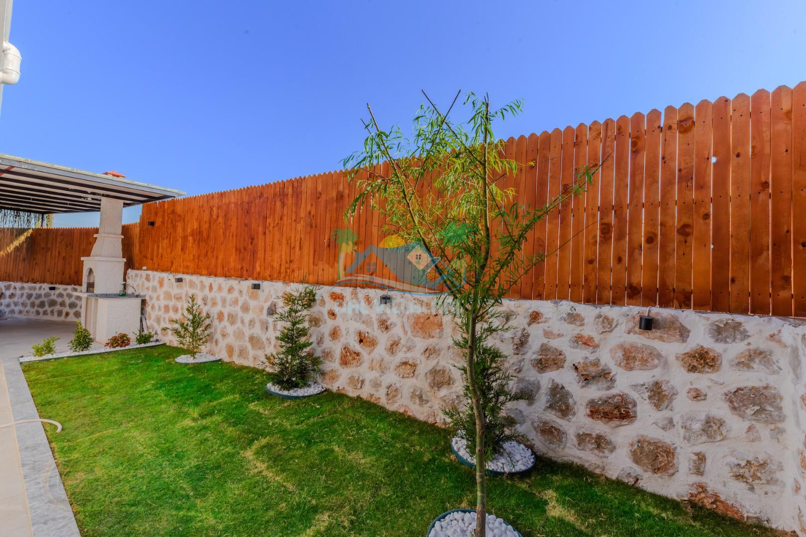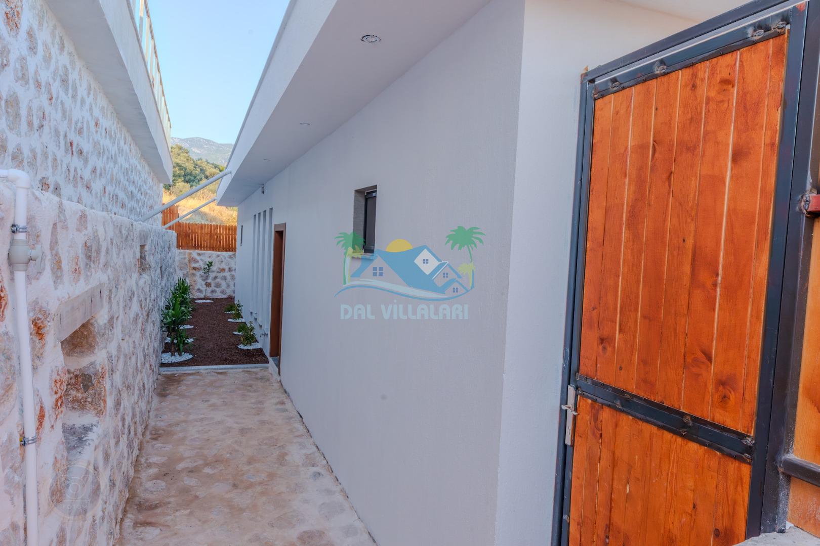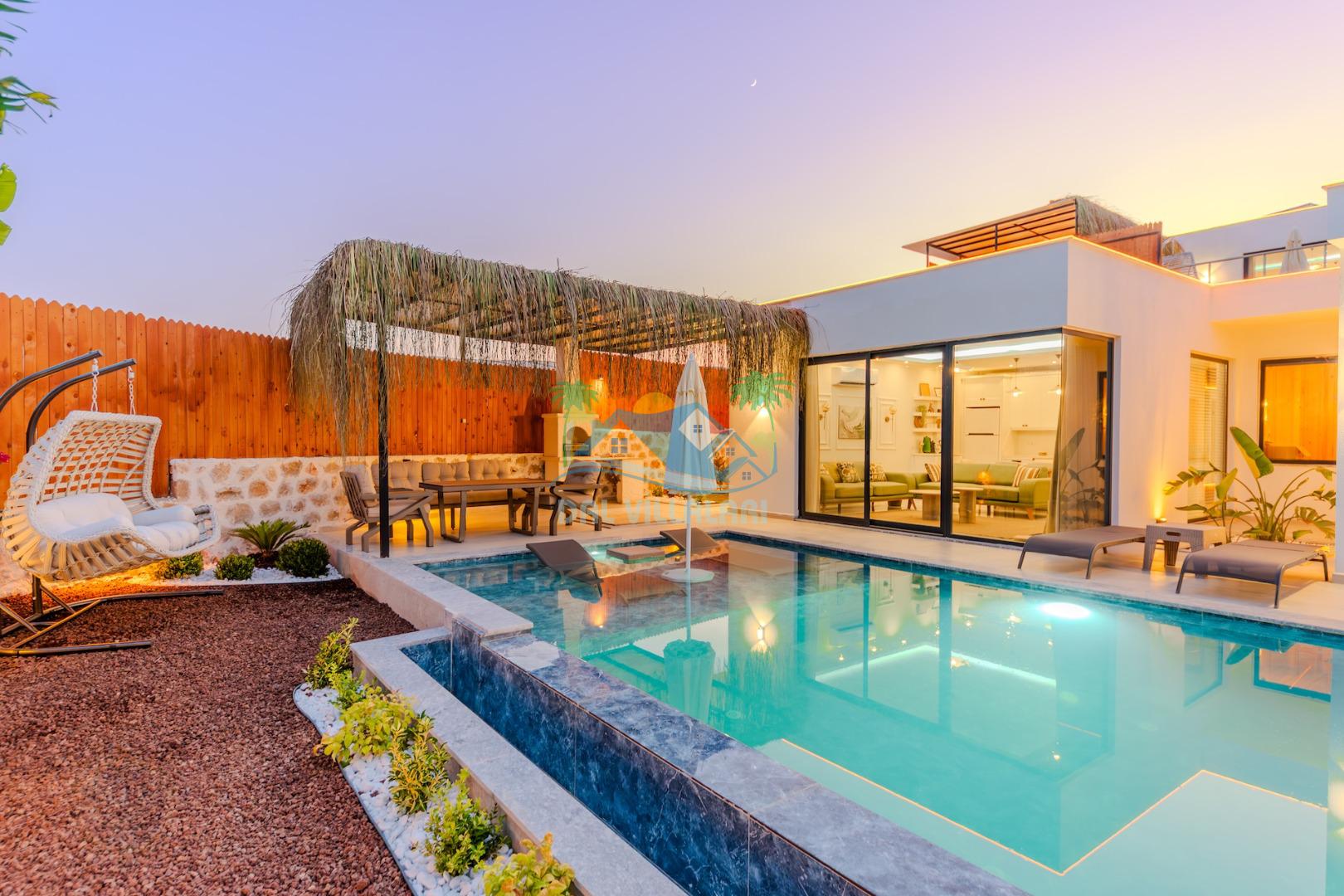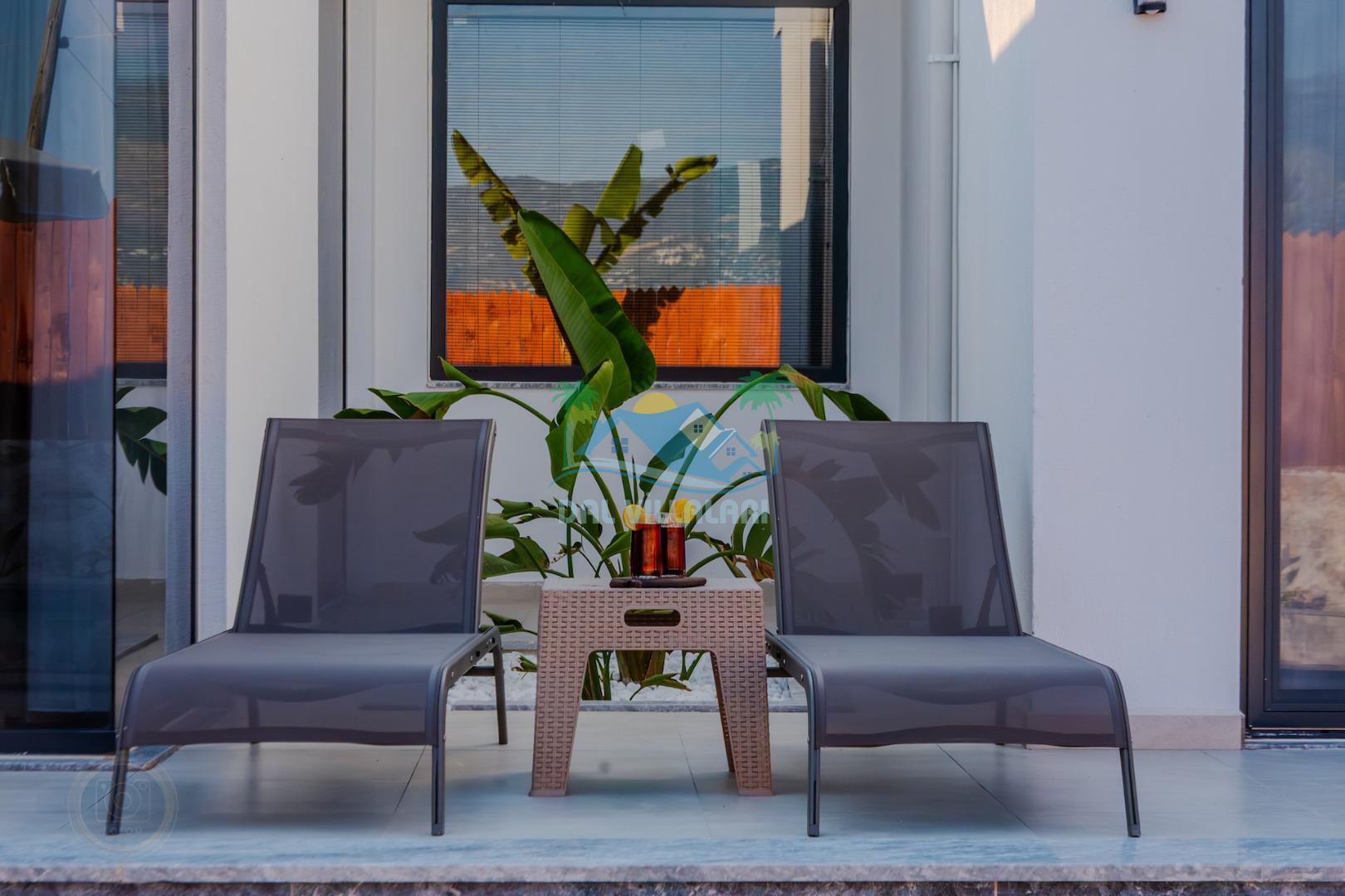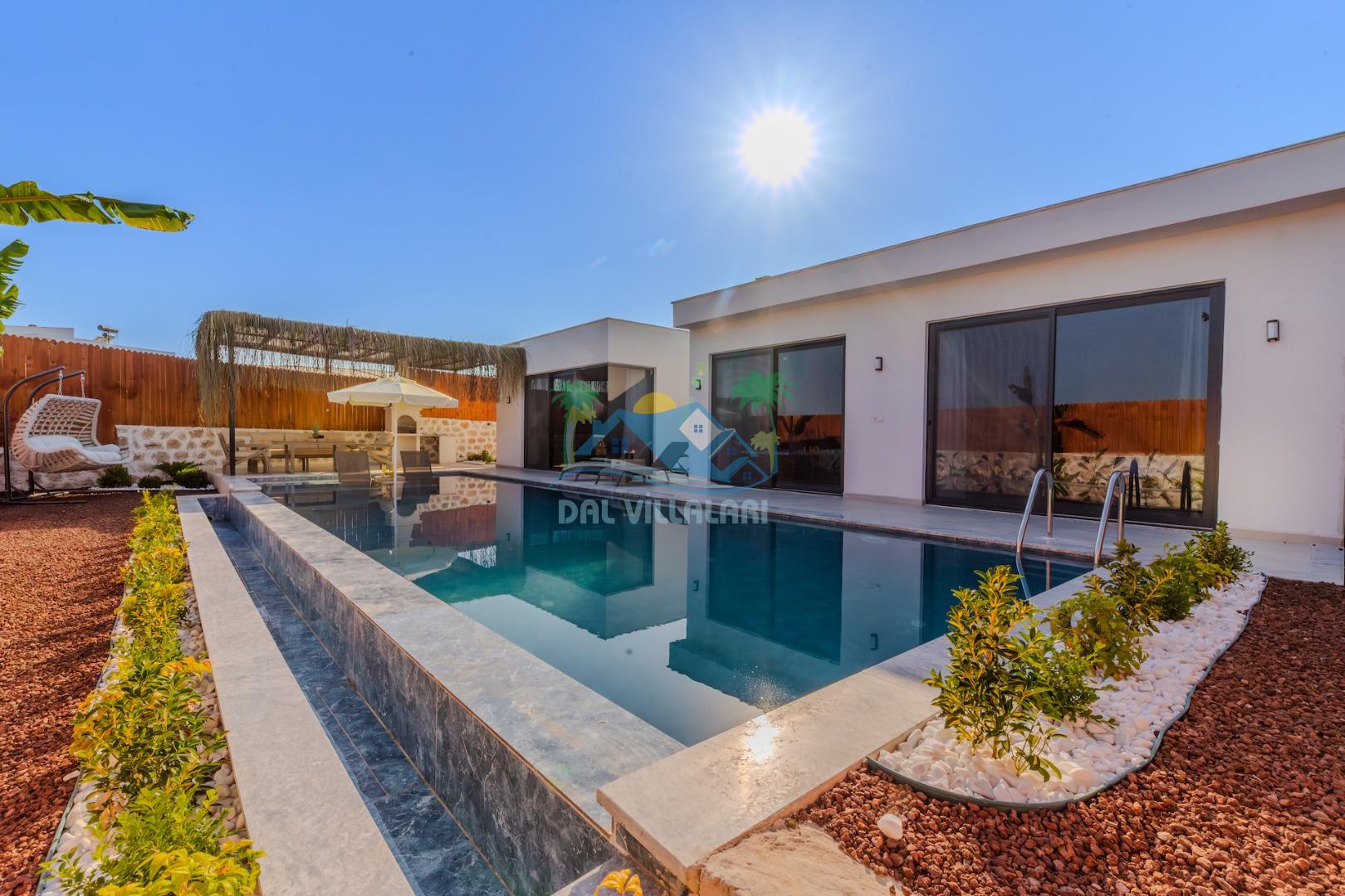 Kalkanda şehir kargaşasından uzak sakin bir konuma sahip olan villa, havuz terasında kapasiteye uygun şezlong takımı, oturma grubu, çocuk oyun ve barbekü alanı, salıncak ile keyifli bir alana sahiptir. Geniş havuz ve bahçesine açılan konforlu oturma odası ve tam donanımlı açık mutfağı bulunmaktadır.