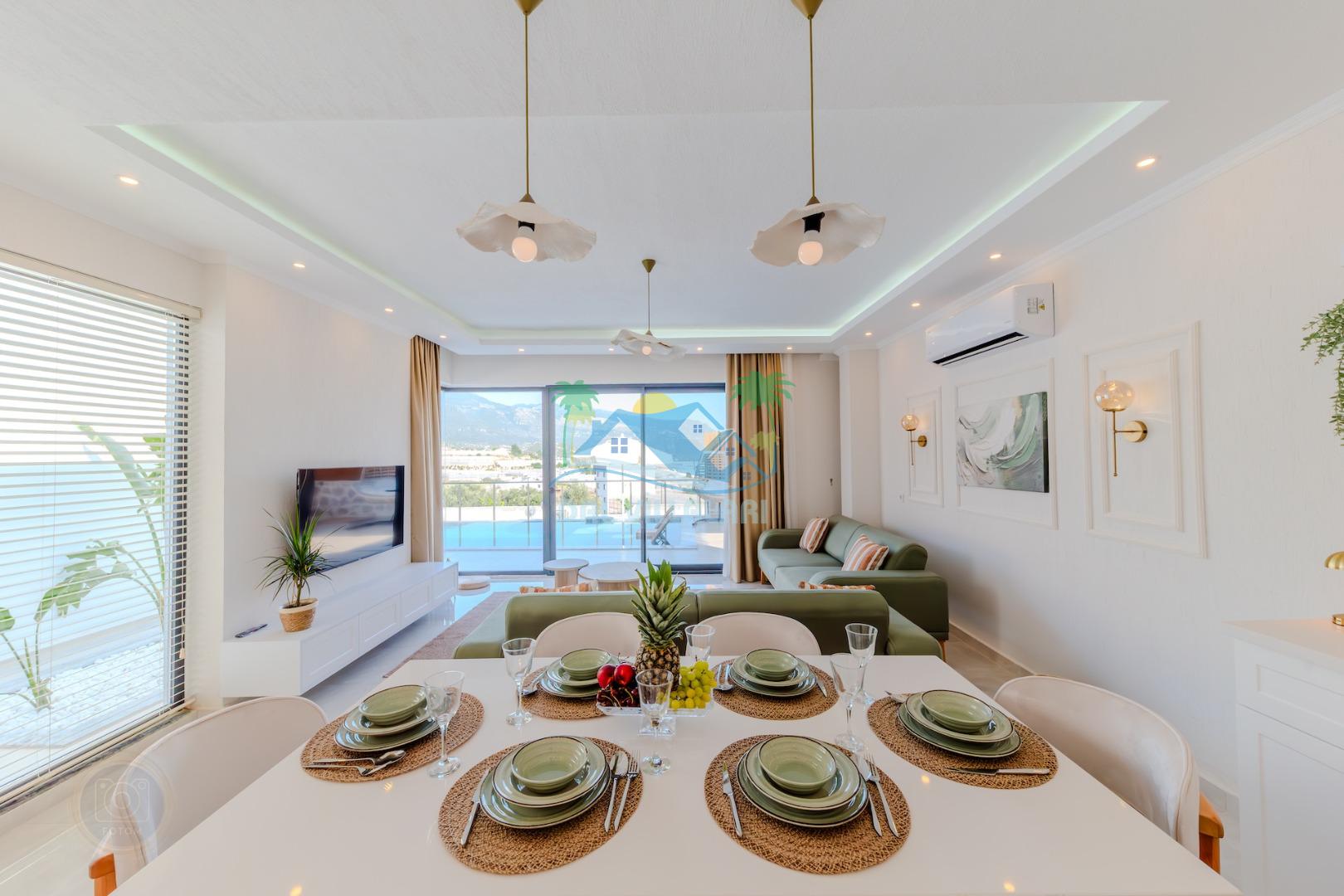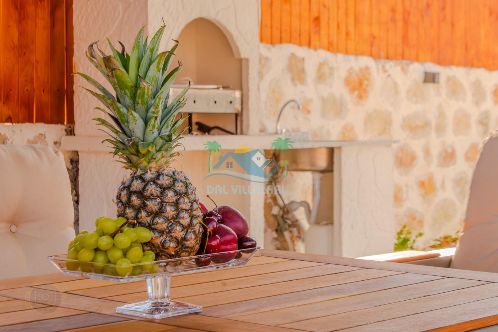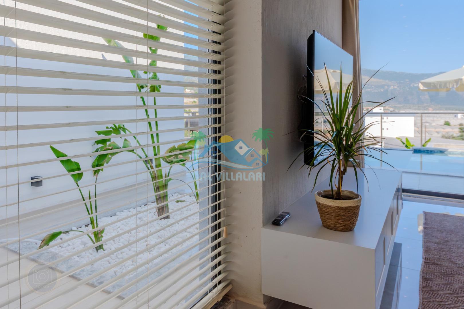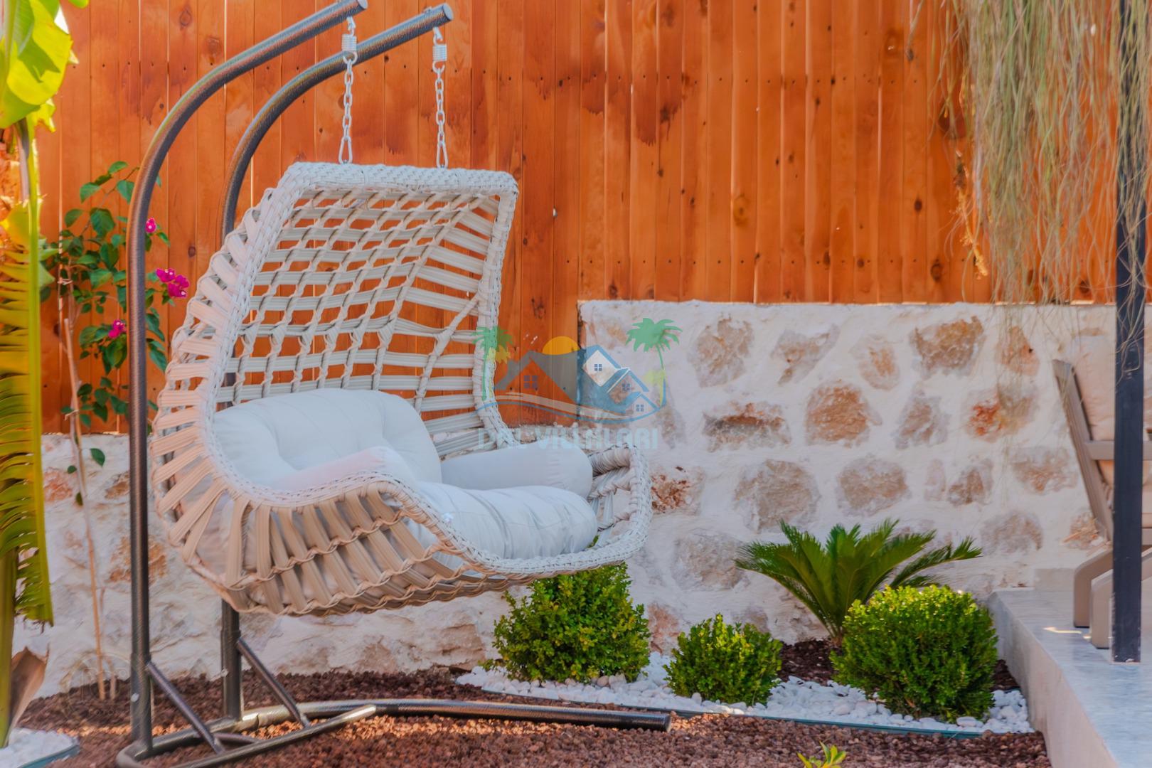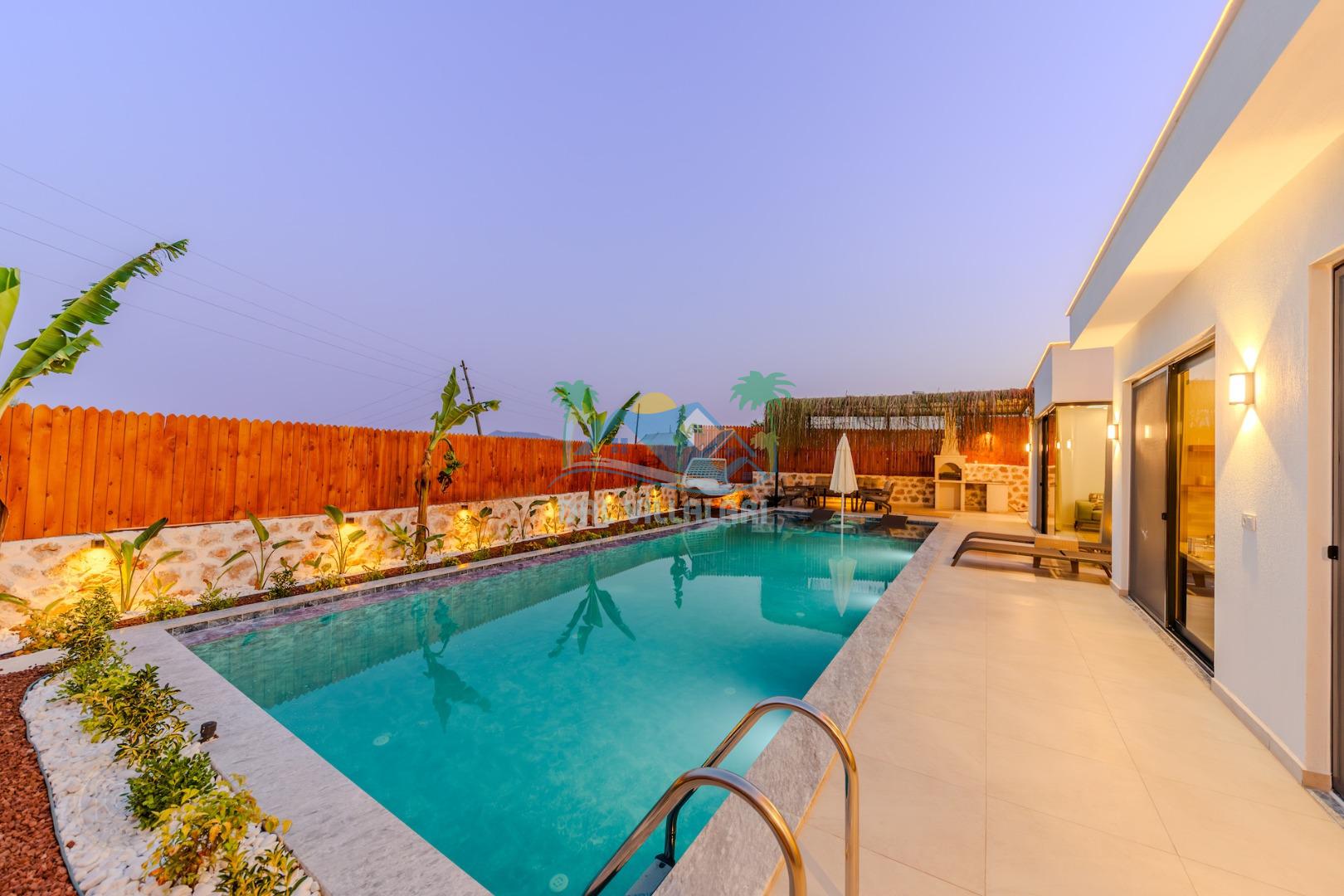 Kalkanda şehir kargaşasından uzak sakin bir konuma sahip olan villa, havuz terasında kapasiteye uygun şezlong takımı, oturma grubu, çocuk oyun ve barbekü alanı, salıncak ile keyifli bir alana sahiptir. Geniş havuz ve bahçesine açılan konforlu oturma odası ve tam donanımlı açık mutfağı bulunmaktadır.