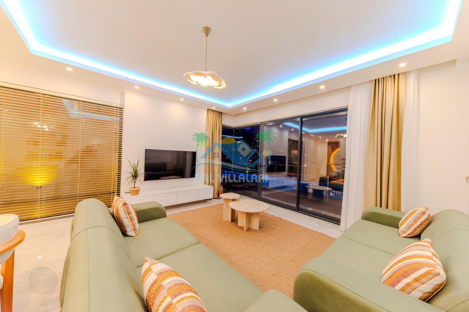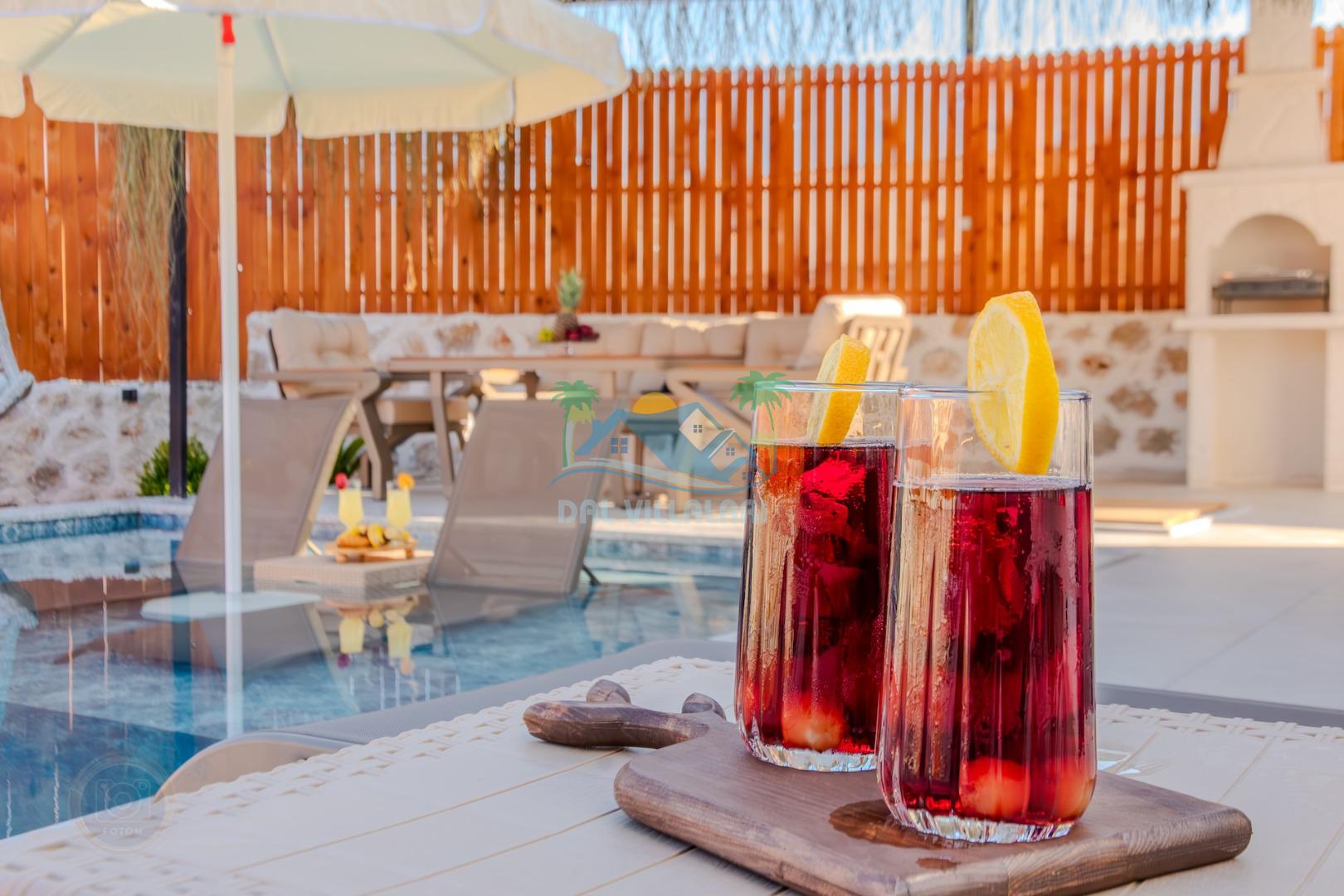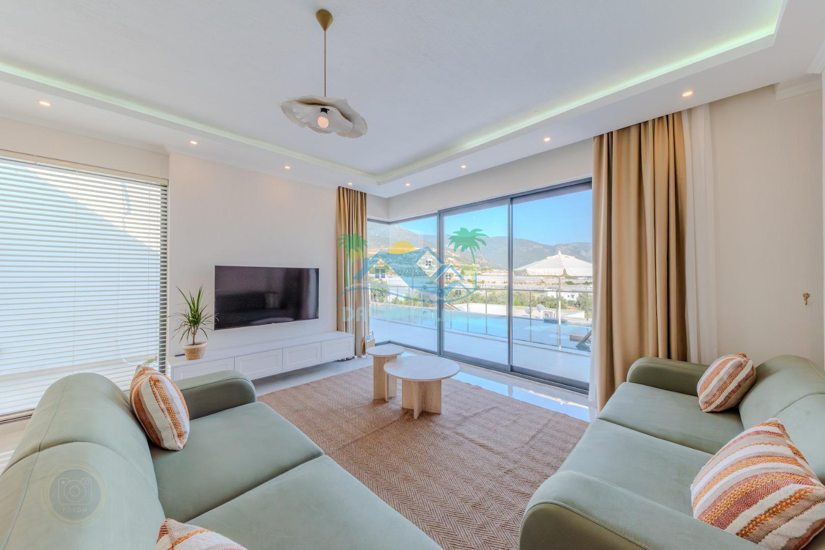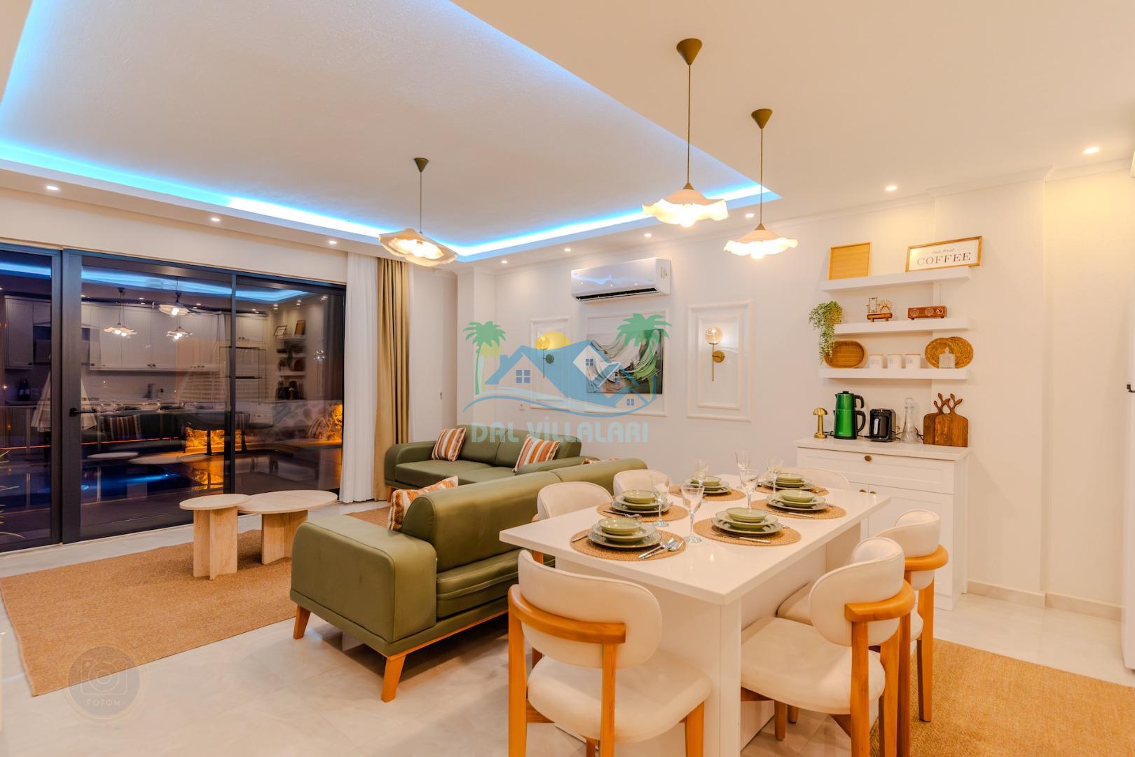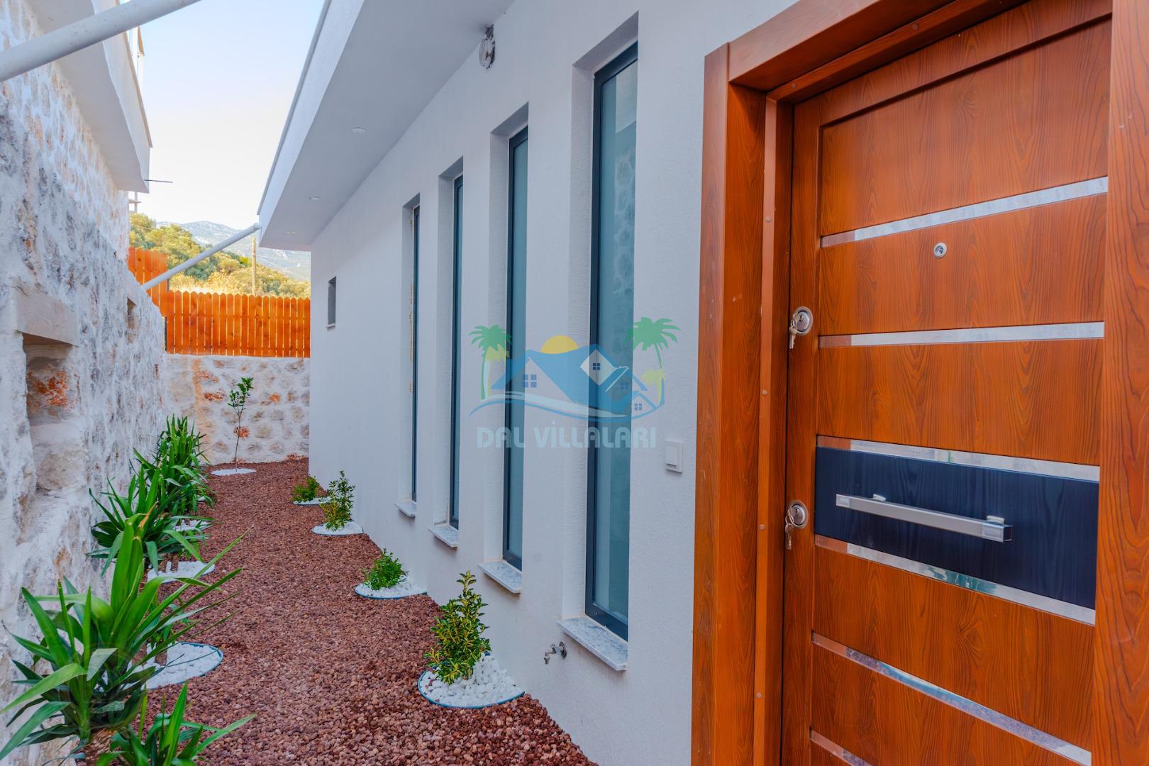 Kalkanda şehir kargaşasından uzak sakin bir konuma sahip olan villa, havuz terasında kapasiteye uygun şezlong takımı, oturma grubu, çocuk oyun ve barbekü alanı, salıncak ile keyifli bir alana sahiptir. Geniş havuz ve bahçesine açılan konforlu oturma odası ve tam donanımlı açık mutfağı bulunmaktadır.