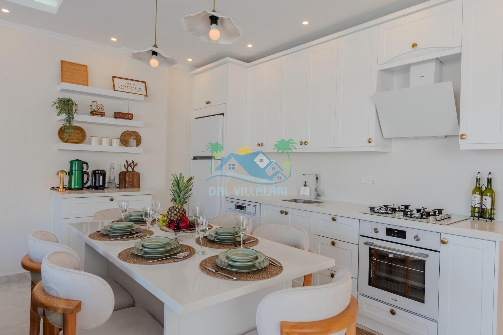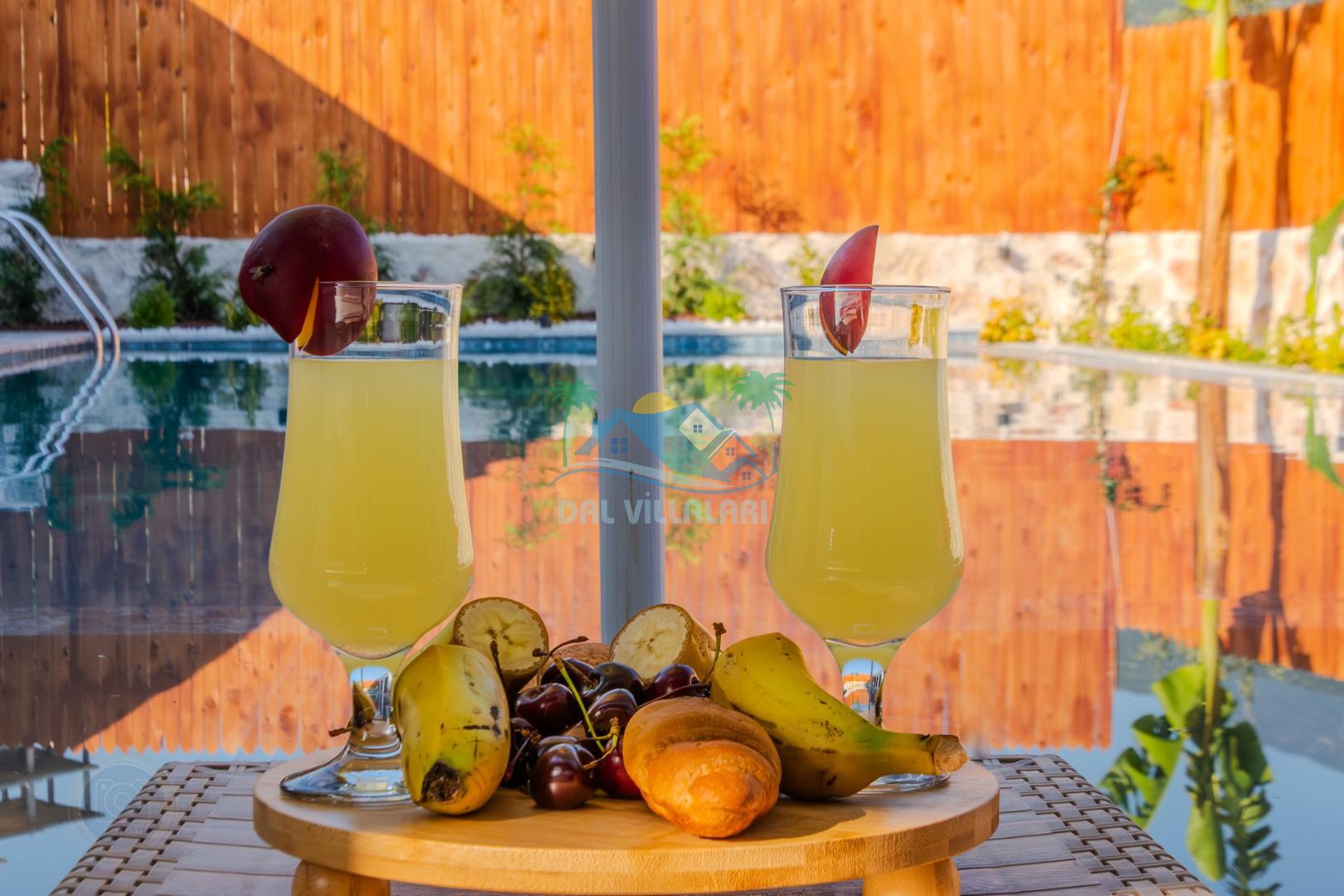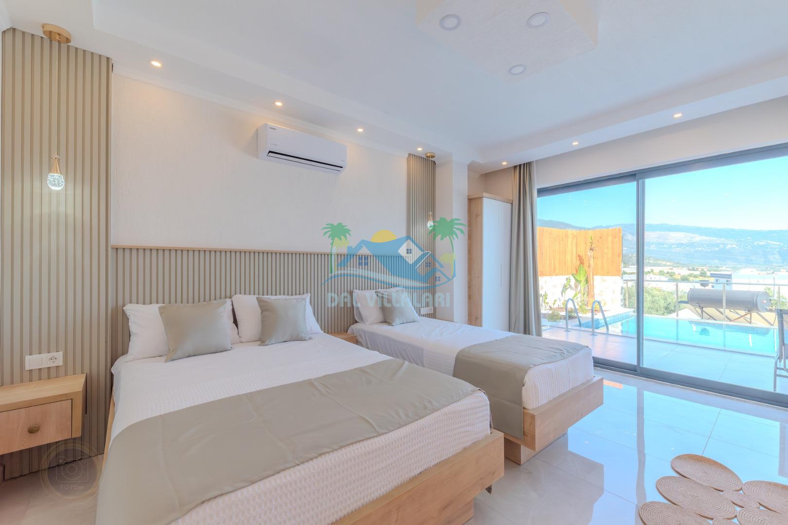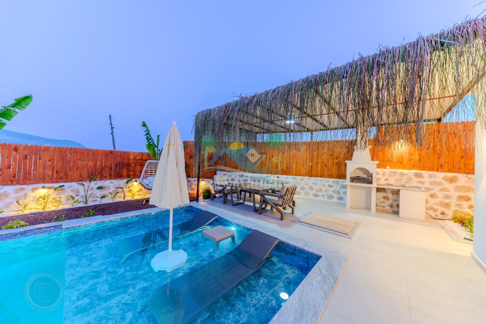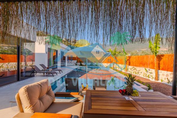Kalkanda şehir kargaşasından uzak sakin bir konuma sahip olan villa, havuz terasında kapasiteye uygun şezlong takımı, oturma grubu, çocuk oyun ve barbekü alanı, salıncak ile keyifli bir alana sahiptir. Geniş havuz ve bahçesine açılan konforlu oturma odası ve tam donanımlı açık mutfağı bulunmaktadır.
