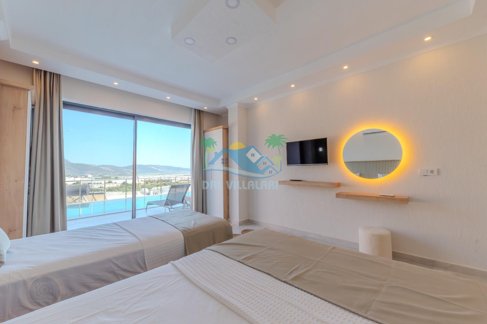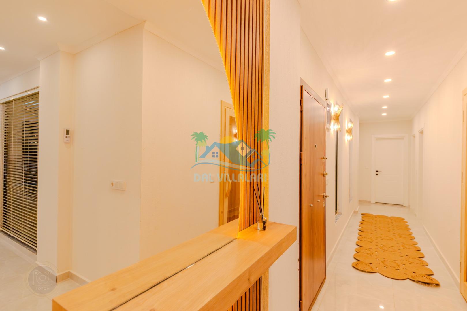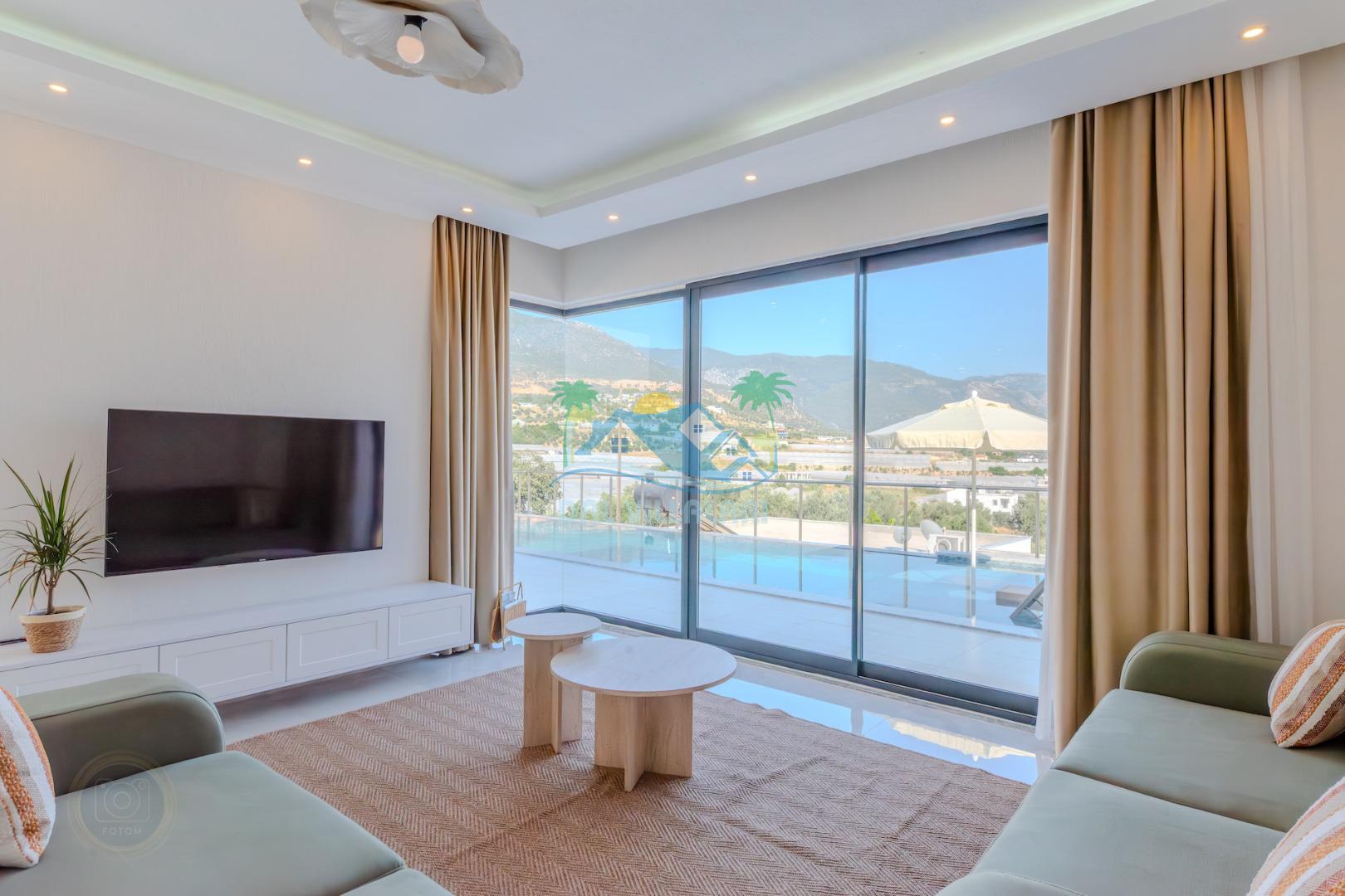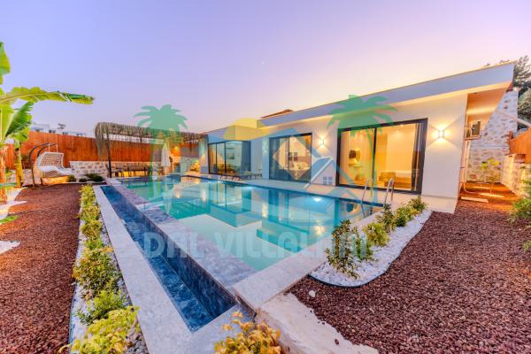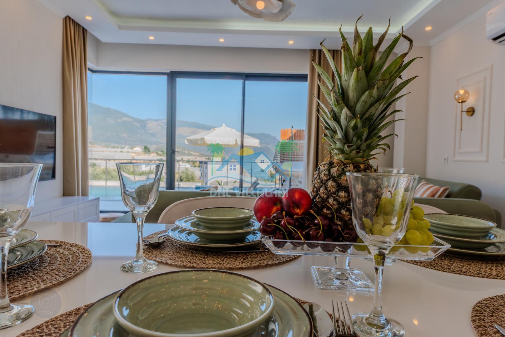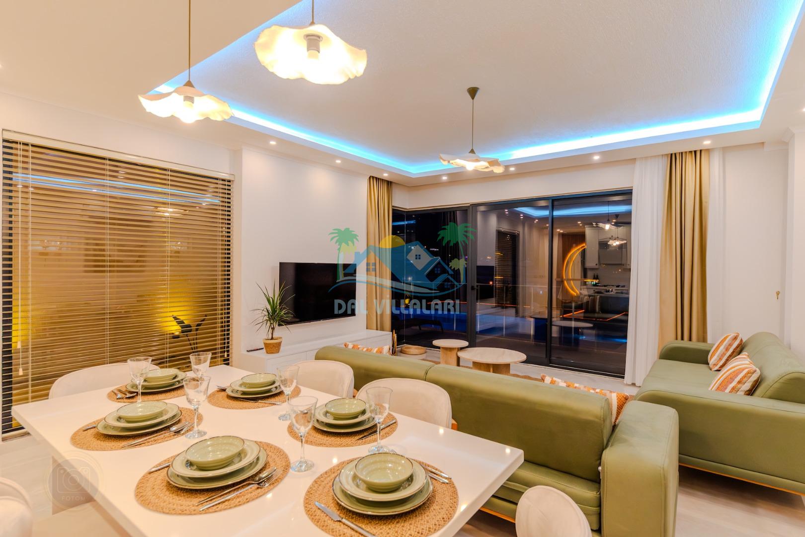 Kalkanda şehir kargaşasından uzak sakin bir konuma sahip olan villa, havuz terasında kapasiteye uygun şezlong takımı, oturma grubu, çocuk oyun ve barbekü alanı, salıncak ile keyifli bir alana sahiptir. Geniş havuz ve bahçesine açılan konforlu oturma odası ve tam donanımlı açık mutfağı bulunmaktadır.