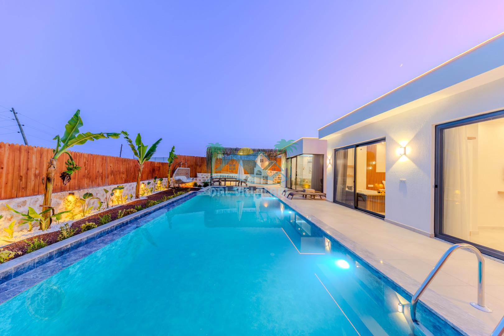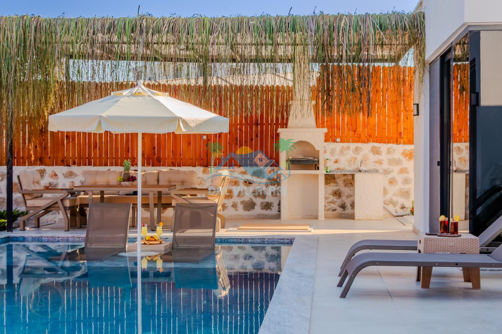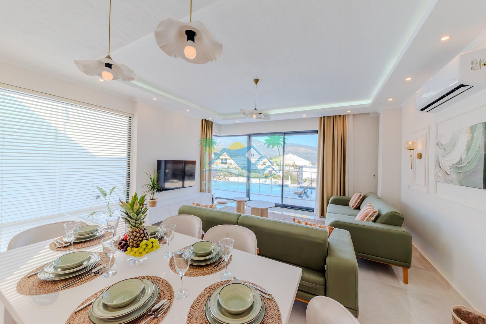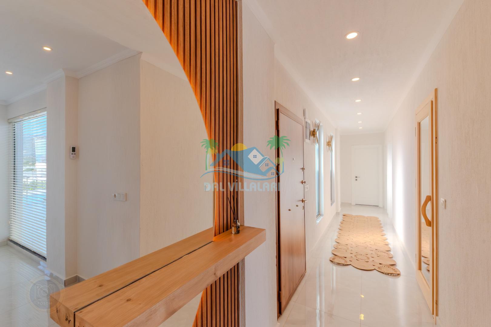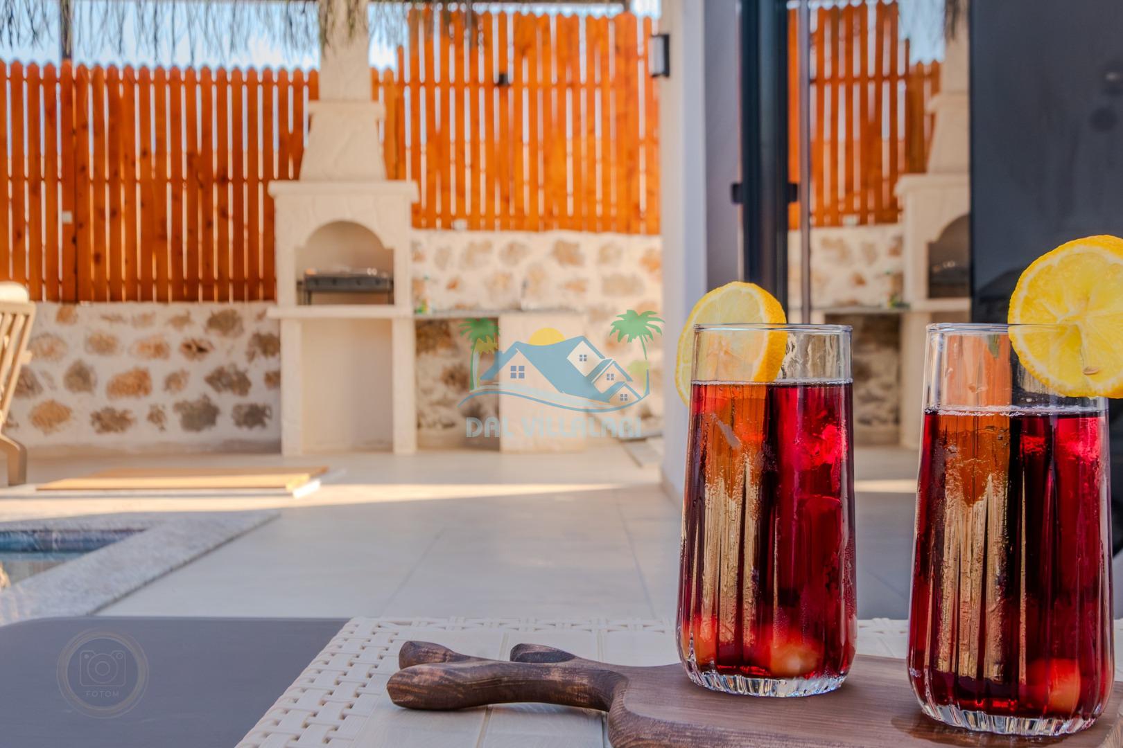 Kalkanda şehir kargaşasından uzak sakin bir konuma sahip olan villa, havuz terasında kapasiteye uygun şezlong takımı, oturma grubu, çocuk oyun ve barbekü alanı, salıncak ile keyifli bir alana sahiptir. Geniş havuz ve bahçesine açılan konforlu oturma odası ve tam donanımlı açık mutfağı bulunmaktadır.
