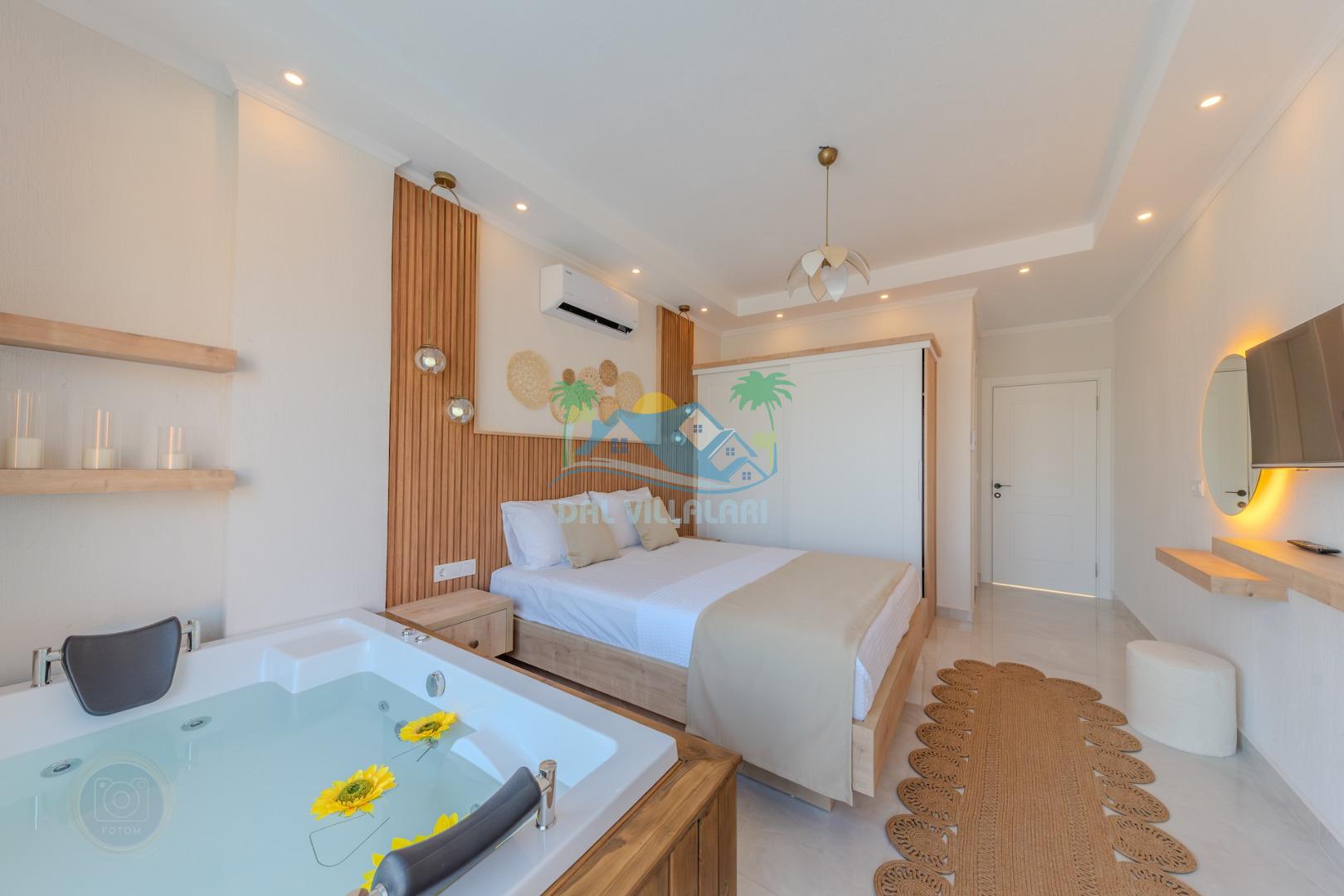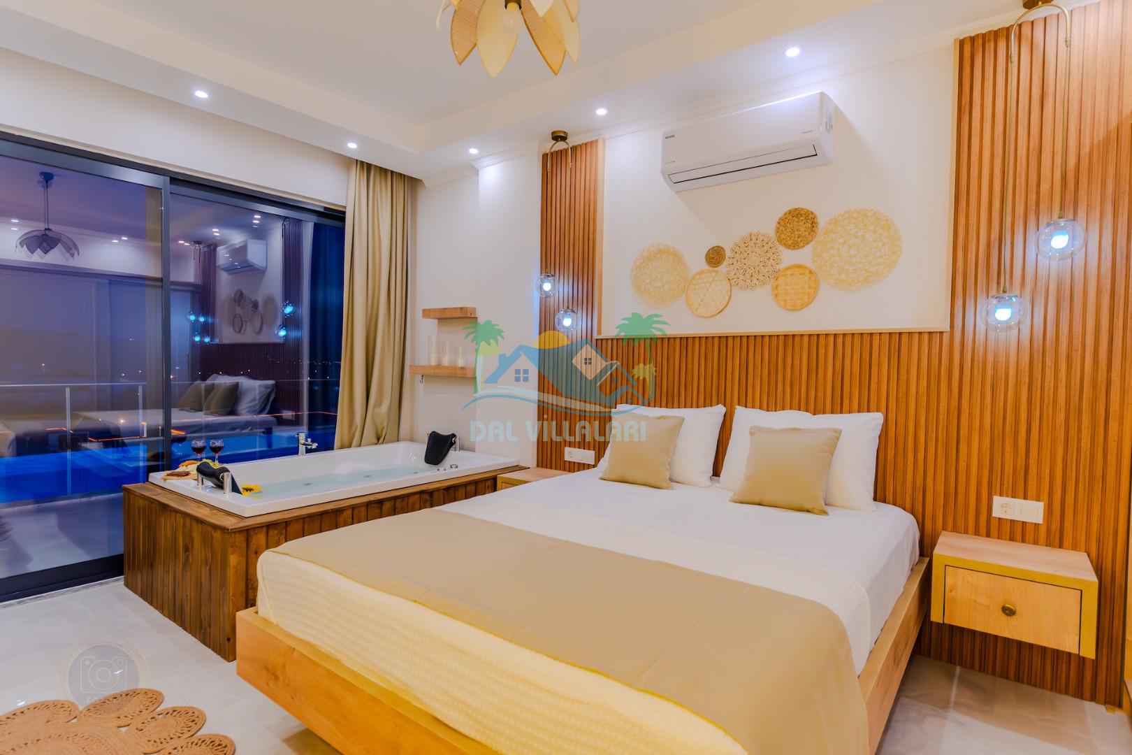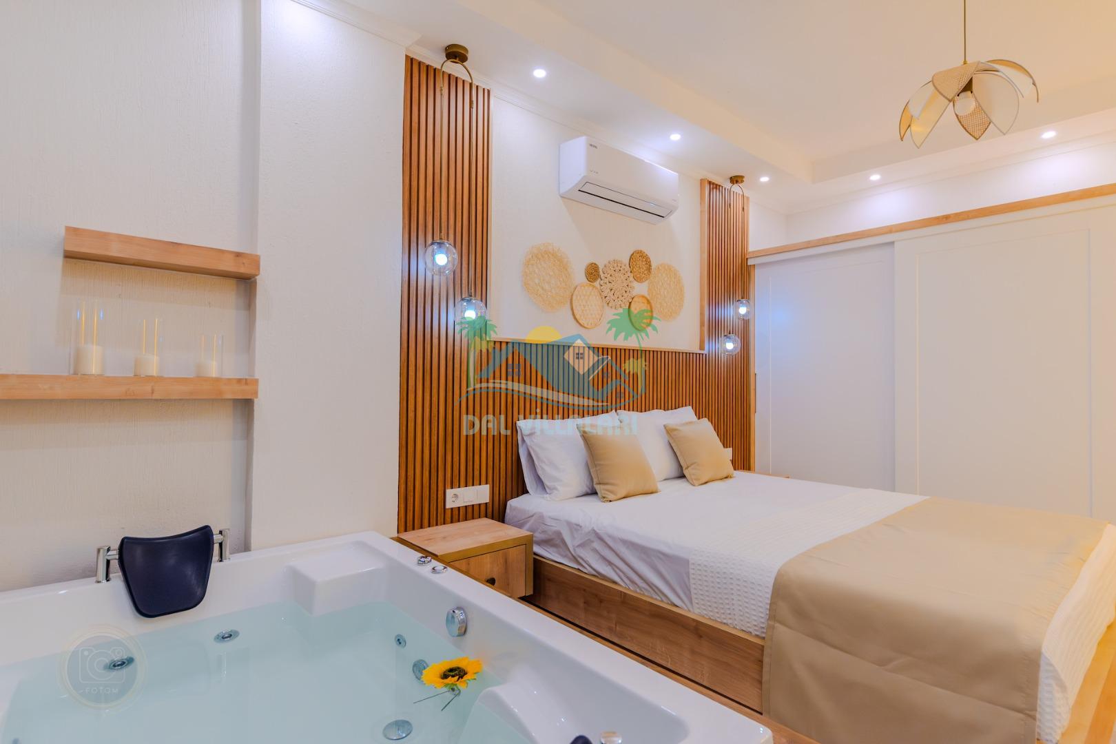 Birinci yatak odasında çift kişilik yatak, jakuzi ve ebeveyn banyosu;