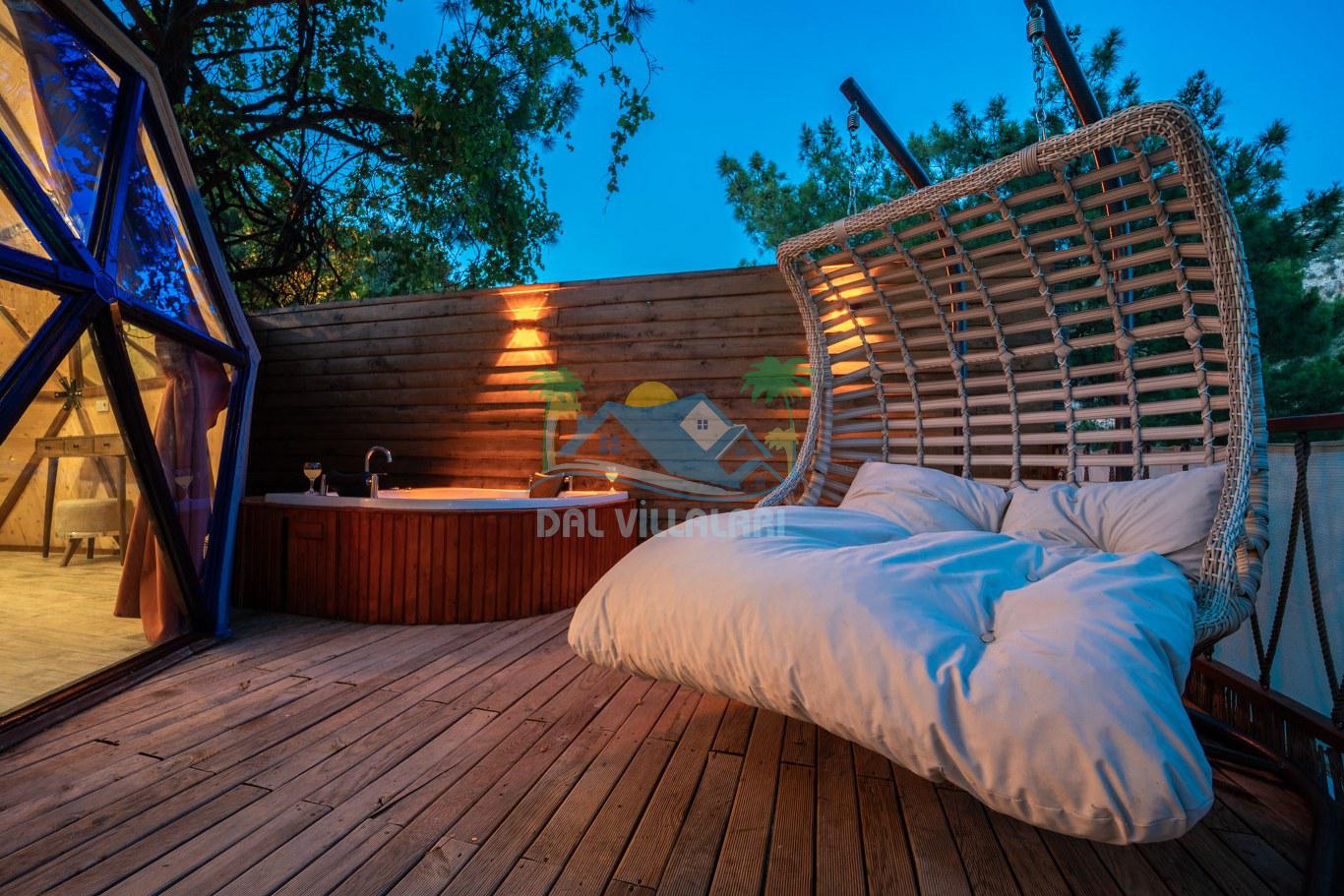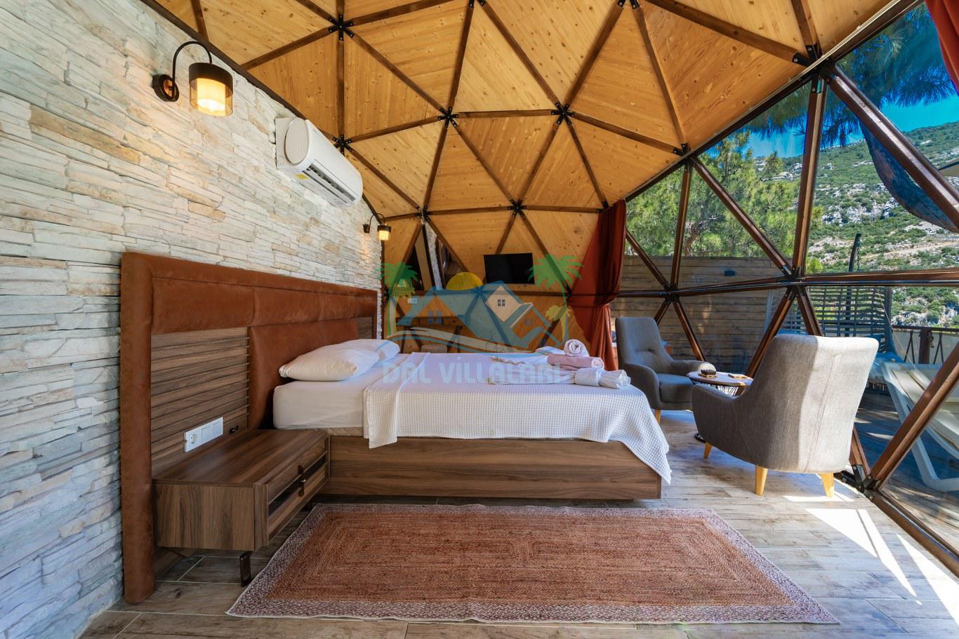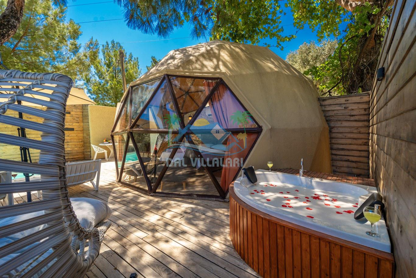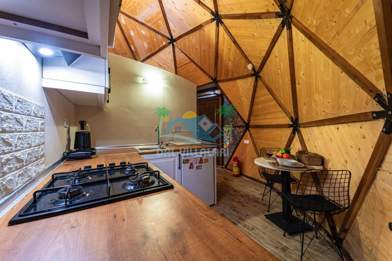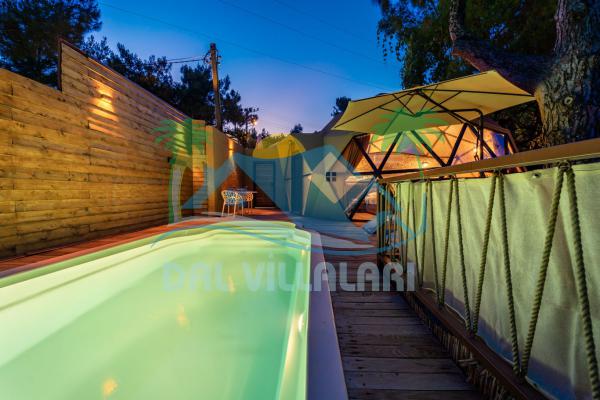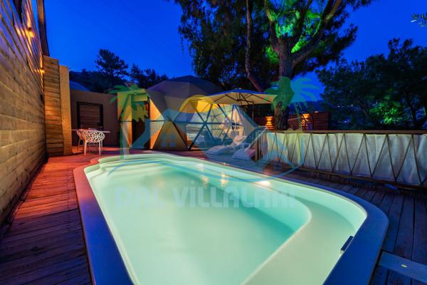 Her biri ayrı havuz terasına sahip olan kubbe tipi villalarımız, glamping kültüründen esinlenen çadır konseptlerine kıyasla Türkiye'de ilk defa 7 metre çapında, 4.30 metre kubbe yüksekliğinde, 38 metrekarelik AHŞAP yapıda üretilmiştir. Binalarımız, güvenlik ve iklim endişeleri olmaksızın konforlu bir konaklama sunar.