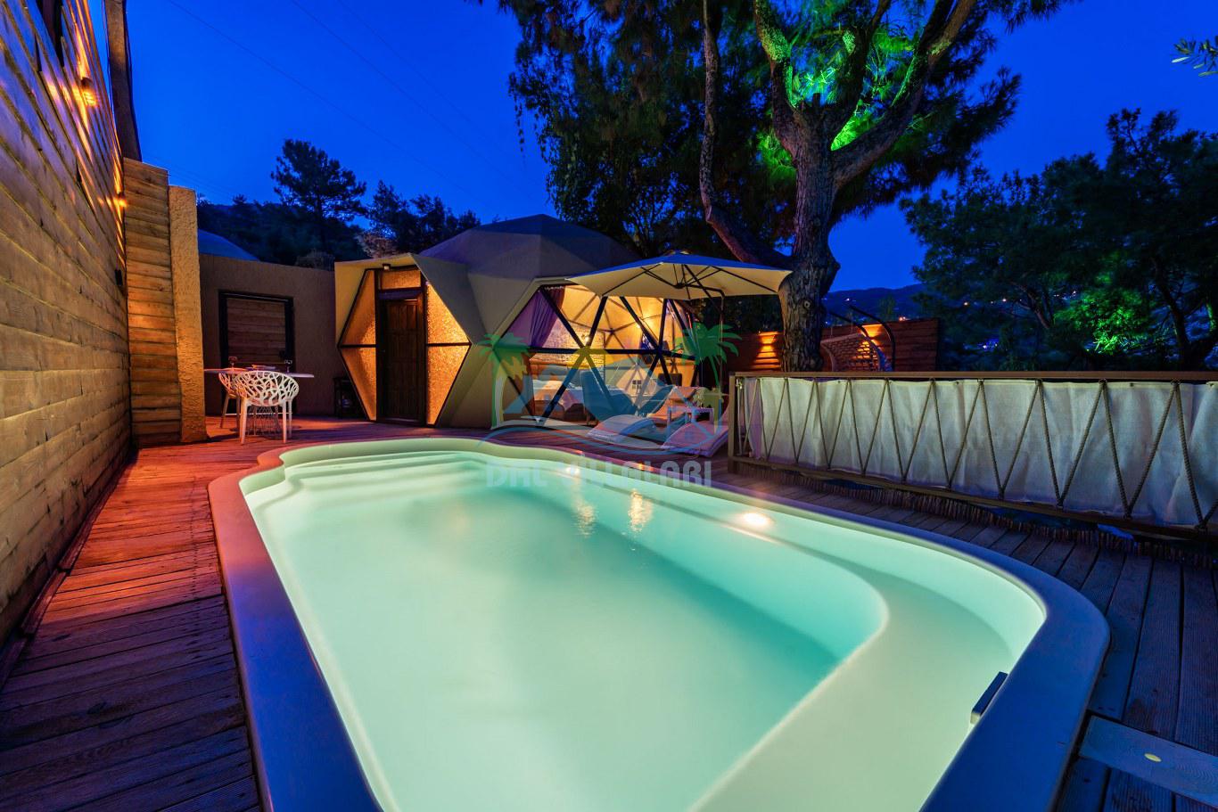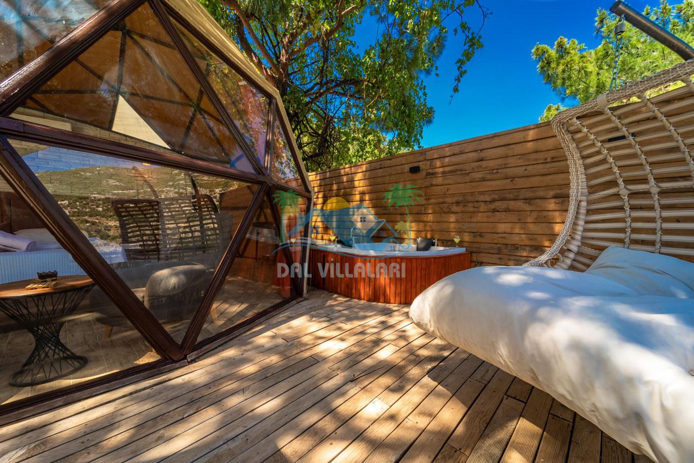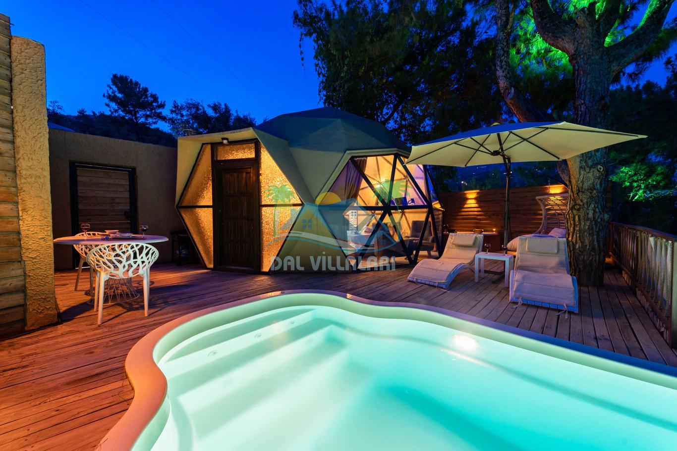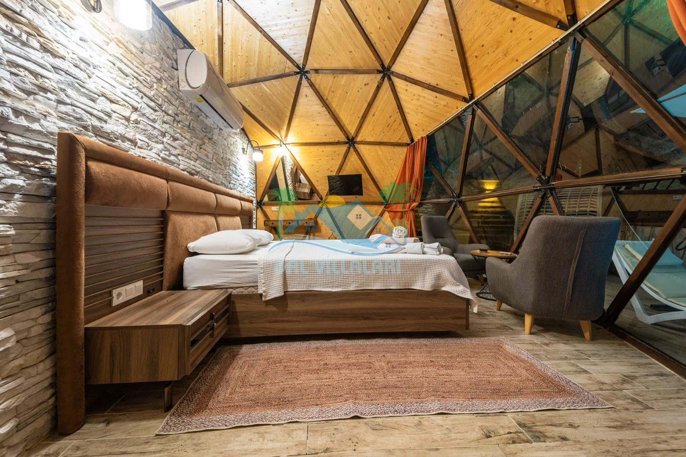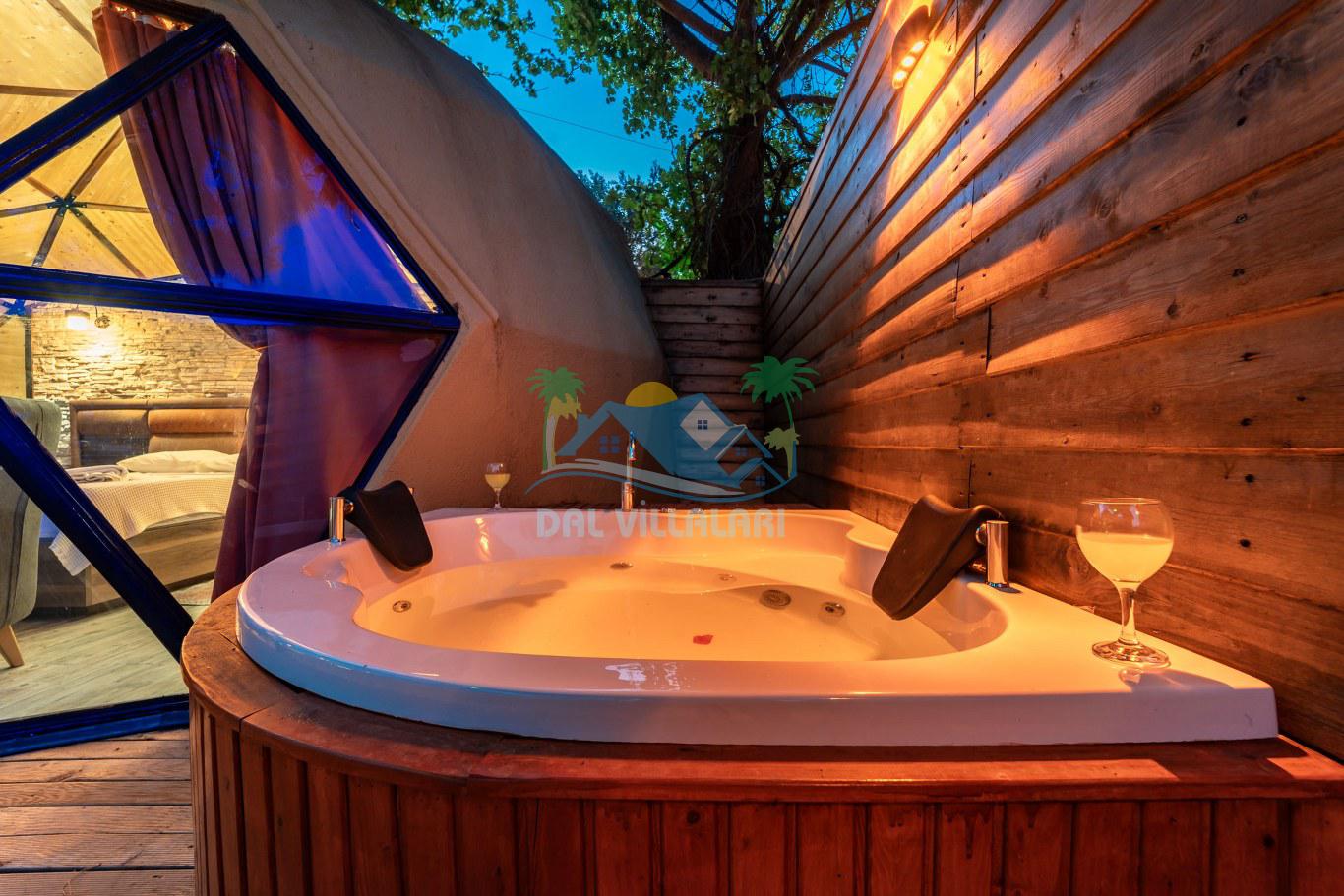 Her biri ayrı havuz terasına sahip olan kubbe tipi villalarımız, glamping kültüründen esinlenen çadır konseptlerine kıyasla Türkiye'de ilk defa 7 metre çapında, 4.30 metre kubbe yüksekliğinde, 38 metrekarelik AHŞAP yapıda üretilmiştir. Binalarımız, güvenlik ve iklim endişeleri olmaksızın konforlu bir konaklama sunar.