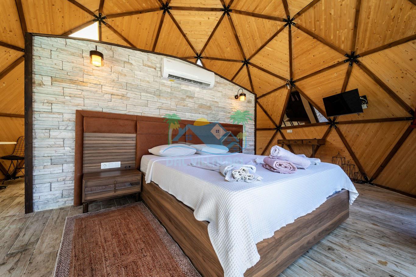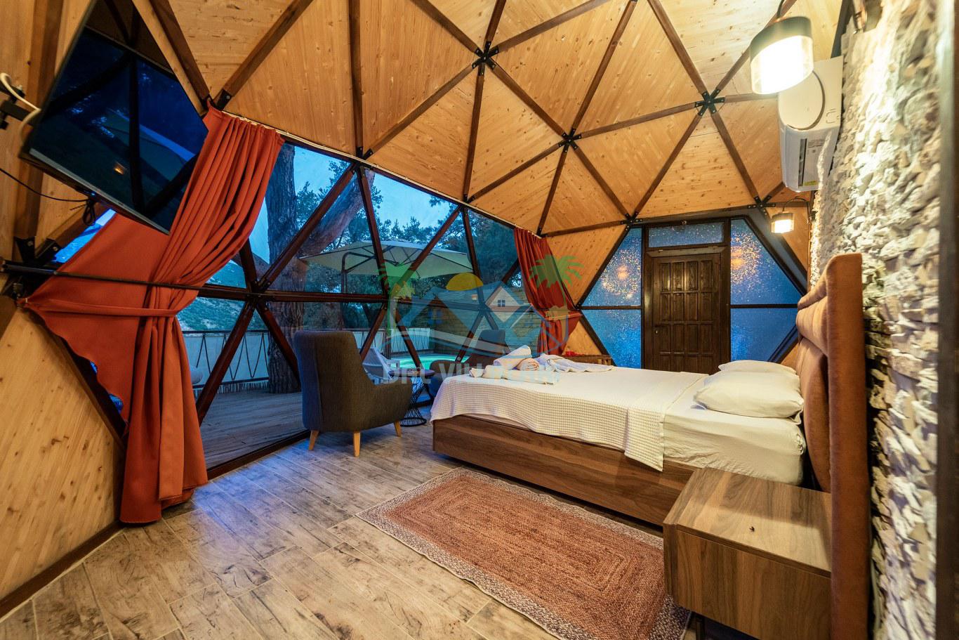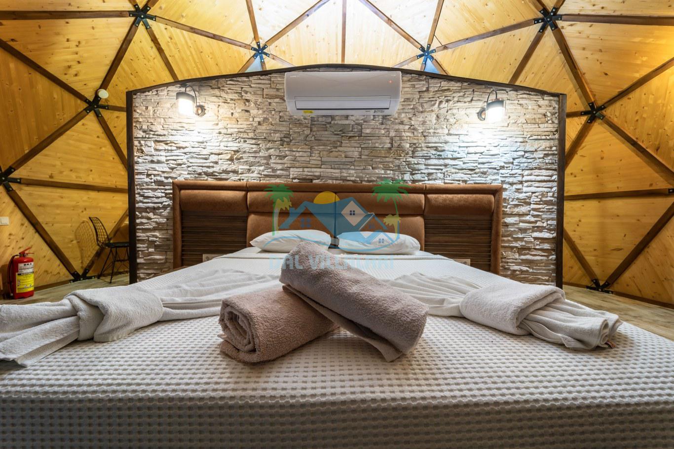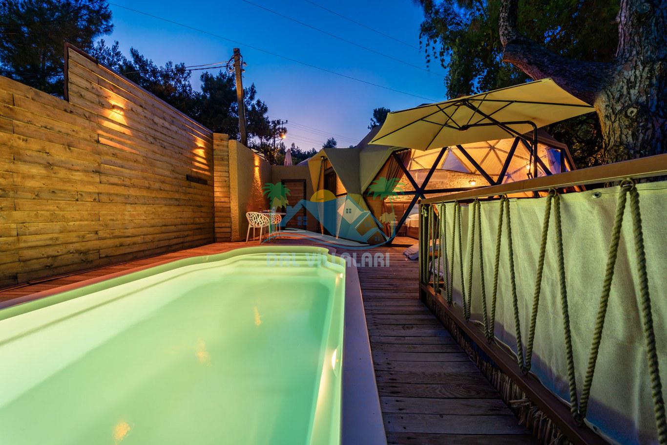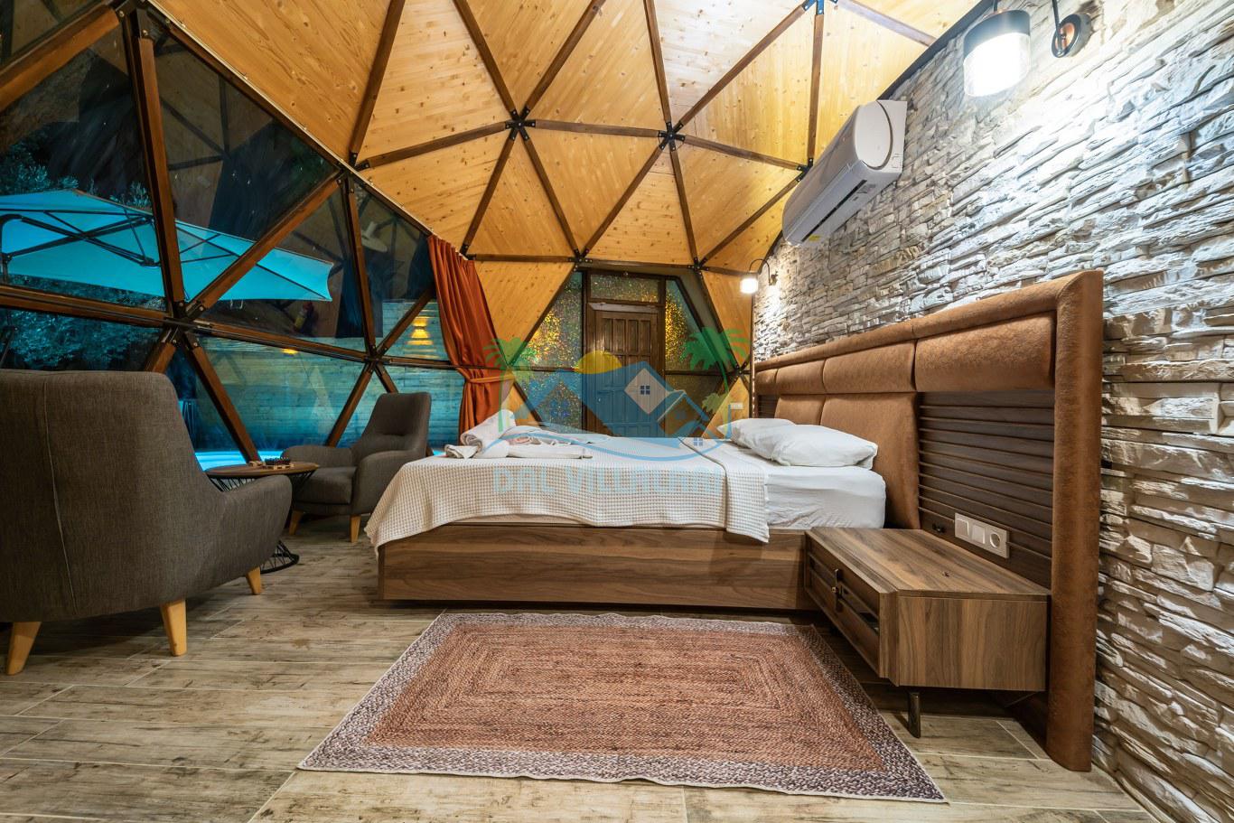 Her biri ayrı havuz terasına sahip olan kubbe tipi villalarımız, glamping kültüründen esinlenen çadır konseptlerine kıyasla Türkiye'de ilk defa 7 metre çapında, 4.30 metre kubbe yüksekliğinde, 38 metrekarelik AHŞAP yapıda üretilmiştir. Binalarımız, güvenlik ve iklim endişeleri olmaksızın konforlu bir konaklama sunar.