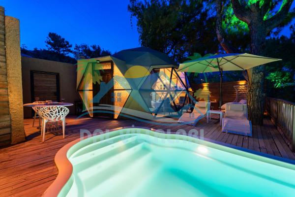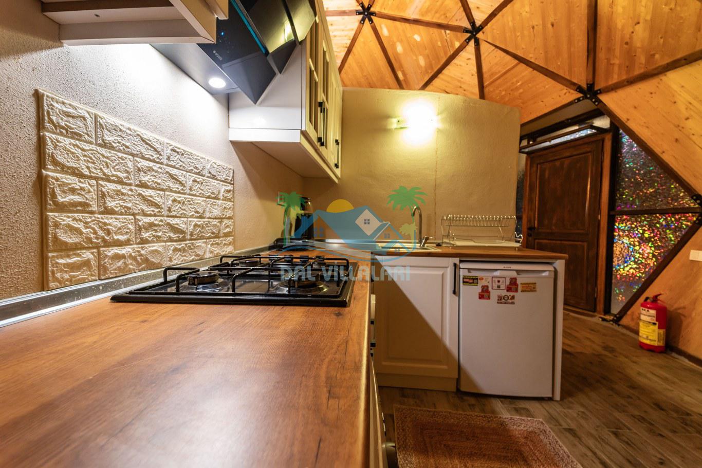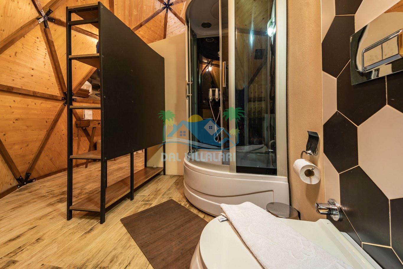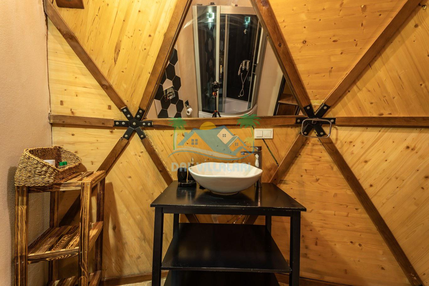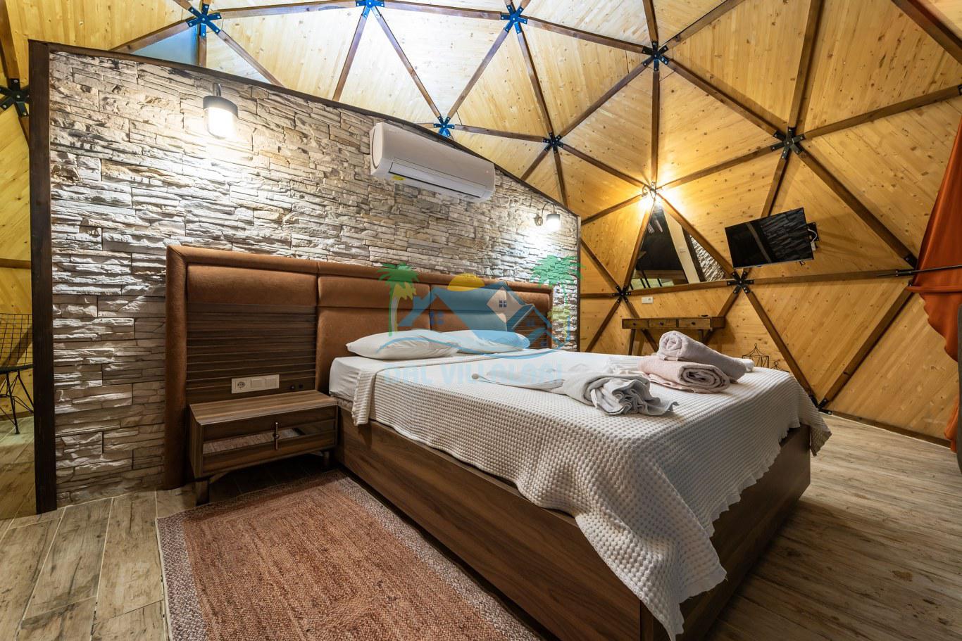 Her biri ayrı havuz terasına sahip olan kubbe tipi villalarımız, glamping kültüründen esinlenen çadır konseptlerine kıyasla Türkiye'de ilk defa 7 metre çapında, 4.30 metre kubbe yüksekliğinde, 38 metrekarelik AHŞAP yapıda üretilmiştir. Binalarımız, güvenlik ve iklim endişeleri olmaksızın konforlu bir konaklama sunar.