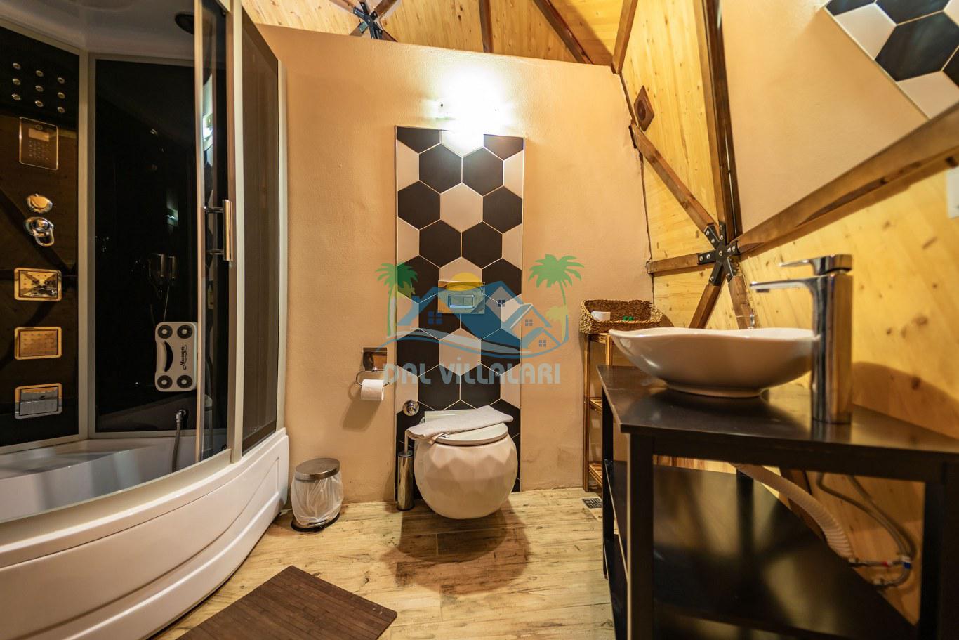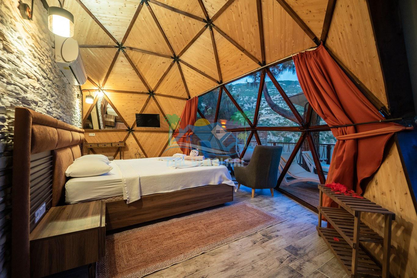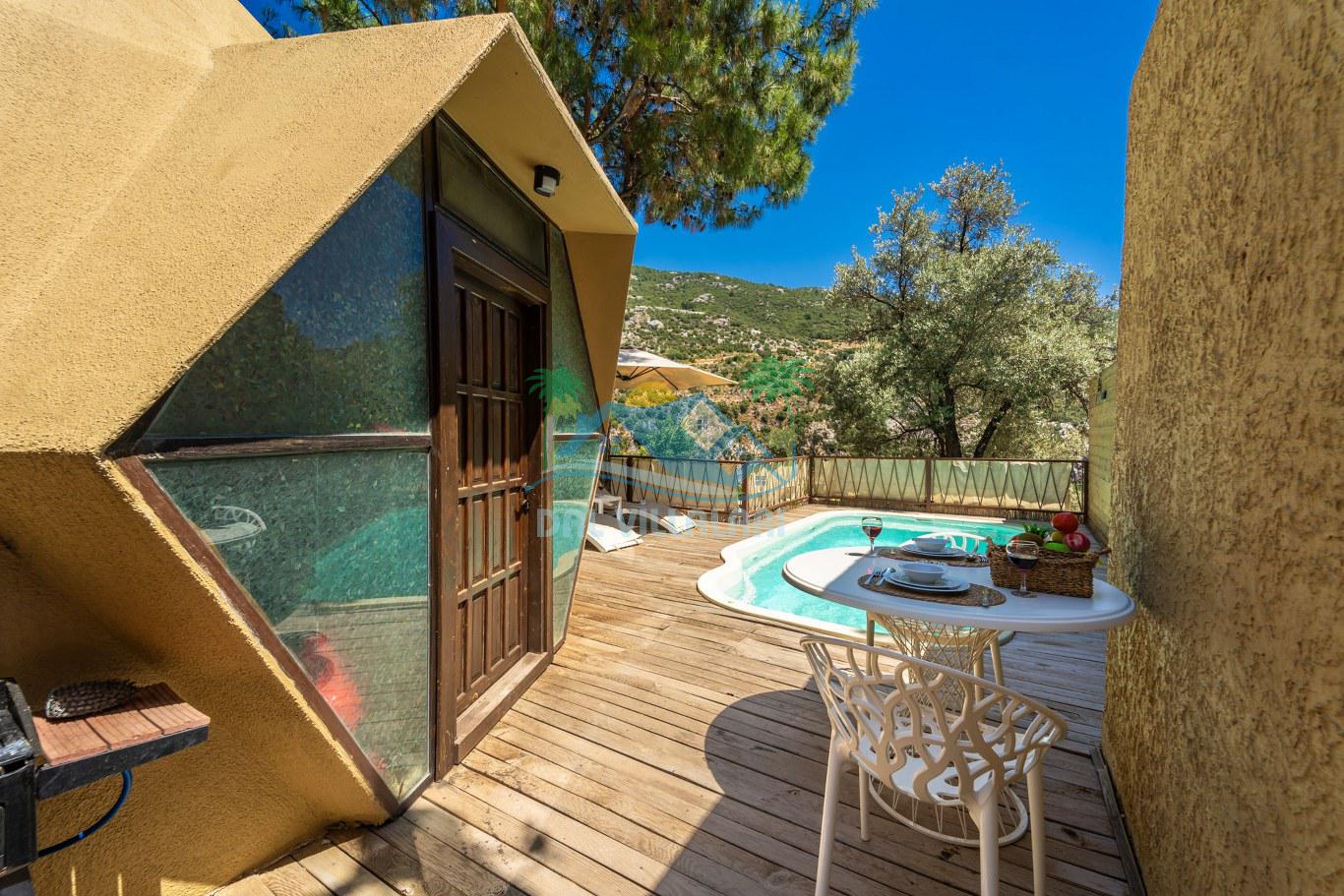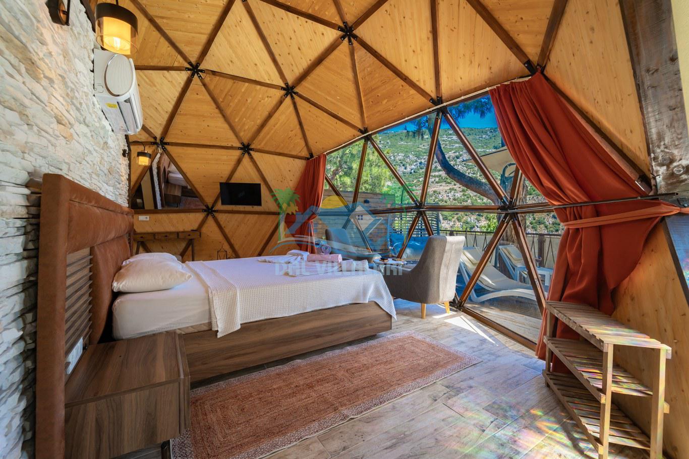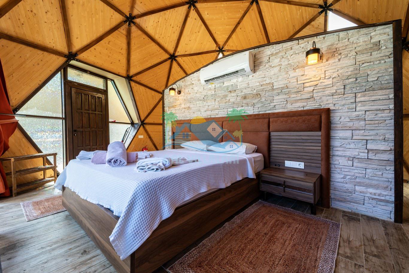 Her biri ayrı havuz terasına sahip olan kubbe tipi villalarımız, glamping kültüründen esinlenen çadır konseptlerine kıyasla Türkiye'de ilk defa 7 metre çapında, 4.30 metre kubbe yüksekliğinde, 38 metrekarelik AHŞAP yapıda üretilmiştir. Binalarımız, güvenlik ve iklim endişeleri olmaksızın konforlu bir konaklama sunar.