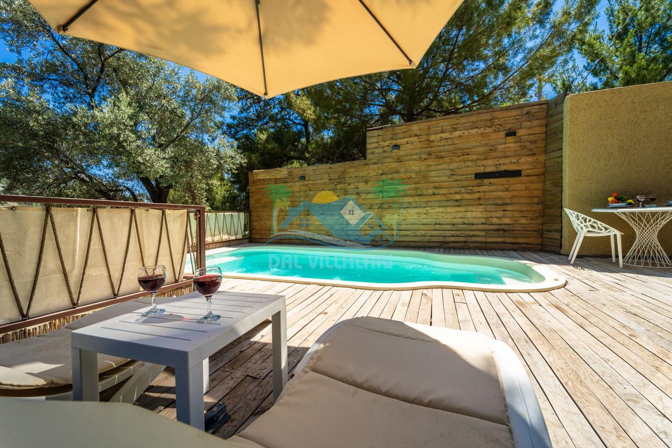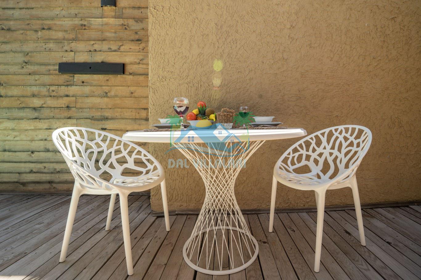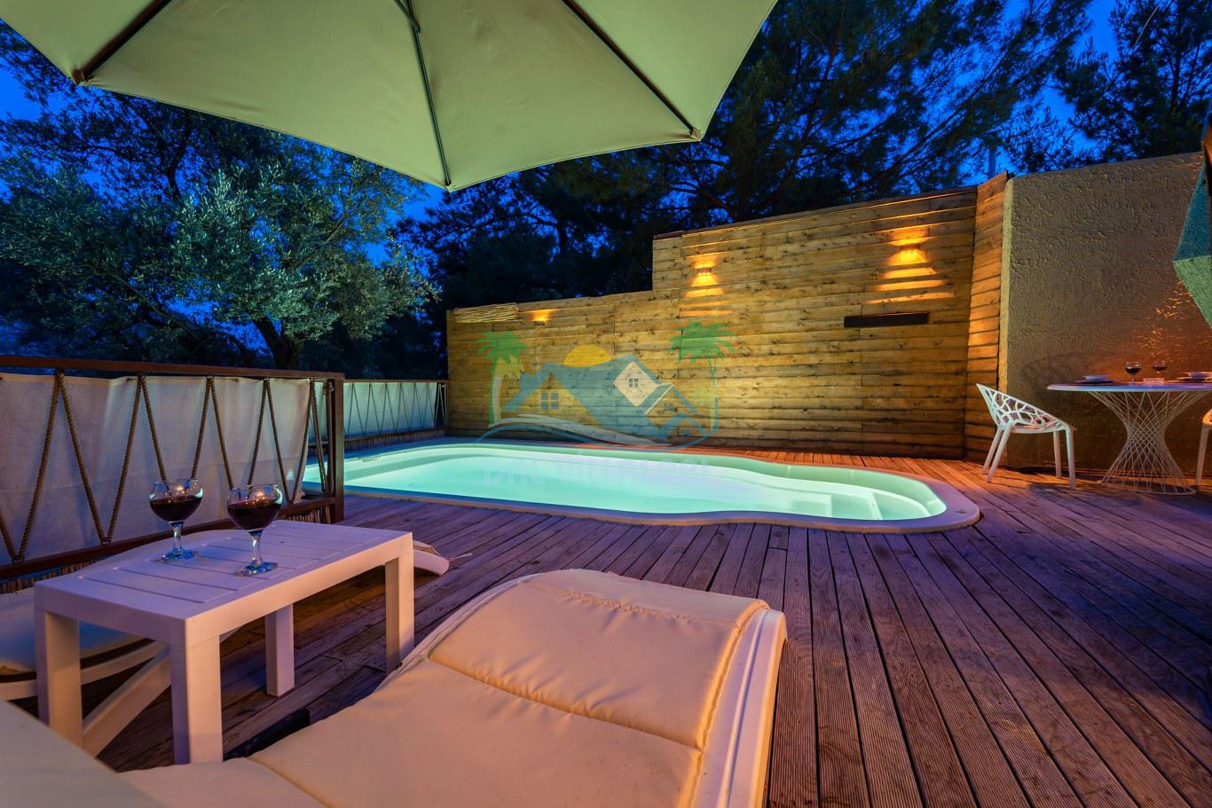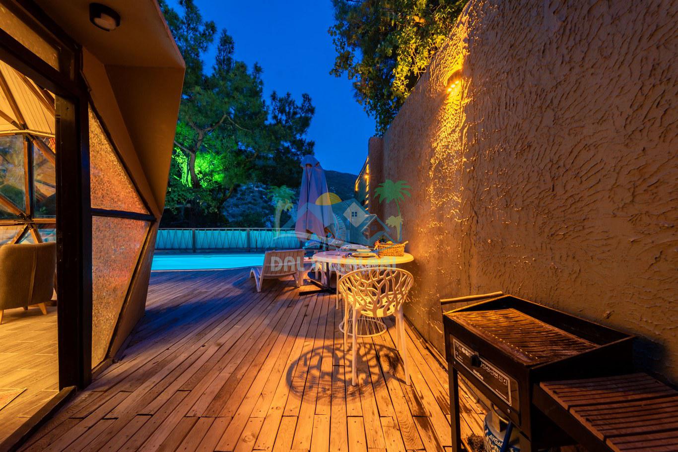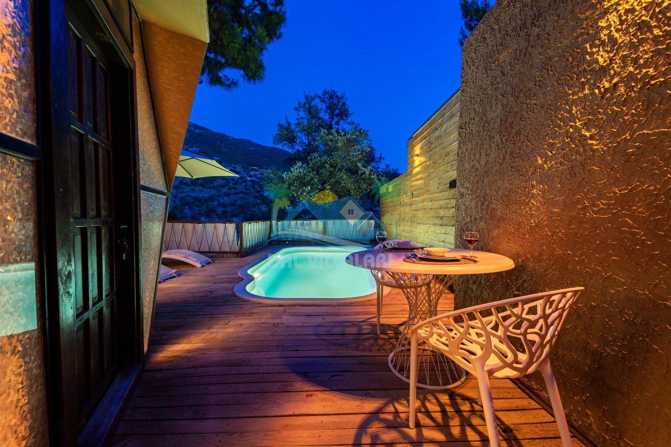Villalarımızın dış mekanında, 6x3 metre boyutlarında ve 1.35 metre derinliğinde özel bir yüzme havuzu bulunmaktadır. Basamaklı girişi ve hidromasajlı jakuzisi ile birlikte keyifli bir havuz deneyimi sunar. Uzaktan kumanda ile bu sistemi ve havuz ışıklarını kontrol edebilirsiniz. Ayrıca, her villada iki adet şezlong, şemsiye, salıncak, geniş yemek masası, 2 sandalye ve yumurta tipi oturma grubu standart olarak sunulmaktadır. (No1 hariç, hepsinde 2 kişilik yumurta tipi oturma grubu ve sehpası bulunmaktadır. No5 özel bir gölgelik geodesik kamelya ve bu kamelyada 2 adet ekstra ahşap şezlong içermektedir.)