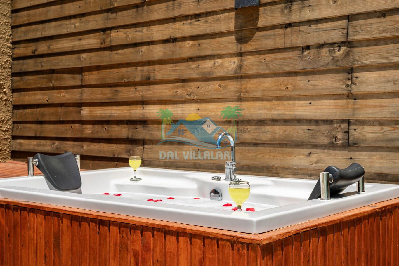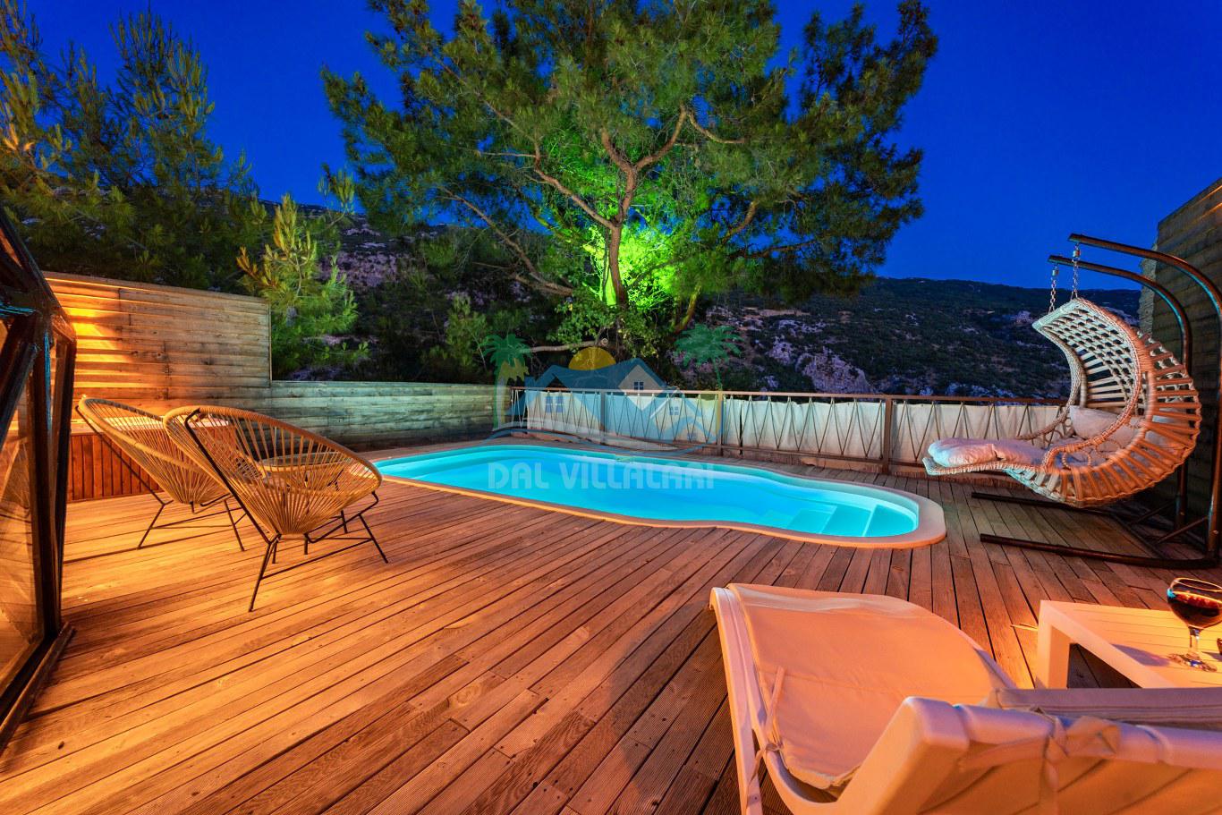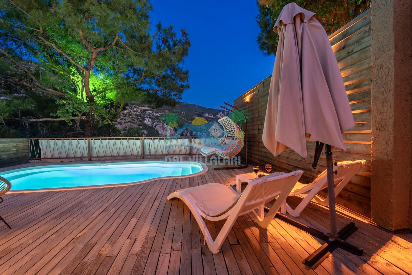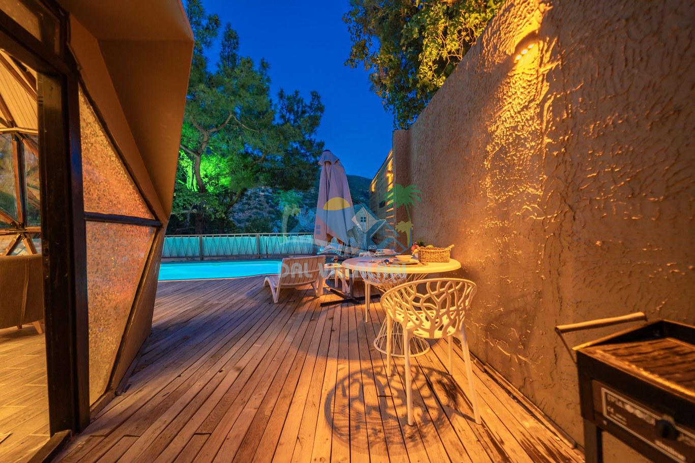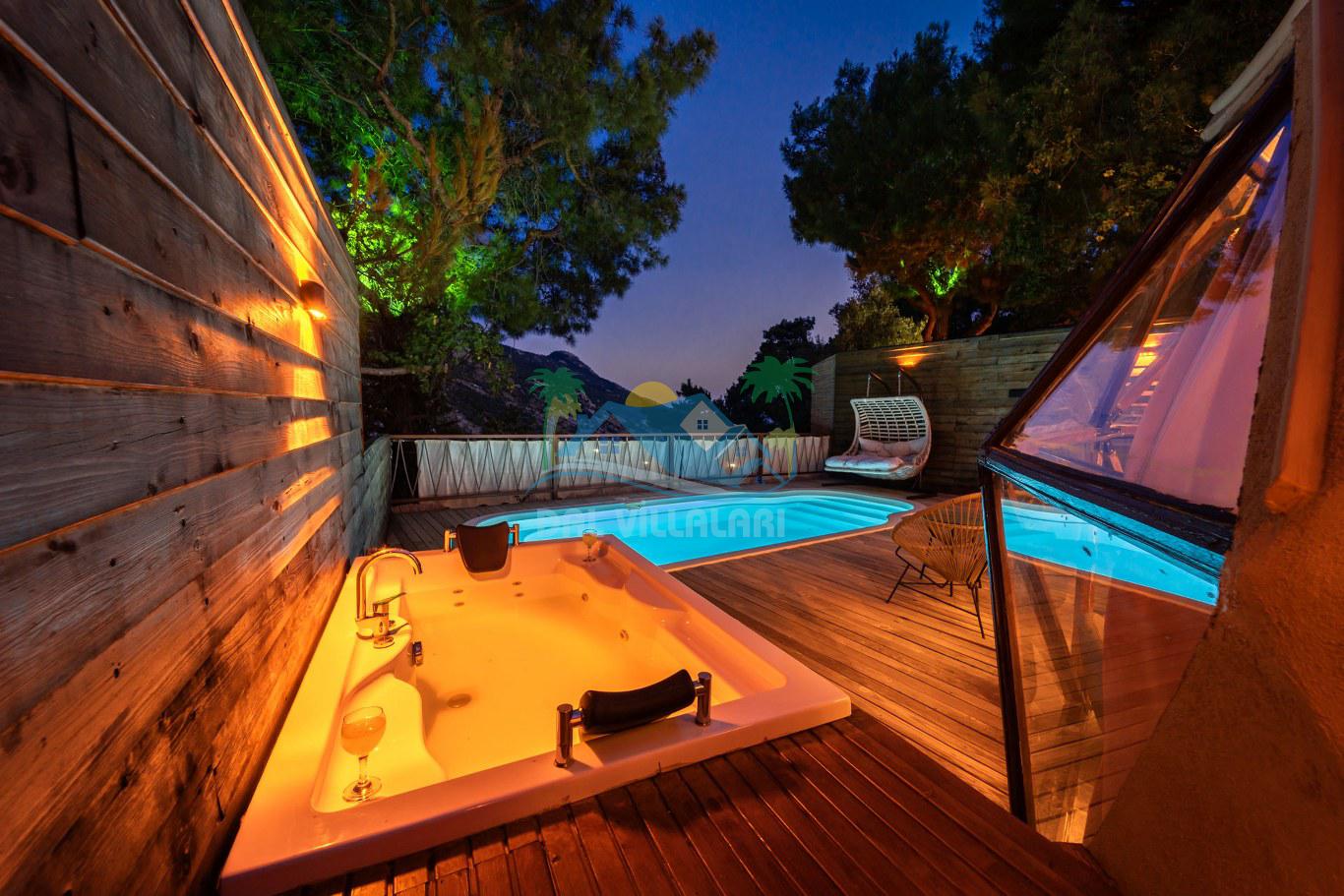 Villalarımızın dış mekanında, 6x3 metre boyutlarında ve 1.35 metre derinliğinde özel bir yüzme havuzu bulunmaktadır. Basamaklı girişi ve hidromasajlı jakuzisi ile birlikte keyifli bir havuz deneyimi sunar. Uzaktan kumanda ile bu sistemi ve havuz ışıklarını kontrol edebilirsiniz. Ayrıca, her villada iki adet şezlong, şemsiye, salıncak, geniş yemek masası, 2 sandalye ve yumurta tipi oturma grubu standart olarak sunulmaktadır. (No1 hariç, hepsinde 2 kişilik yumurta tipi oturma grubu ve sehpası bulunmaktadır. No5 özel bir gölgelik geodesik kamelya ve bu kamelyada 2 adet ekstra ahşap şezlong içermektedir.)