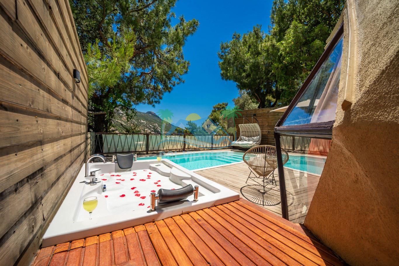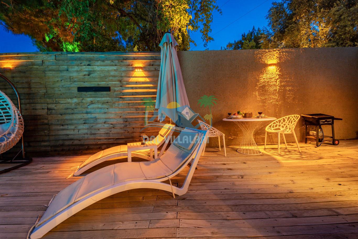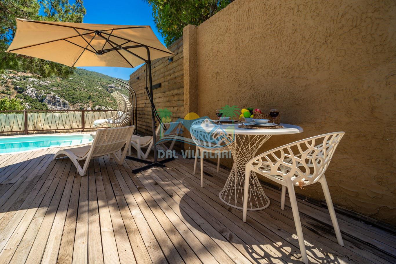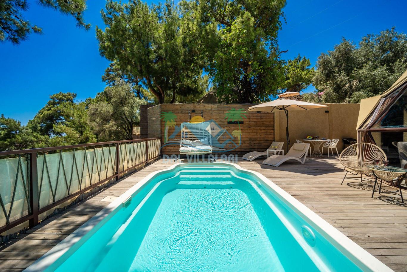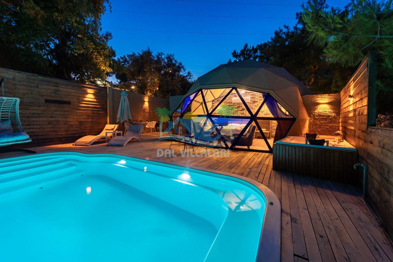 Villalarımızın dış mekanında, 6x3 metre boyutlarında ve 1.35 metre derinliğinde özel bir yüzme havuzu bulunmaktadır. Basamaklı girişi ve hidromasajlı jakuzisi ile birlikte keyifli bir havuz deneyimi sunar. Uzaktan kumanda ile bu sistemi ve havuz ışıklarını kontrol edebilirsiniz. Ayrıca, her villada iki adet şezlong, şemsiye, salıncak, geniş yemek masası, 2 sandalye ve yumurta tipi oturma grubu standart olarak sunulmaktadır. (No1 hariç, hepsinde 2 kişilik yumurta tipi oturma grubu ve sehpası bulunmaktadır. No5 özel bir gölgelik geodesik kamelya ve bu kamelyada 2 adet ekstra ahşap şezlong içermektedir.)