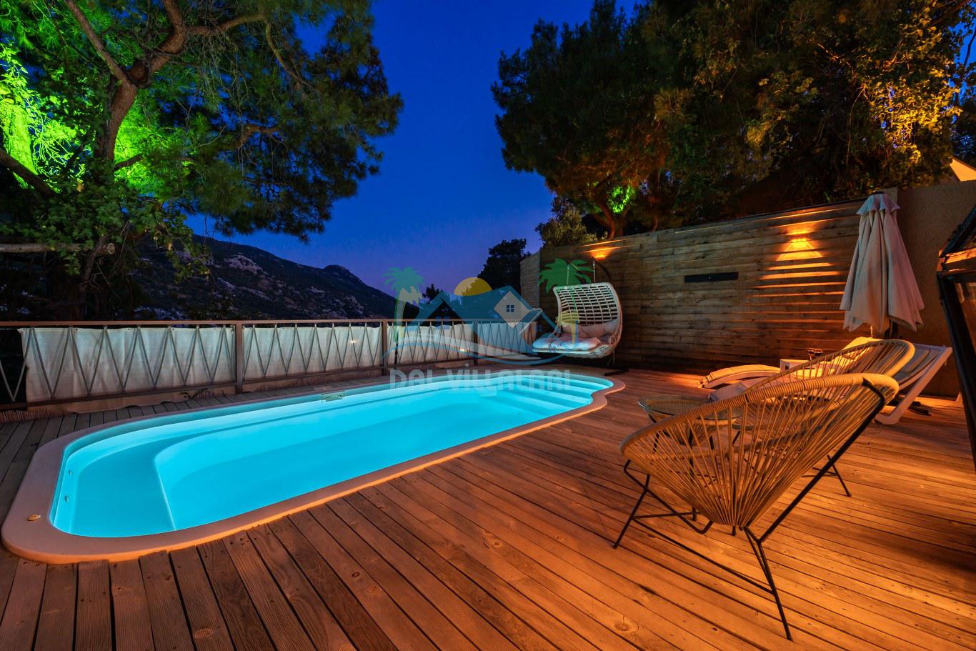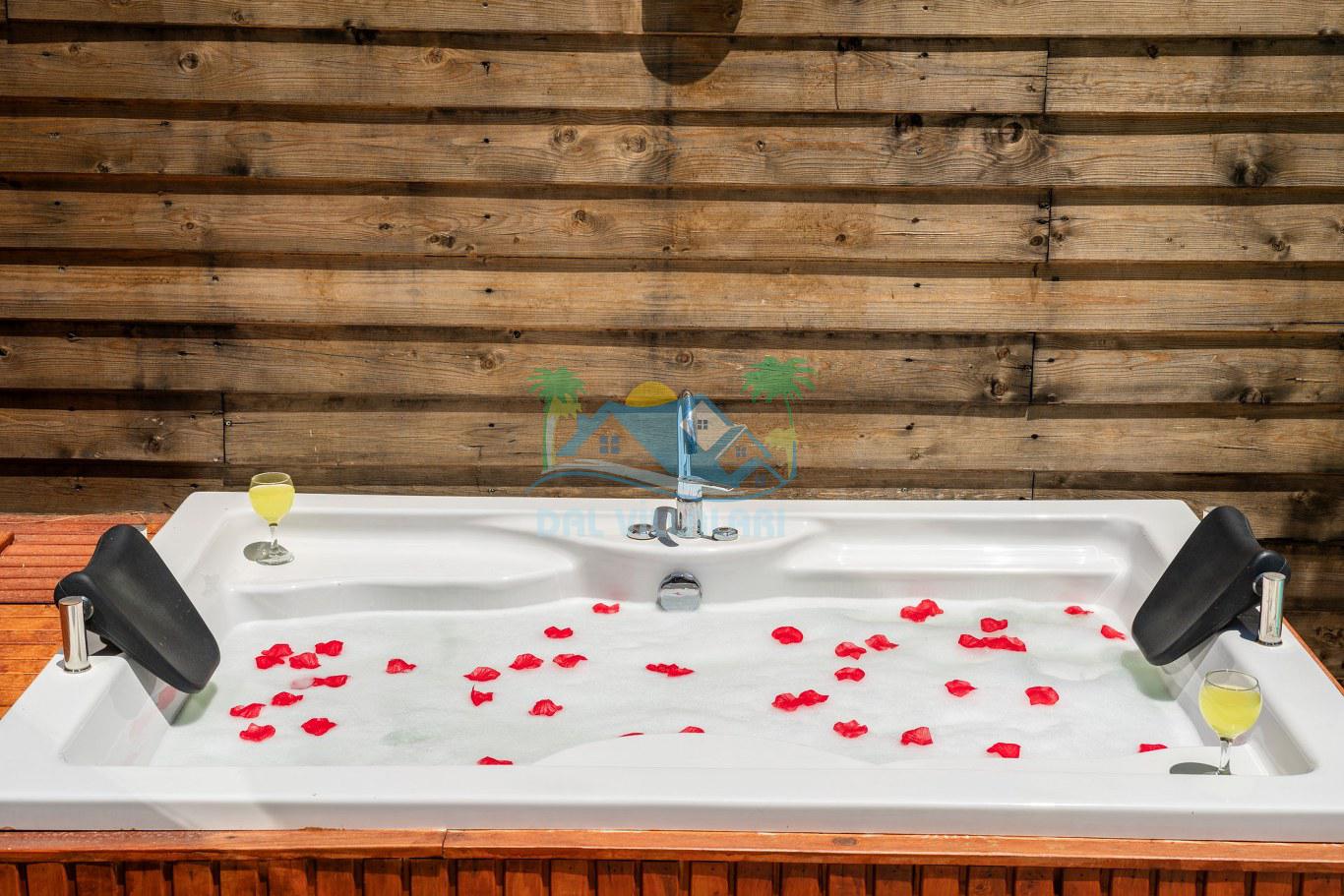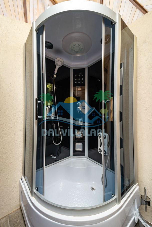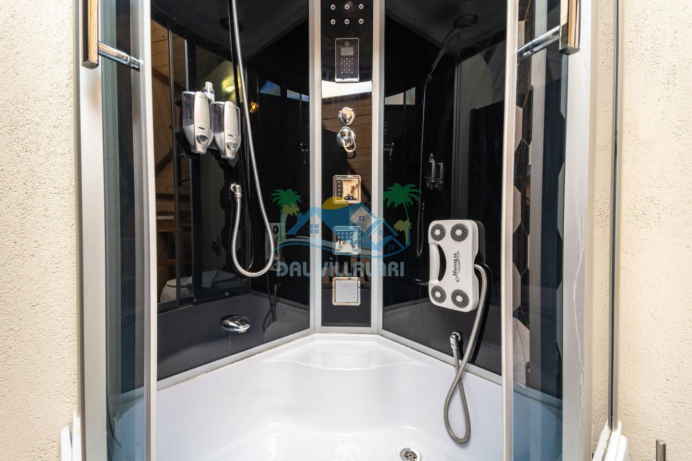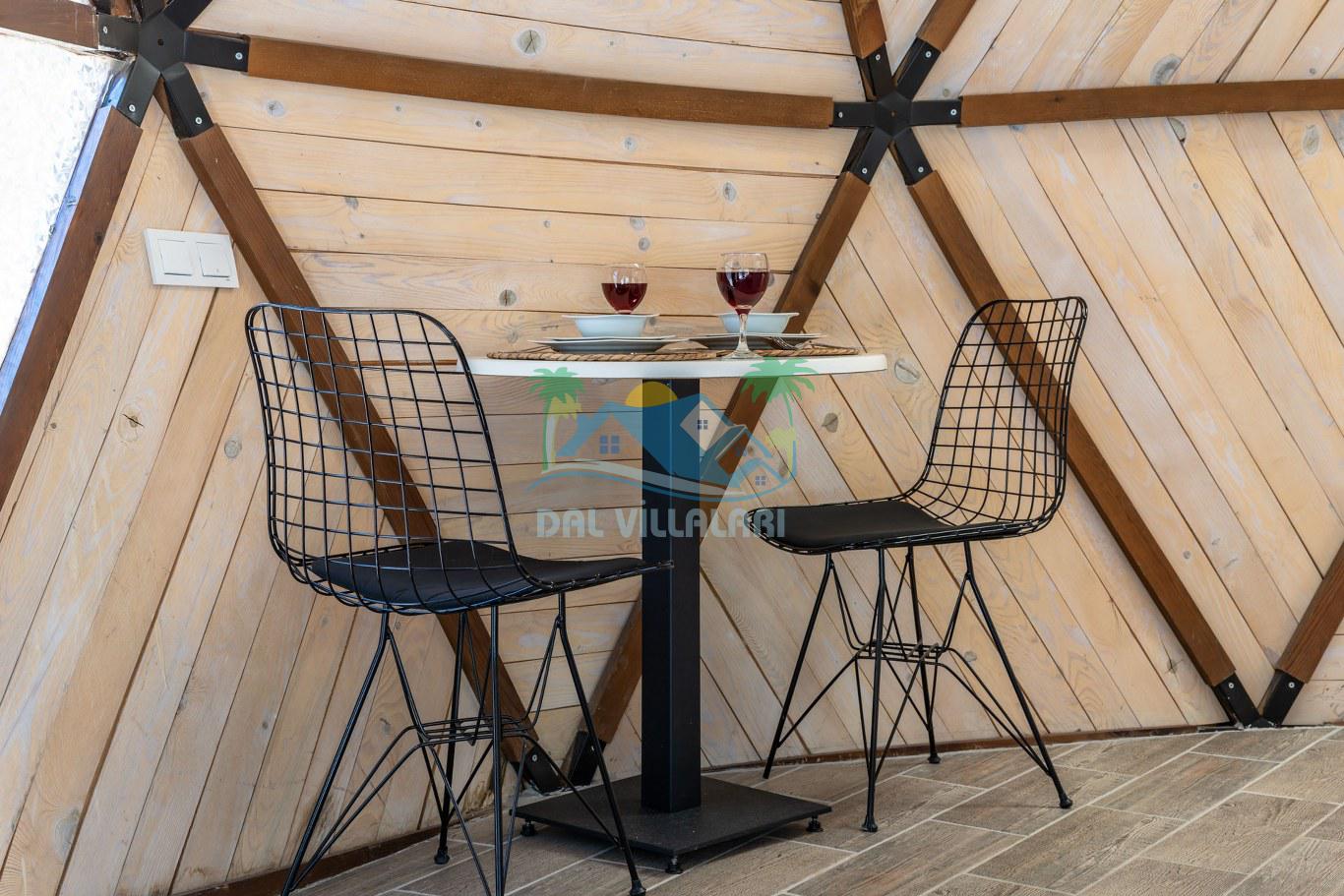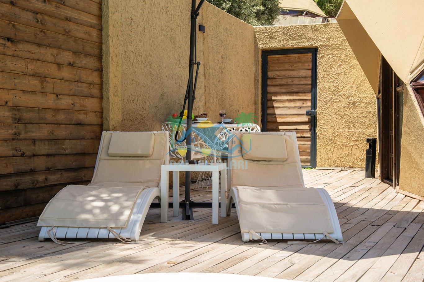Villalarımızın dış mekanında, 6x3 metre boyutlarında ve 1.35 metre derinliğinde özel bir yüzme havuzu bulunmaktadır. Basamaklı girişi ve hidromasajlı jakuzisi ile birlikte keyifli bir havuz deneyimi sunar. Uzaktan kumanda ile bu sistemi ve havuz ışıklarını kontrol edebilirsiniz. Ayrıca, her villada iki adet şezlong, şemsiye, salıncak, geniş yemek masası, 2 sandalye ve yumurta tipi oturma grubu standart olarak sunulmaktadır. (No1 hariç, hepsinde 2 kişilik yumurta tipi oturma grubu ve sehpası bulunmaktadır. No5 özel bir gölgelik geodesik kamelya ve bu kamelyada 2 adet ekstra ahşap şezlong içermektedir.)