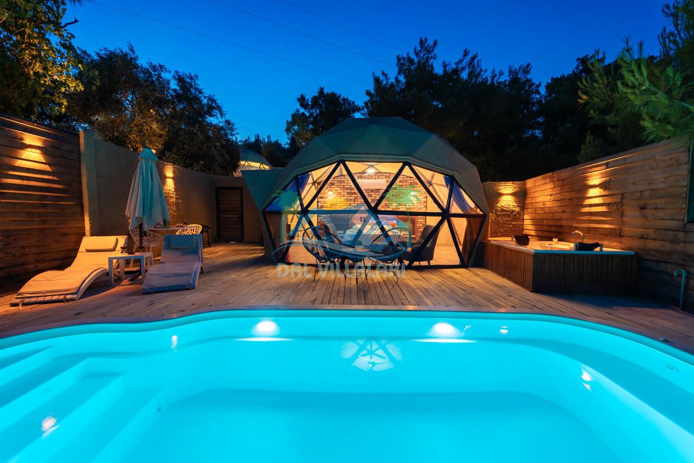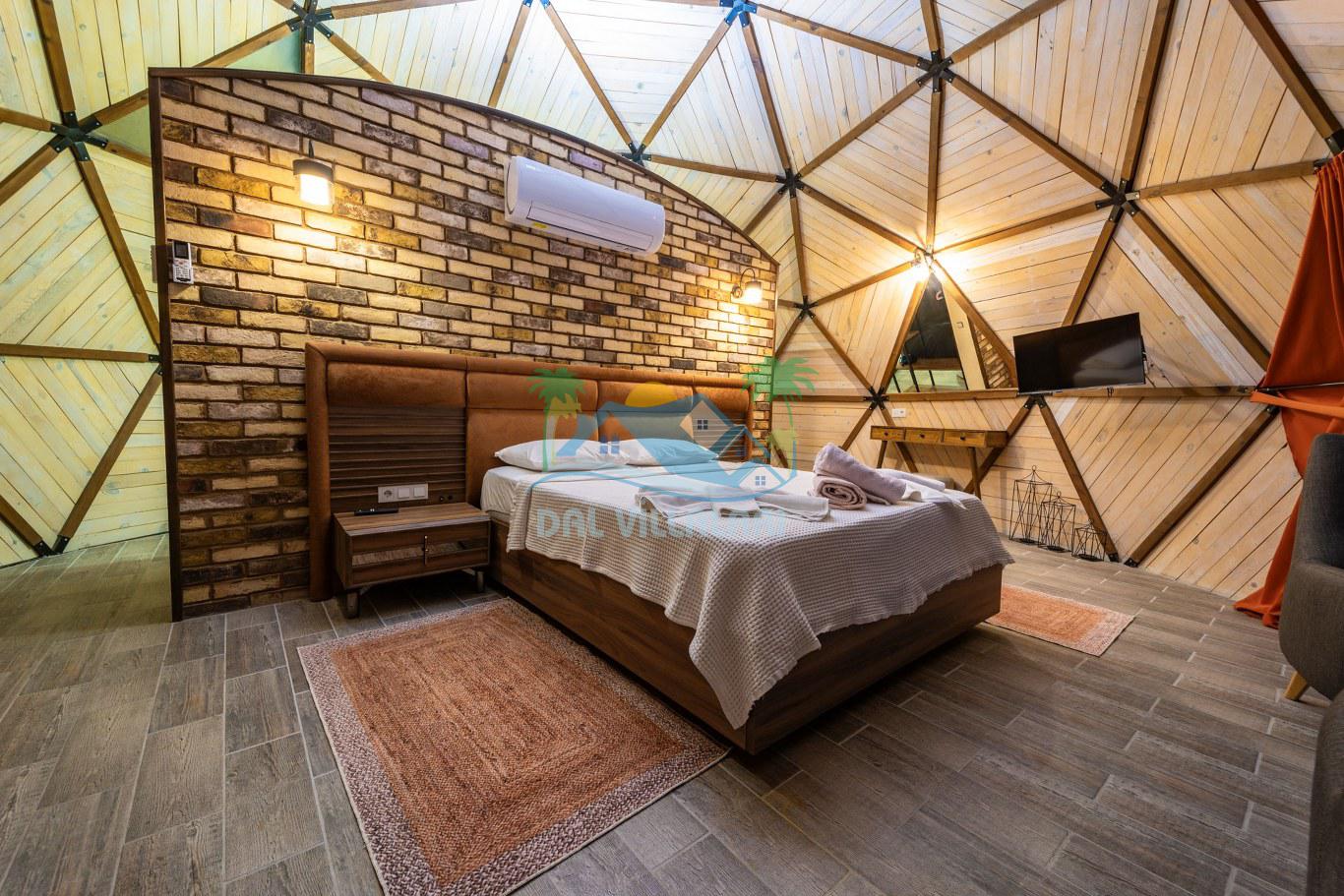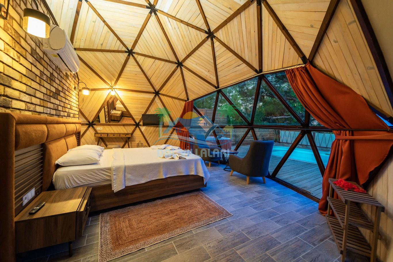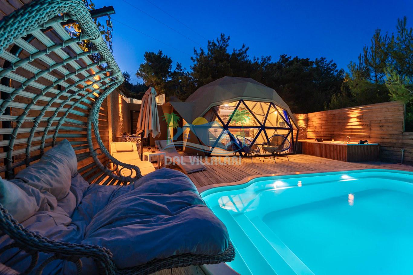 Her biri ayrı havuz terasına sahip olan kubbe tipi villalarımız, glamping kültüründen esinlenen çadır konseptlerine kıyasla Türkiye'de ilk defa 7 metre çapında, 4.30 metre kubbe yüksekliğinde, 38 metrekarelik AHŞAP yapıda üretilmiştir. Binalarımız, güvenlik ve iklim endişeleri olmaksızın konforlu bir konaklama sunar.