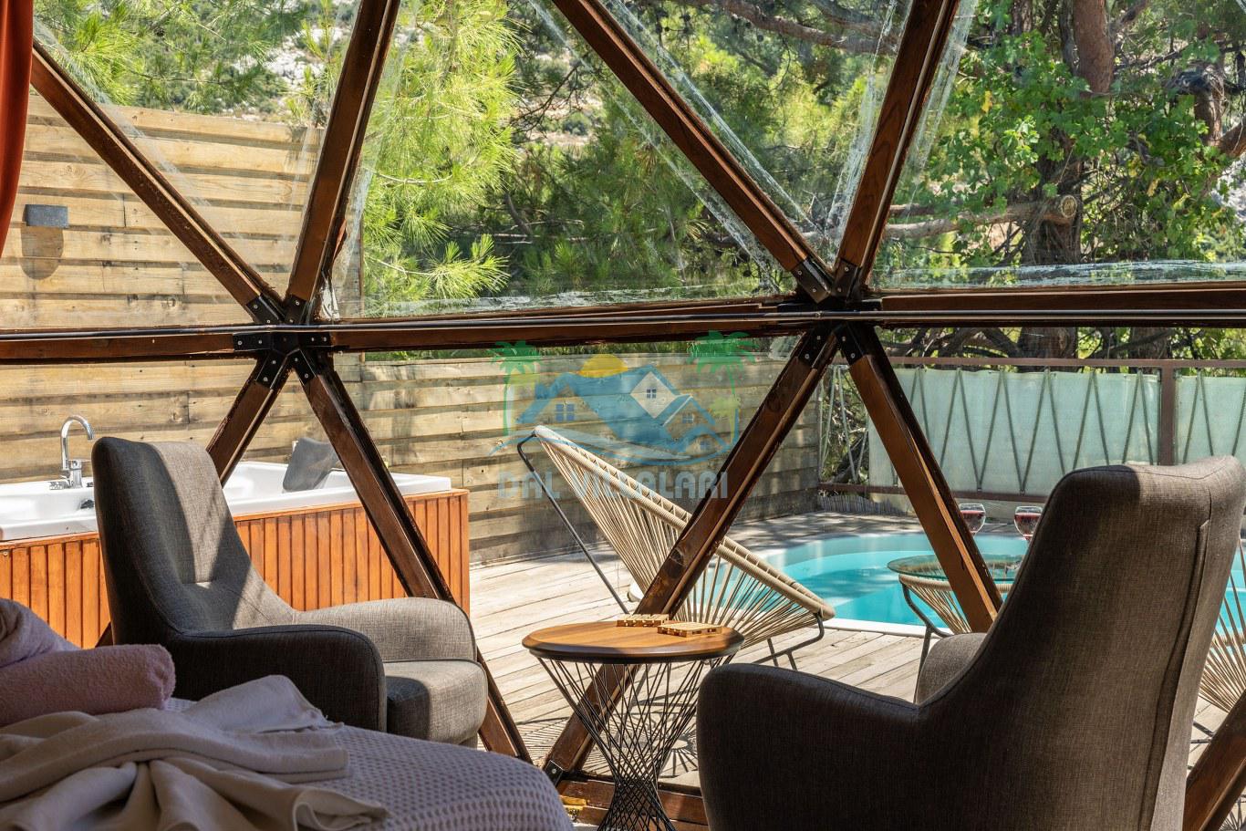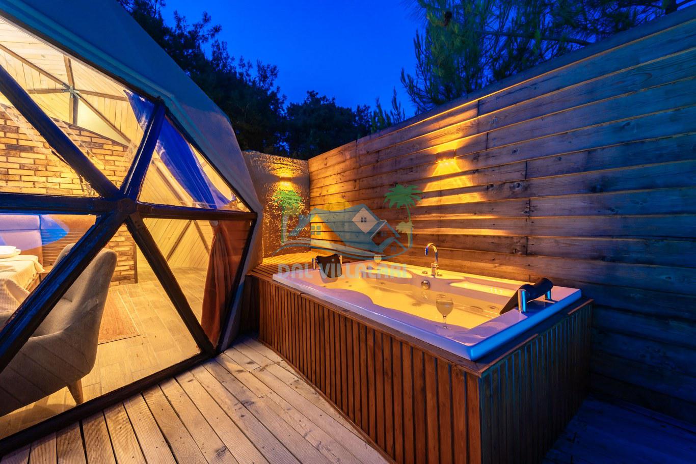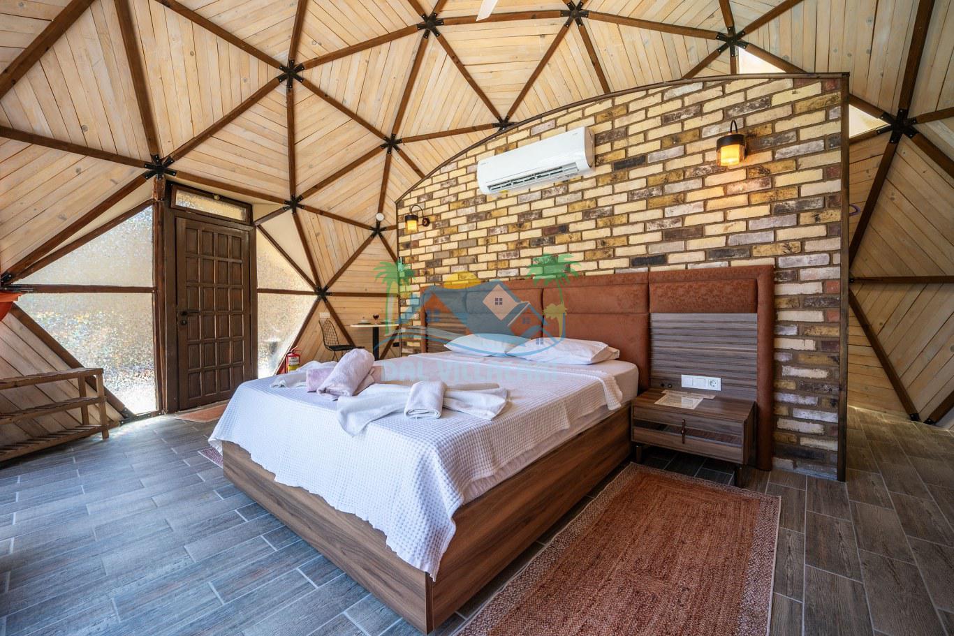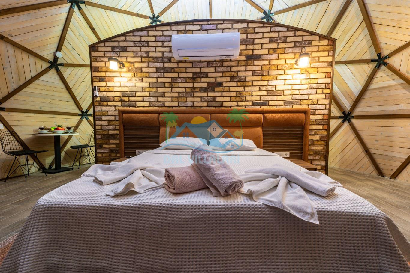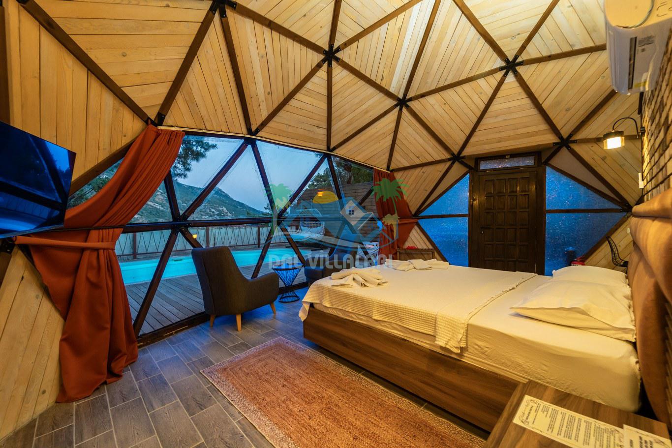 Her biri ayrı havuz terasına sahip olan kubbe tipi villalarımız, glamping kültüründen esinlenen çadır konseptlerine kıyasla Türkiye'de ilk defa 7 metre çapında, 4.30 metre kubbe yüksekliğinde, 38 metrekarelik AHŞAP yapıda üretilmiştir. Binalarımız, güvenlik ve iklim endişeleri olmaksızın konforlu bir konaklama sunar.