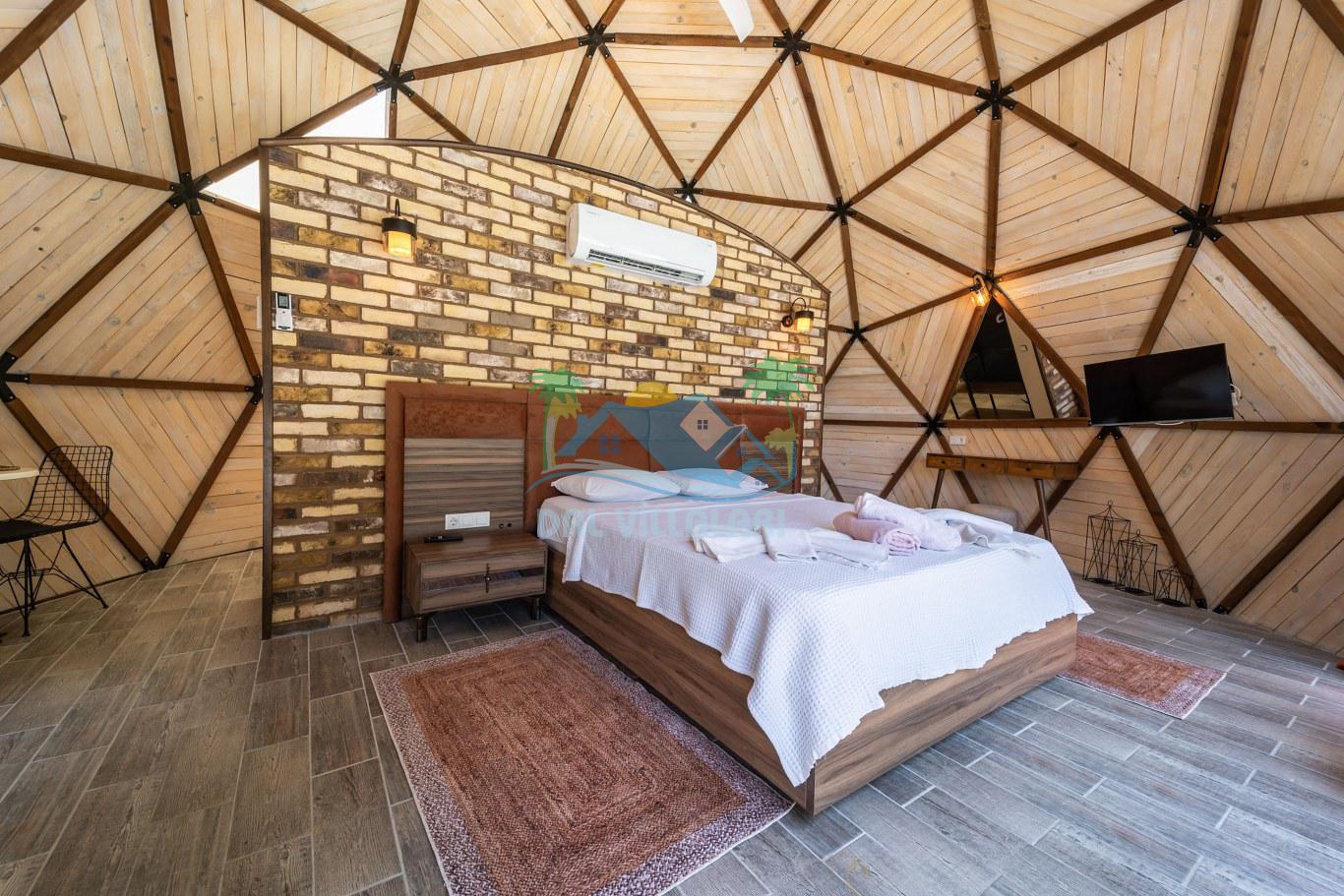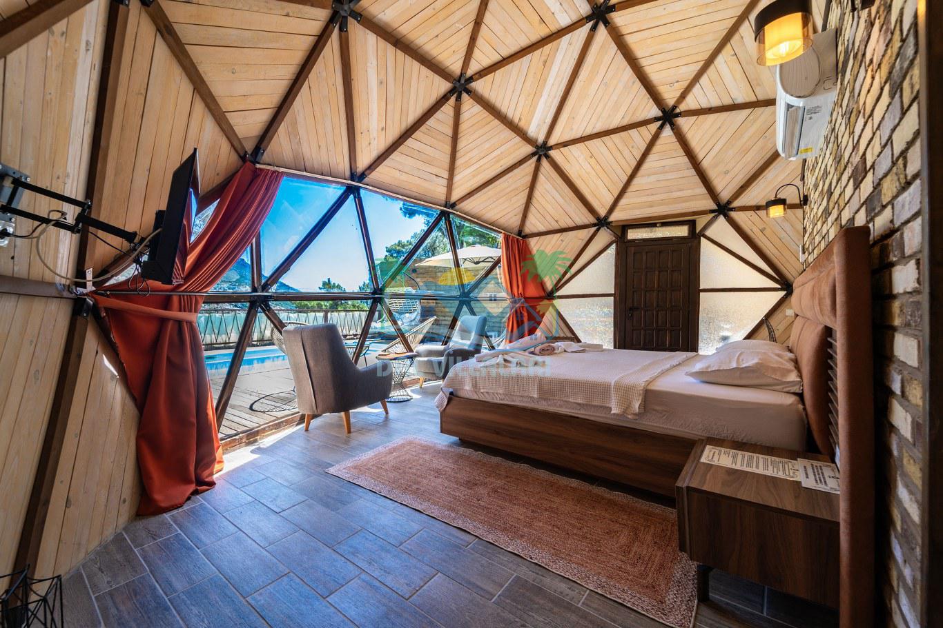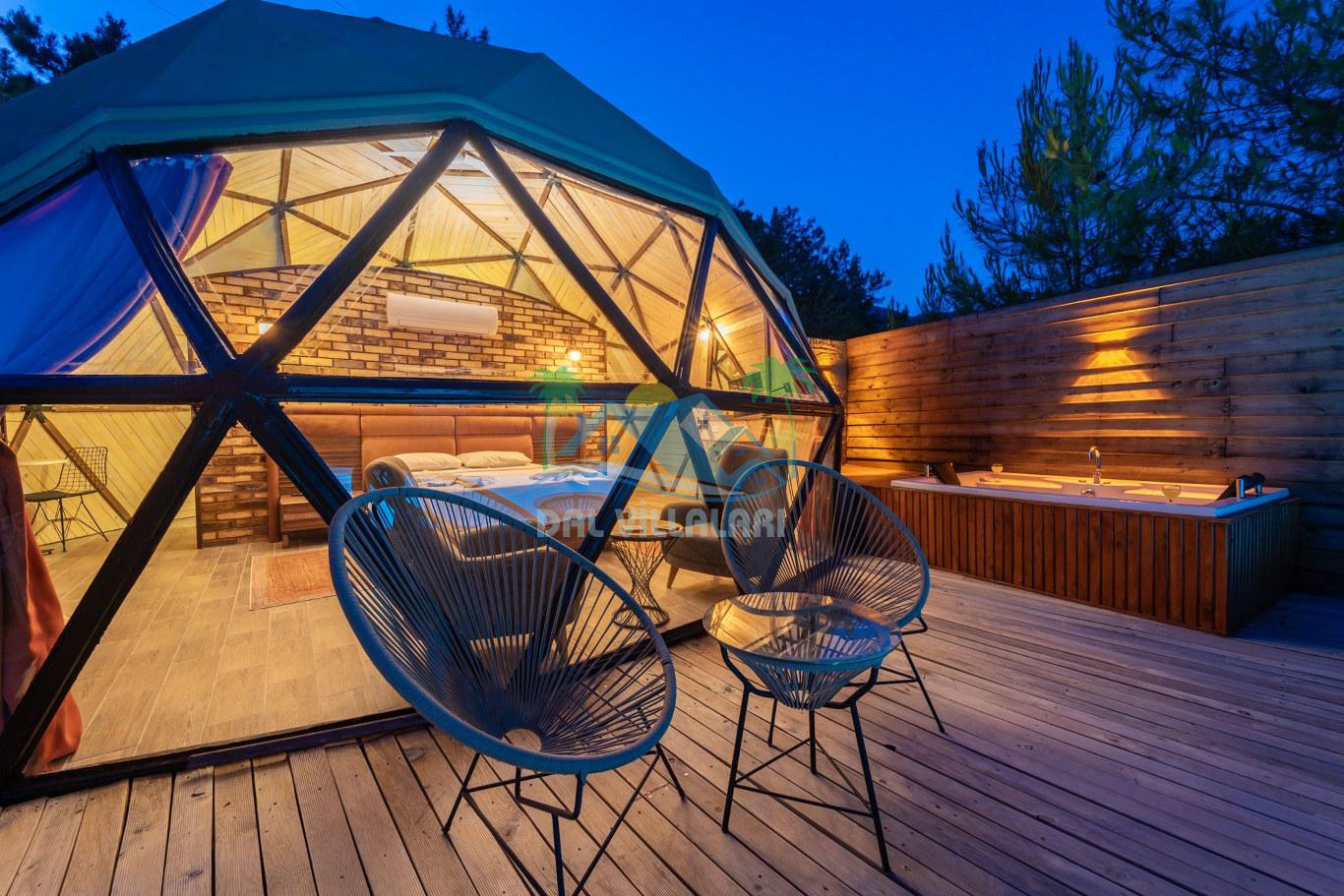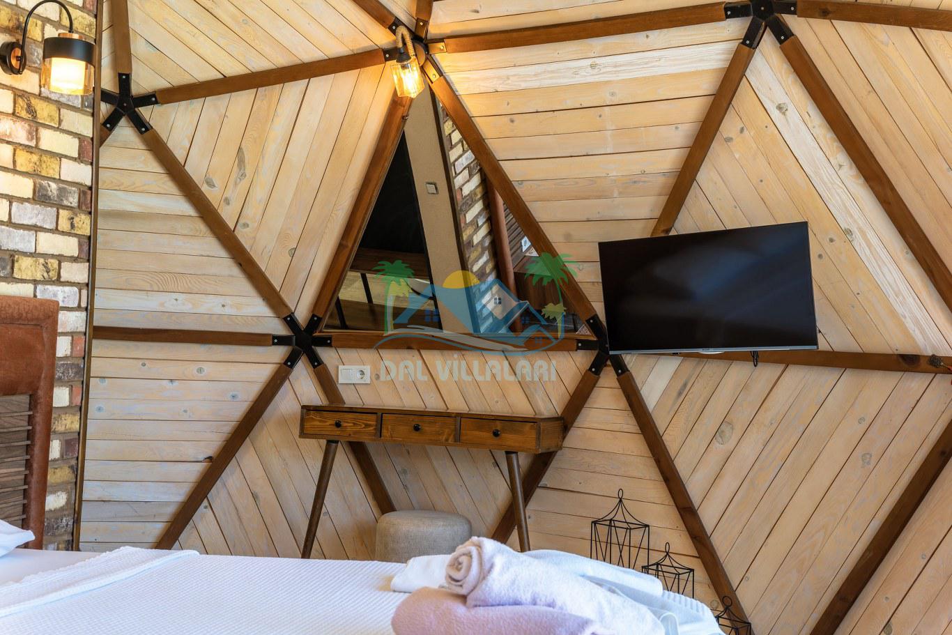 Her biri ayrı havuz terasına sahip olan kubbe tipi villalarımız, glamping kültüründen esinlenen çadır konseptlerine kıyasla Türkiye'de ilk defa 7 metre çapında, 4.30 metre kubbe yüksekliğinde, 38 metrekarelik AHŞAP yapıda üretilmiştir. Binalarımız, güvenlik ve iklim endişeleri olmaksızın konforlu bir konaklama sunar.