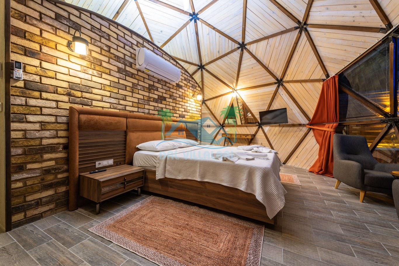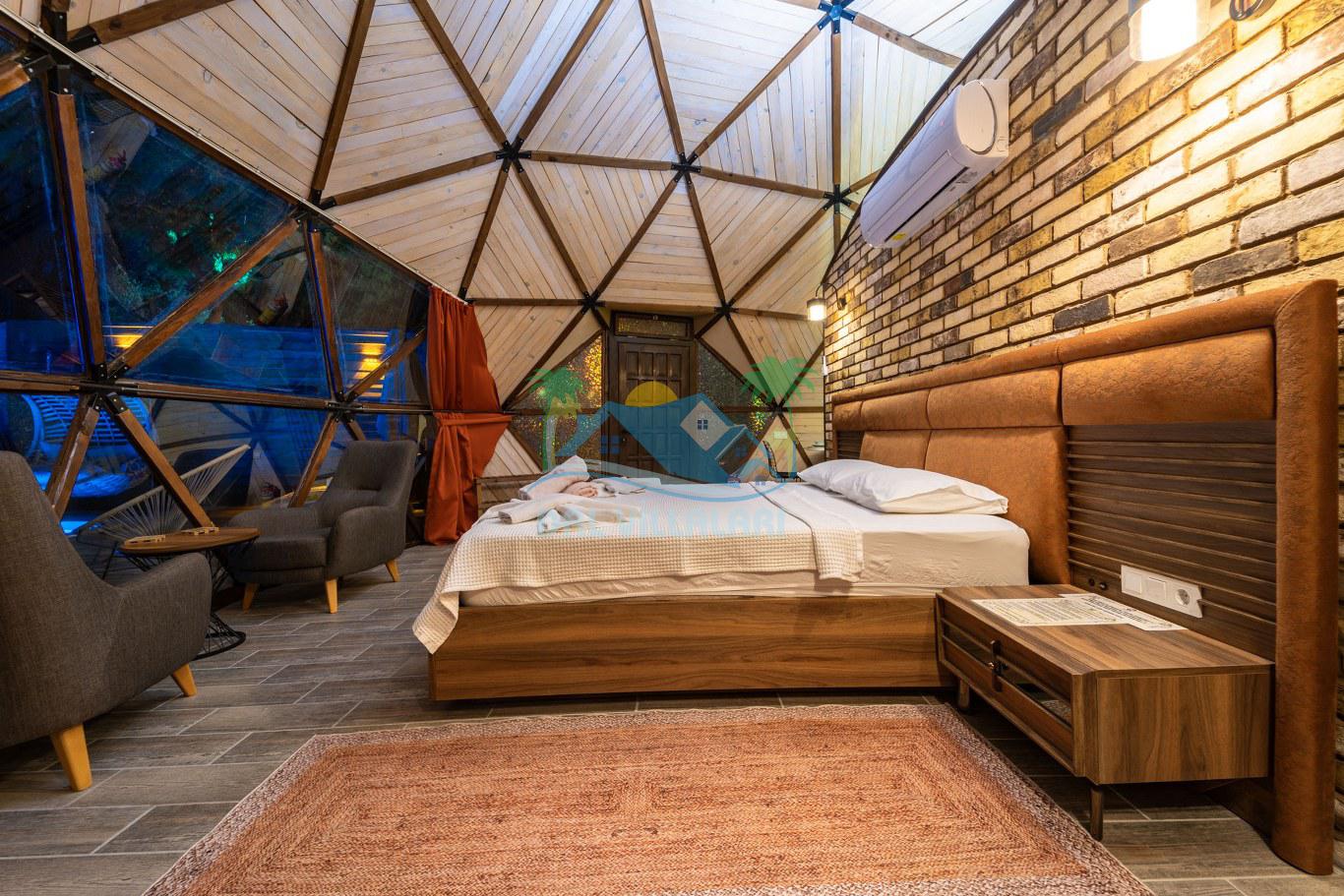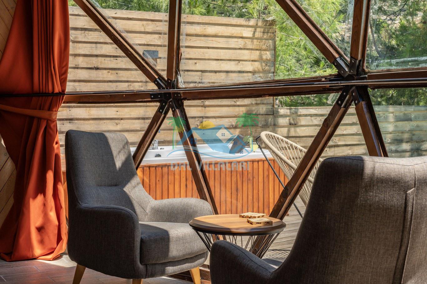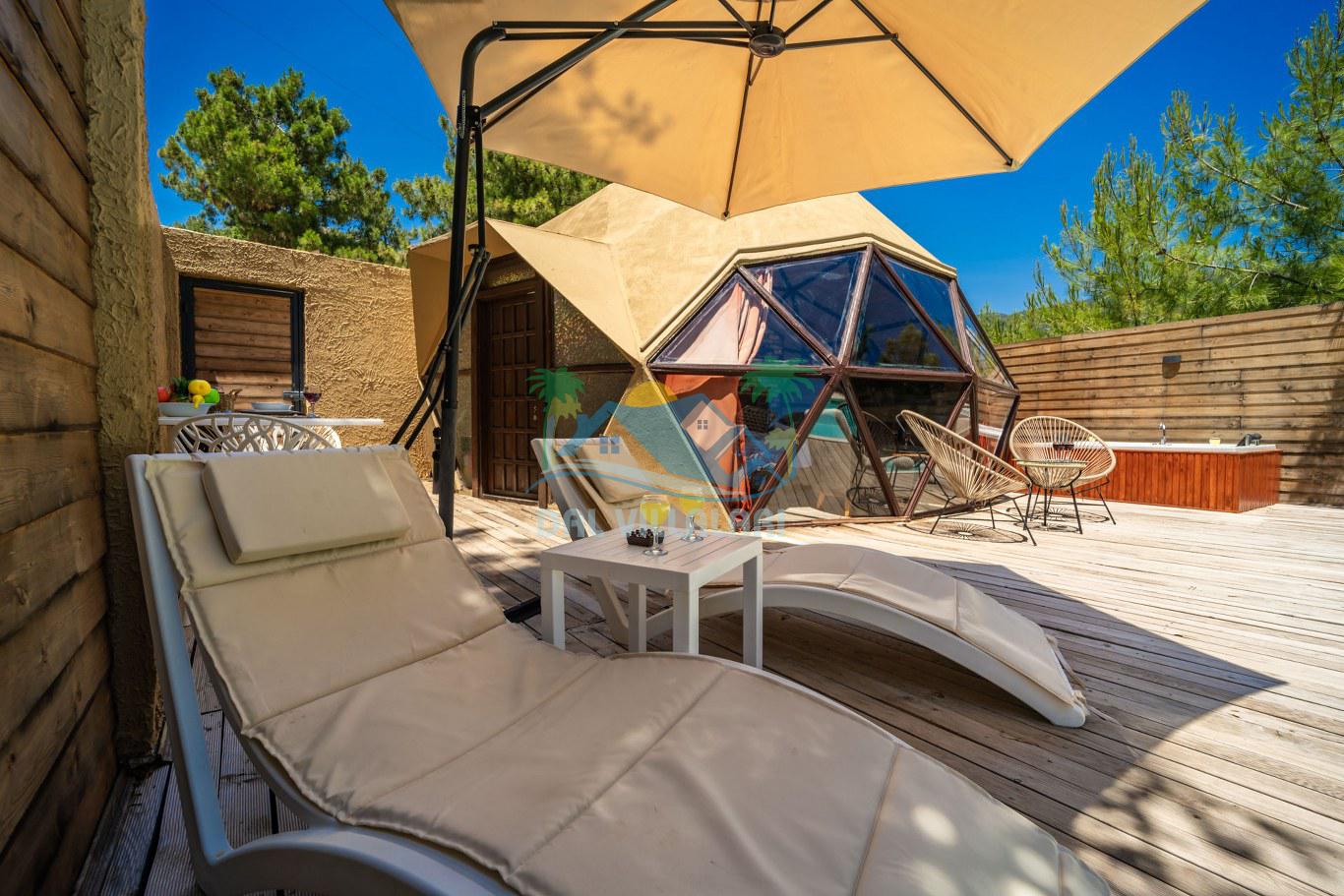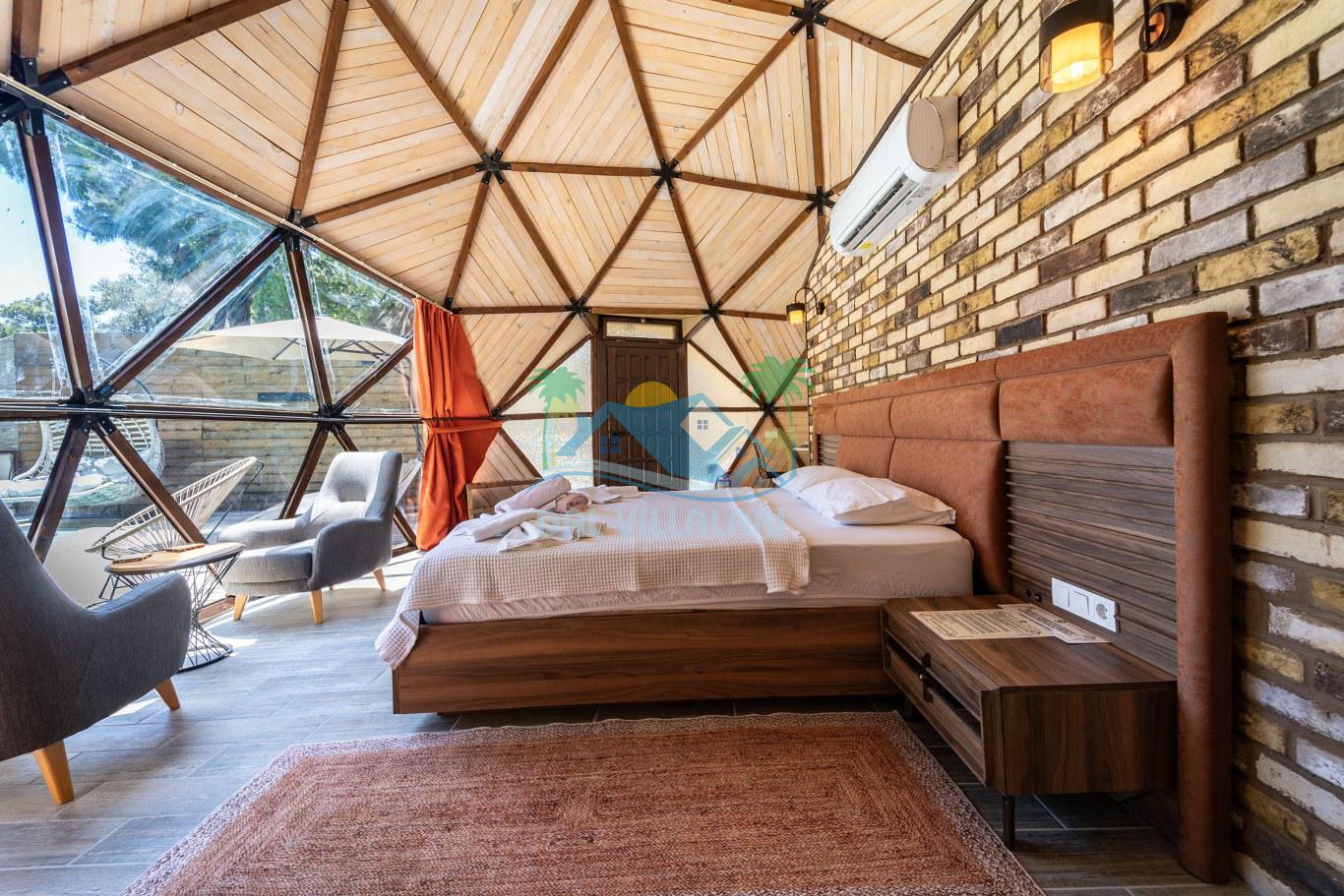 Her biri ayrı havuz terasına sahip olan kubbe tipi villalarımız, glamping kültüründen esinlenen çadır konseptlerine kıyasla Türkiye'de ilk defa 7 metre çapında, 4.30 metre kubbe yüksekliğinde, 38 metrekarelik AHŞAP yapıda üretilmiştir. Binalarımız, güvenlik ve iklim endişeleri olmaksızın konforlu bir konaklama sunar.