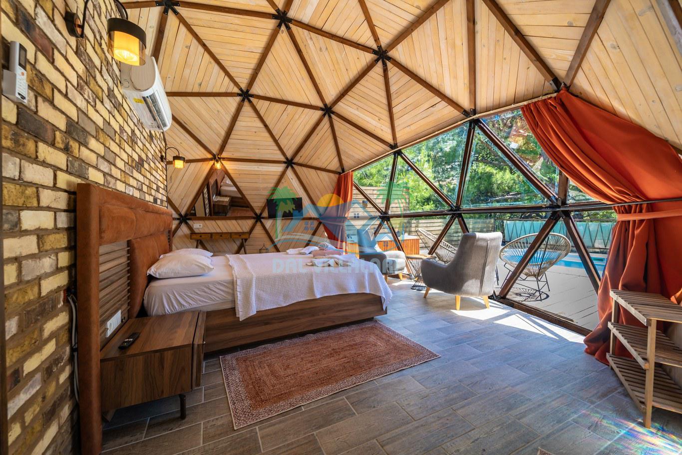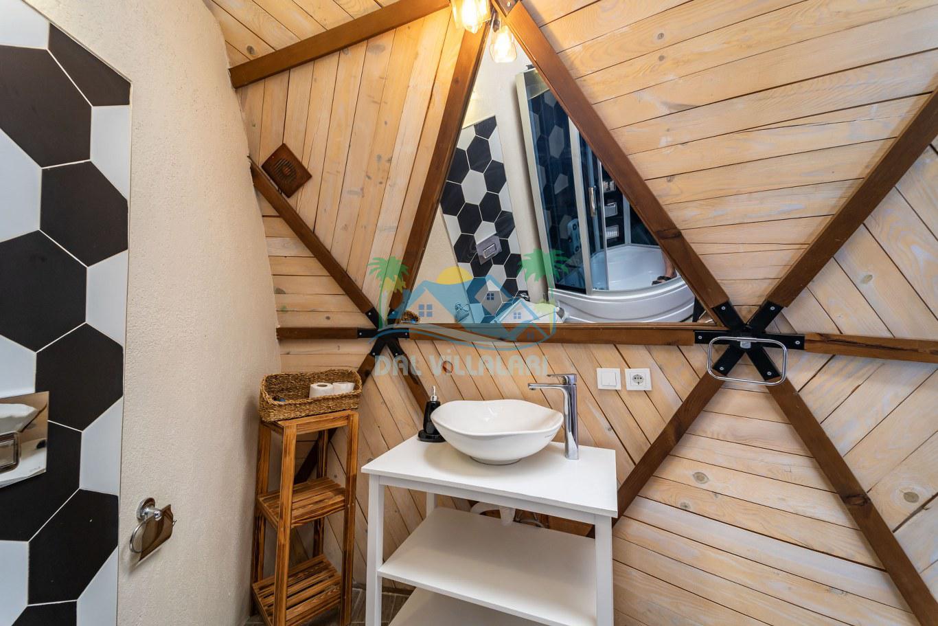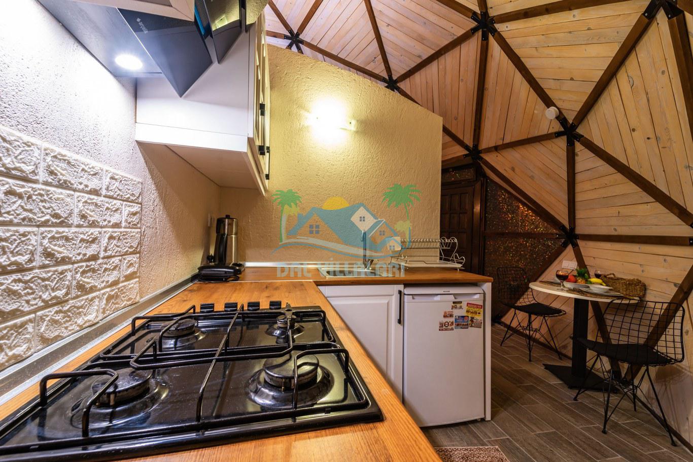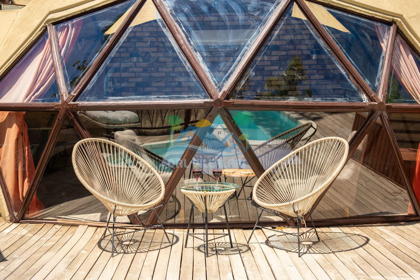 Her biri ayrı havuz terasına sahip olan kubbe tipi villalarımız, glamping kültüründen esinlenen çadır konseptlerine kıyasla Türkiye'de ilk defa 7 metre çapında, 4.30 metre kubbe yüksekliğinde, 38 metrekarelik AHŞAP yapıda üretilmiştir. Binalarımız, güvenlik ve iklim endişeleri olmaksızın konforlu bir konaklama sunar.