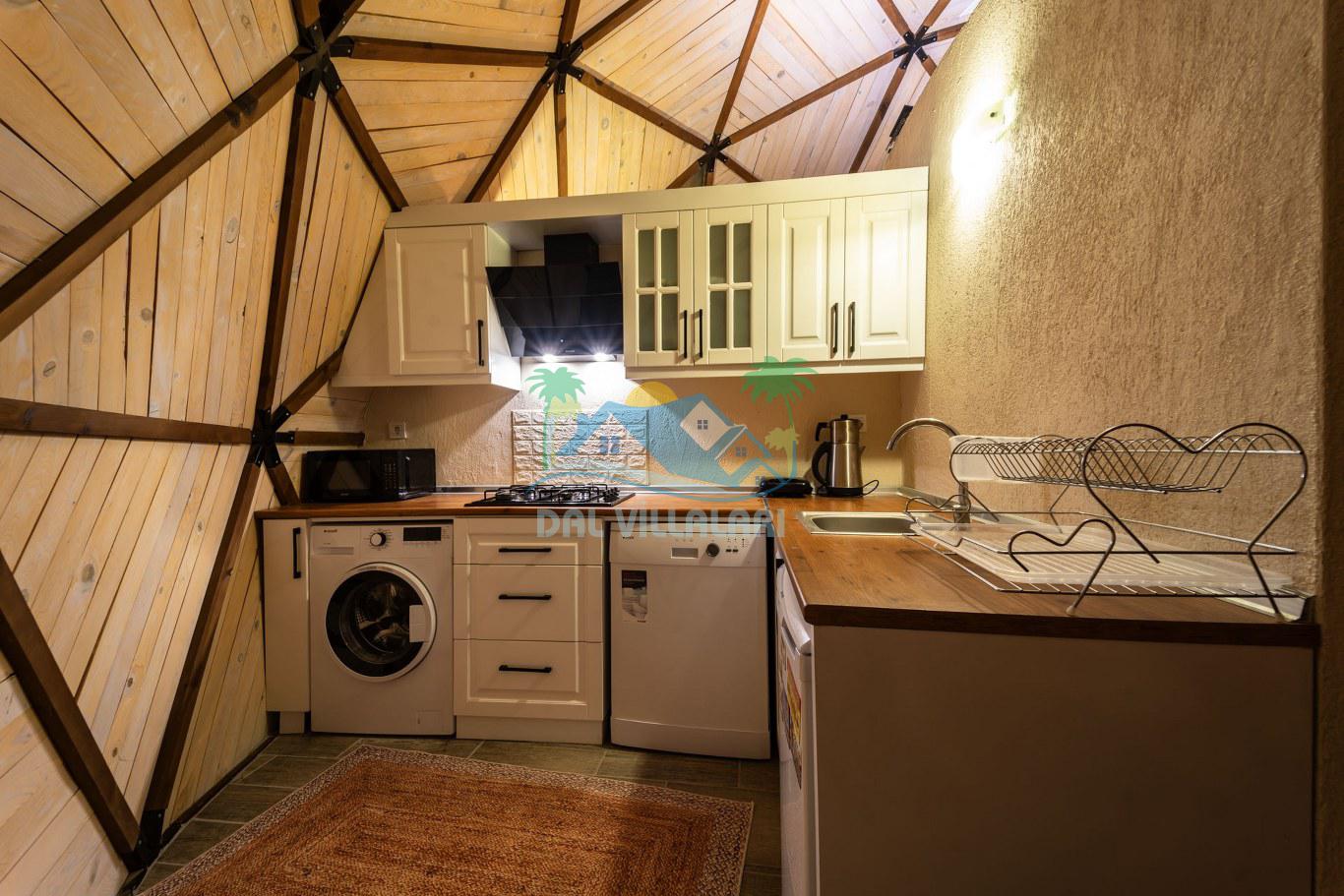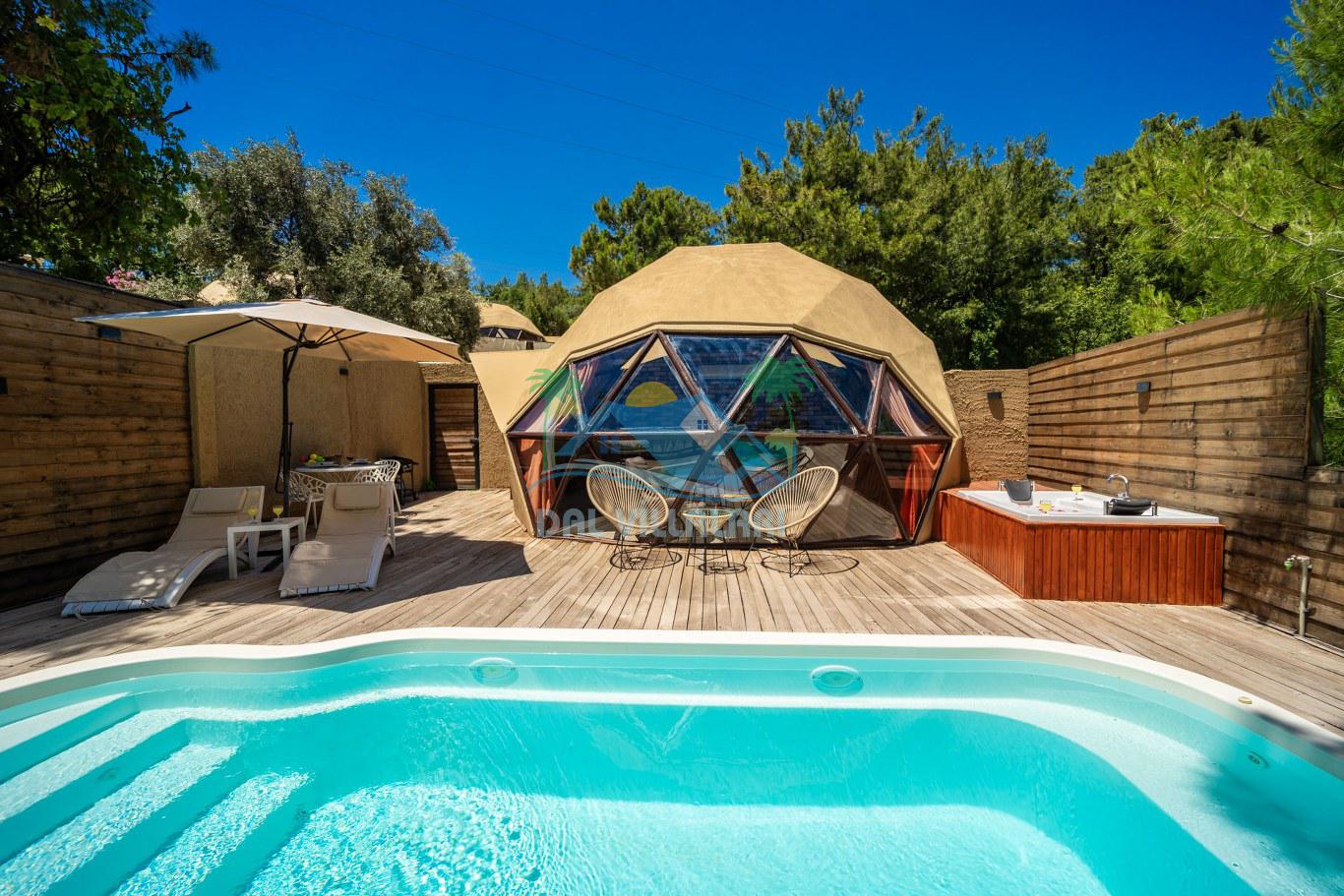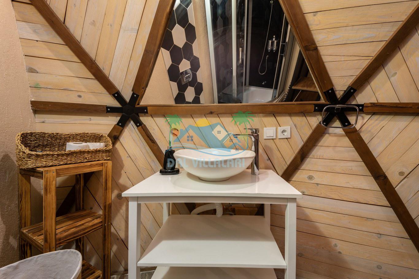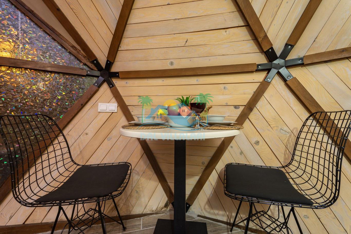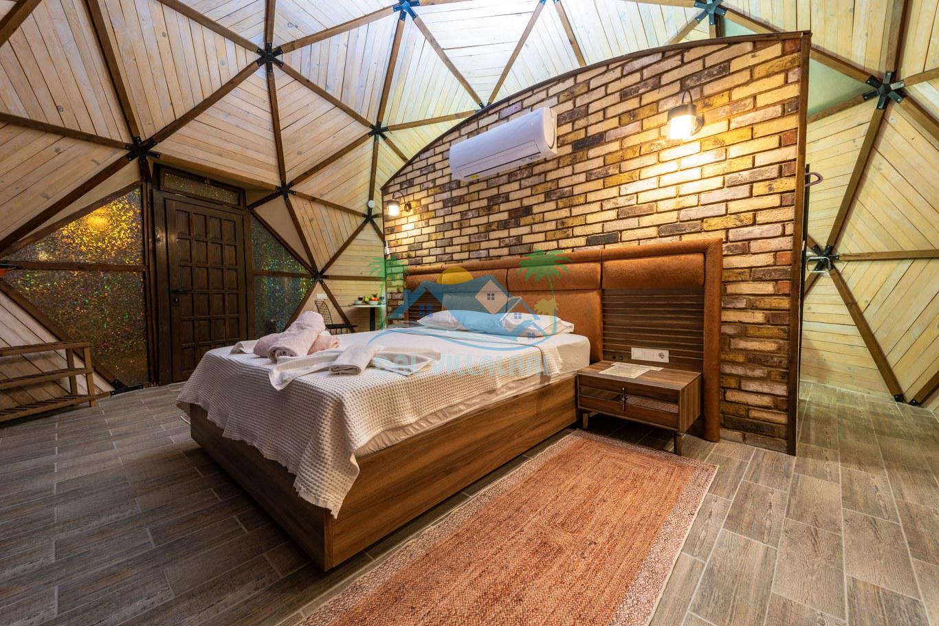 Her biri ayrı havuz terasına sahip olan kubbe tipi villalarımız, glamping kültüründen esinlenen çadır konseptlerine kıyasla Türkiye'de ilk defa 7 metre çapında, 4.30 metre kubbe yüksekliğinde, 38 metrekarelik AHŞAP yapıda üretilmiştir. Binalarımız, güvenlik ve iklim endişeleri olmaksızın konforlu bir konaklama sunar.