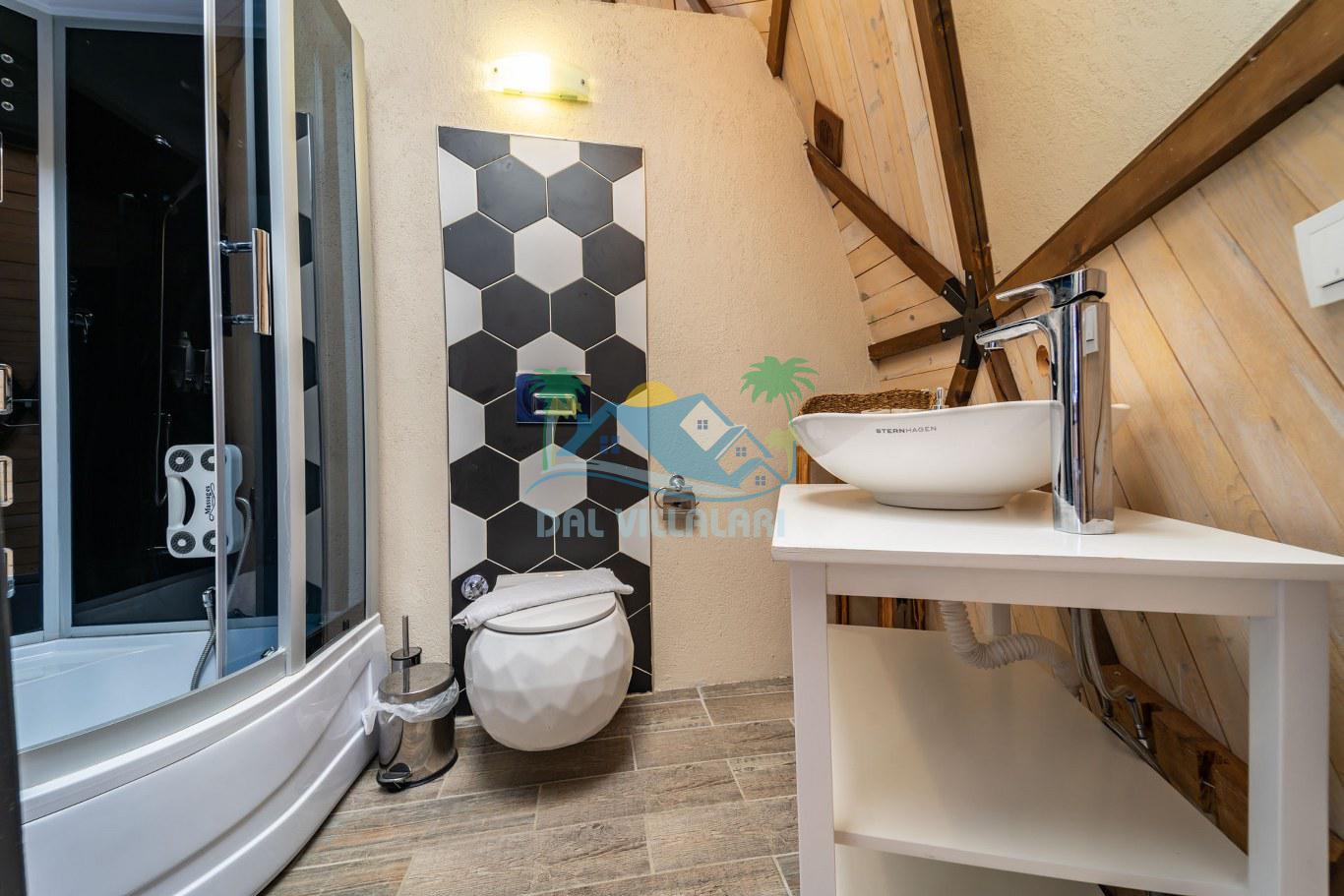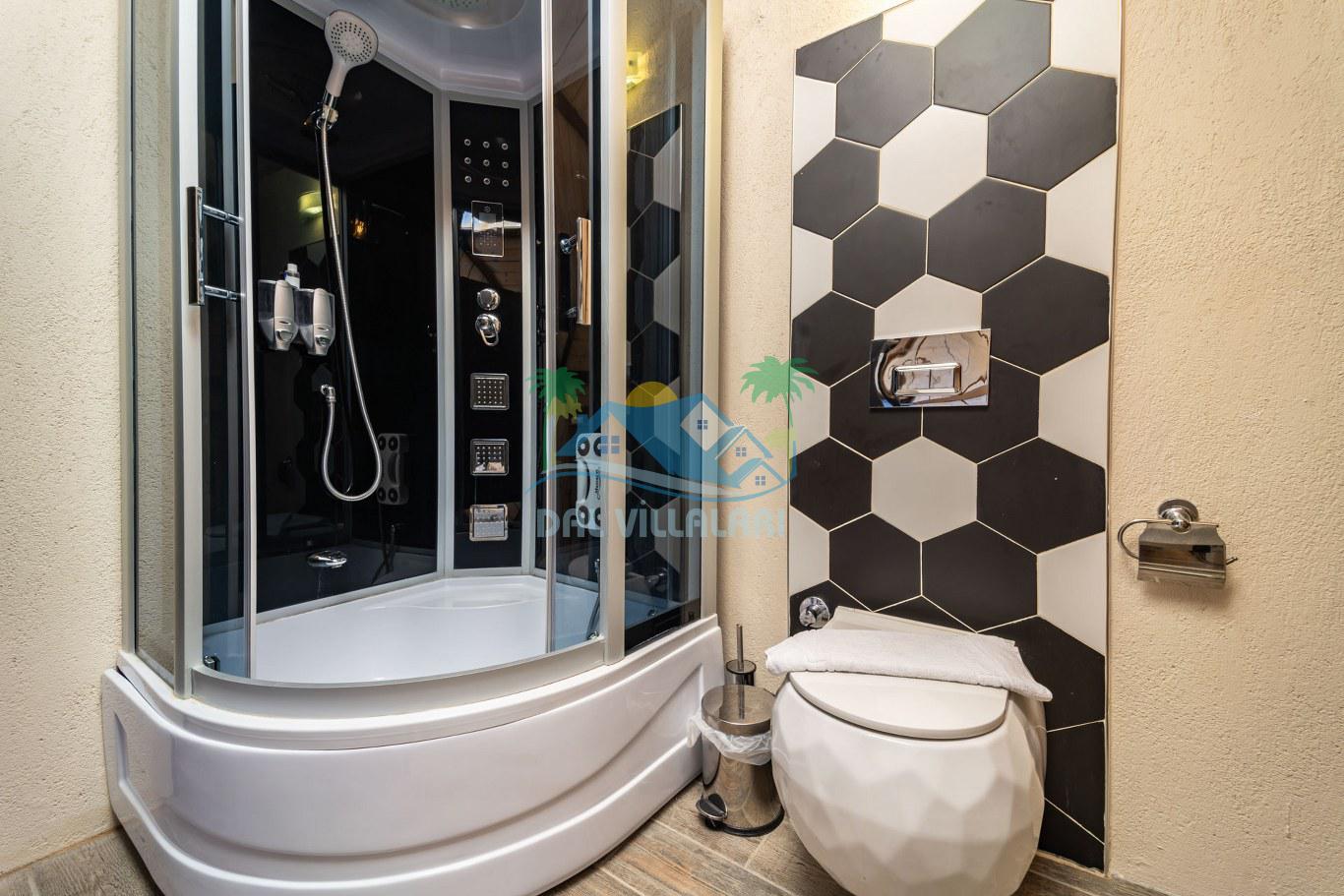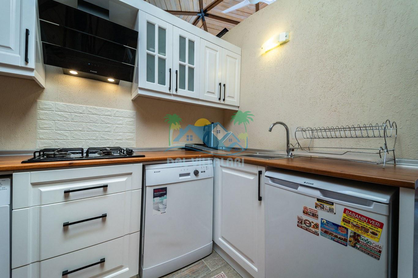 Villalarımızın iç mekanında standart olarak 2 kişilik yatak, 2 koltuk ve sehpa, makyaj masası, küçük bir yemek masası, Akıllı TV ve Uydu yayını, açık gardrop, yangın söndürme tüpü, klima ve uzaktan kumandalı tavan vantilatörü bulunmaktadır. Mutfak bölümünde ise çamaşır-bulaşık makinesi, mini buzdolabı (114 litre), mikrodalga fırın, ankastre ocak-davlumbaz ve yeterli mutfak malzemesi mevcuttur. Kısa süreli konaklayan misafirler için çay-kahve seti ve tek kullanımlık şampuan, saç kremi, sabun gibi buklet malzemeleri temin edilmektedir.