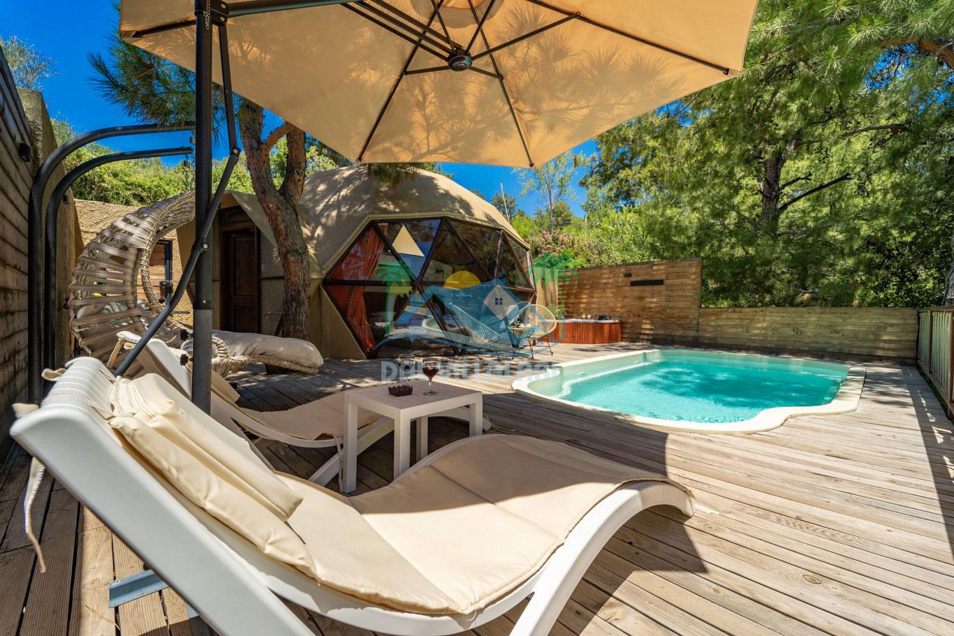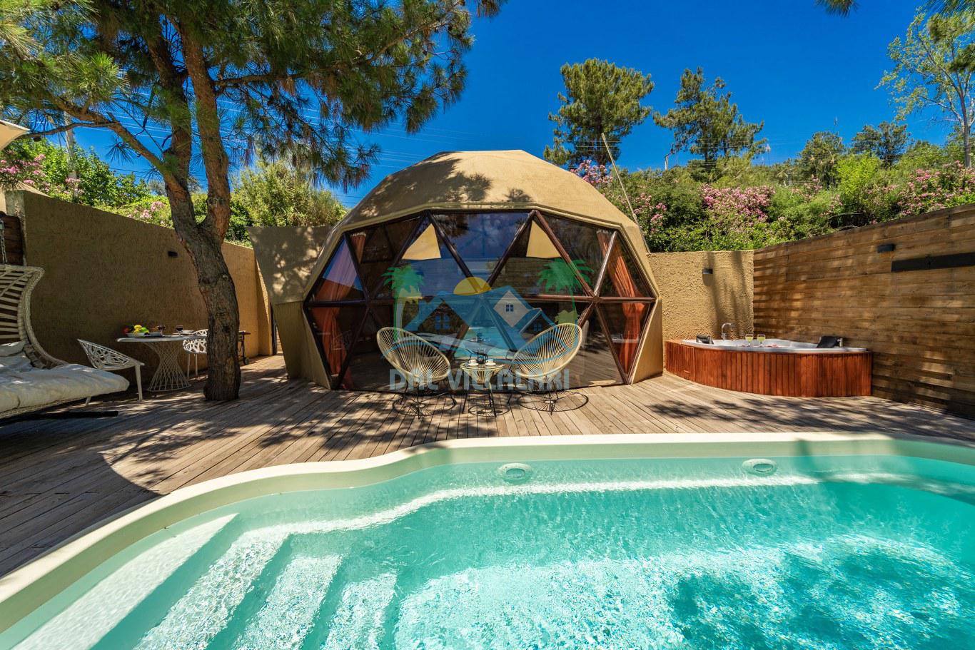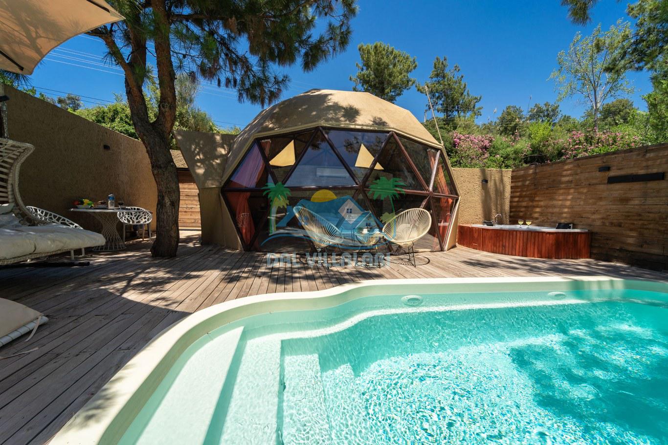 Her biri ayrı bir havuz terasına sahip olan kubbe tipi villalarımız, Türkiye'de ilk defa 7 metre çapında, 4.30 metre kubbe yüksekliğinde ve 38 metrekarelik AHŞAP yapısıyla üretilmiştir. Konforlu bir konaklama sağlamak amacıyla binalarımız, güvenlik ve iklim endişelerini göz önünde bulundurularak tasarlanmıştır.