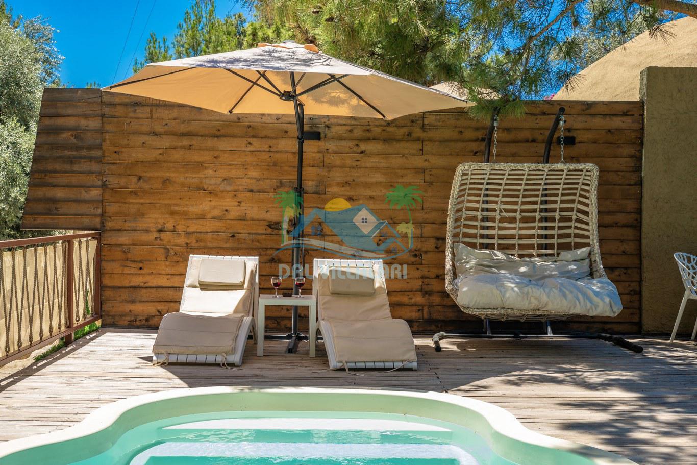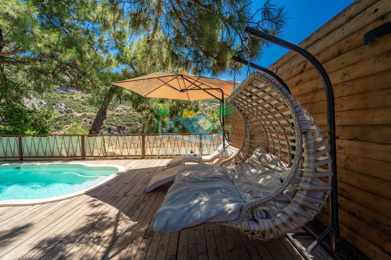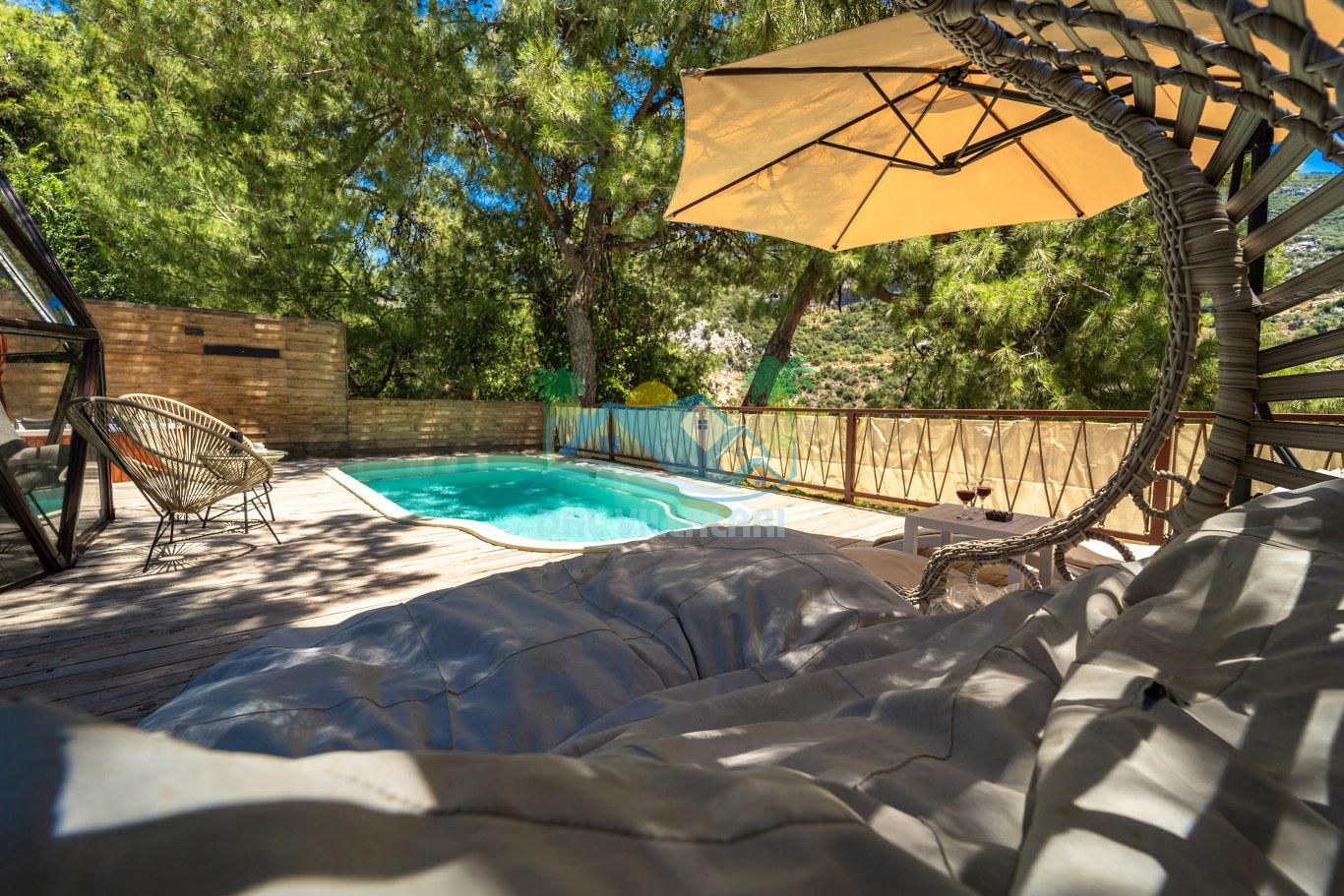 Villalarımızın dış mekanında, 6x3 metre boyutlarında ve 1.35 metre derinliğinde özel bir yüzme havuzu yer almaktadır. Basamaklı girişi ve hidromasajlı jakuzisi ile konuklara keyifli bir havuz deneyimi sunmaktadır. Ayrıca, her villada iki adet şezlong, şemsiye, salıncak, geniş yemek masası, 2 sandalye ve yumurta tipi oturma grubu standart olarak bulunmaktadır. (No1 hariç, hepsinde 2 kişilik yumurta tipi oturma grubu ve sehpası mevcuttur. No5 özel bir gölgelik geodesik kamelya ve bu kamelyada 2 adet ekstra ahşap şezlong içermektedir.)