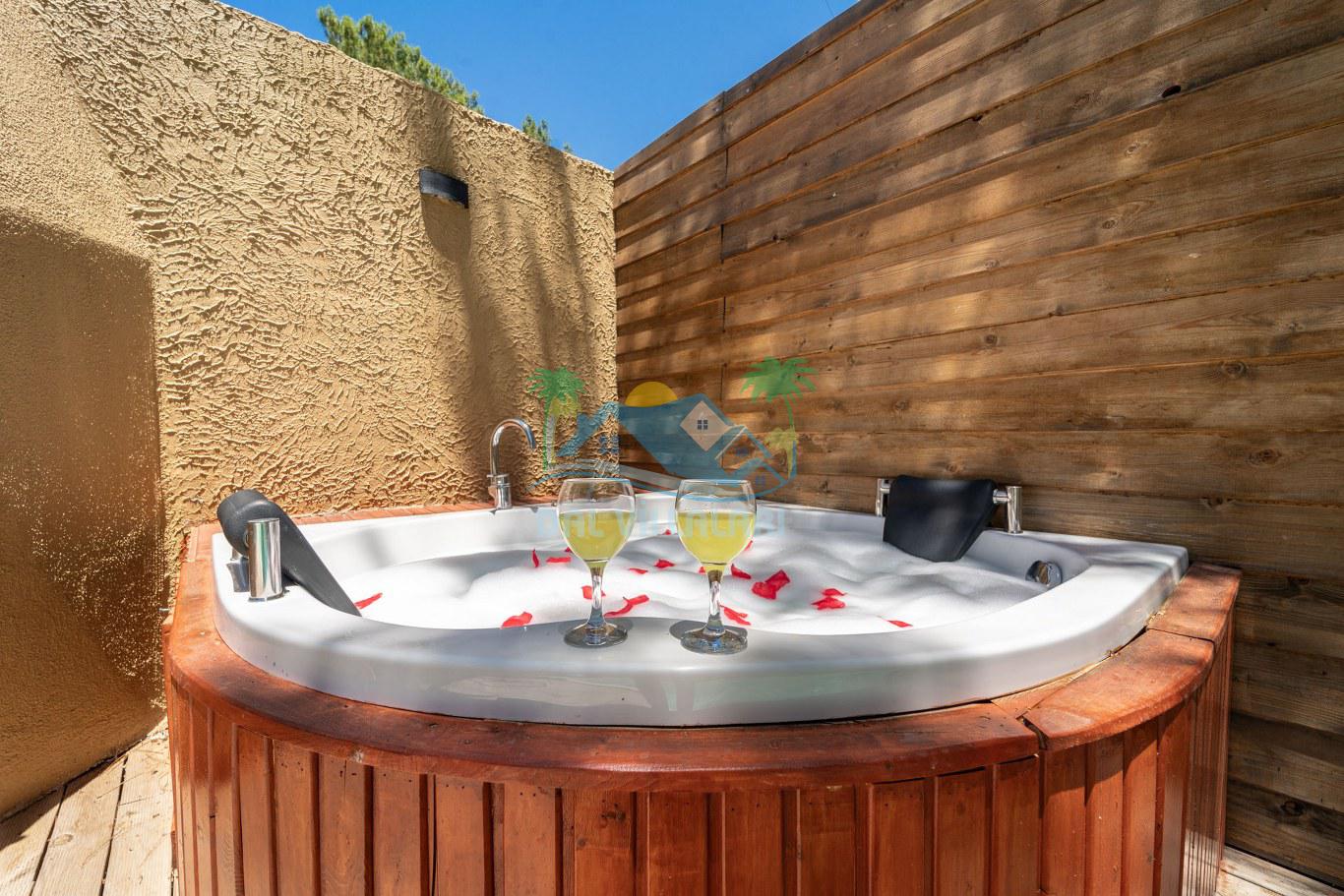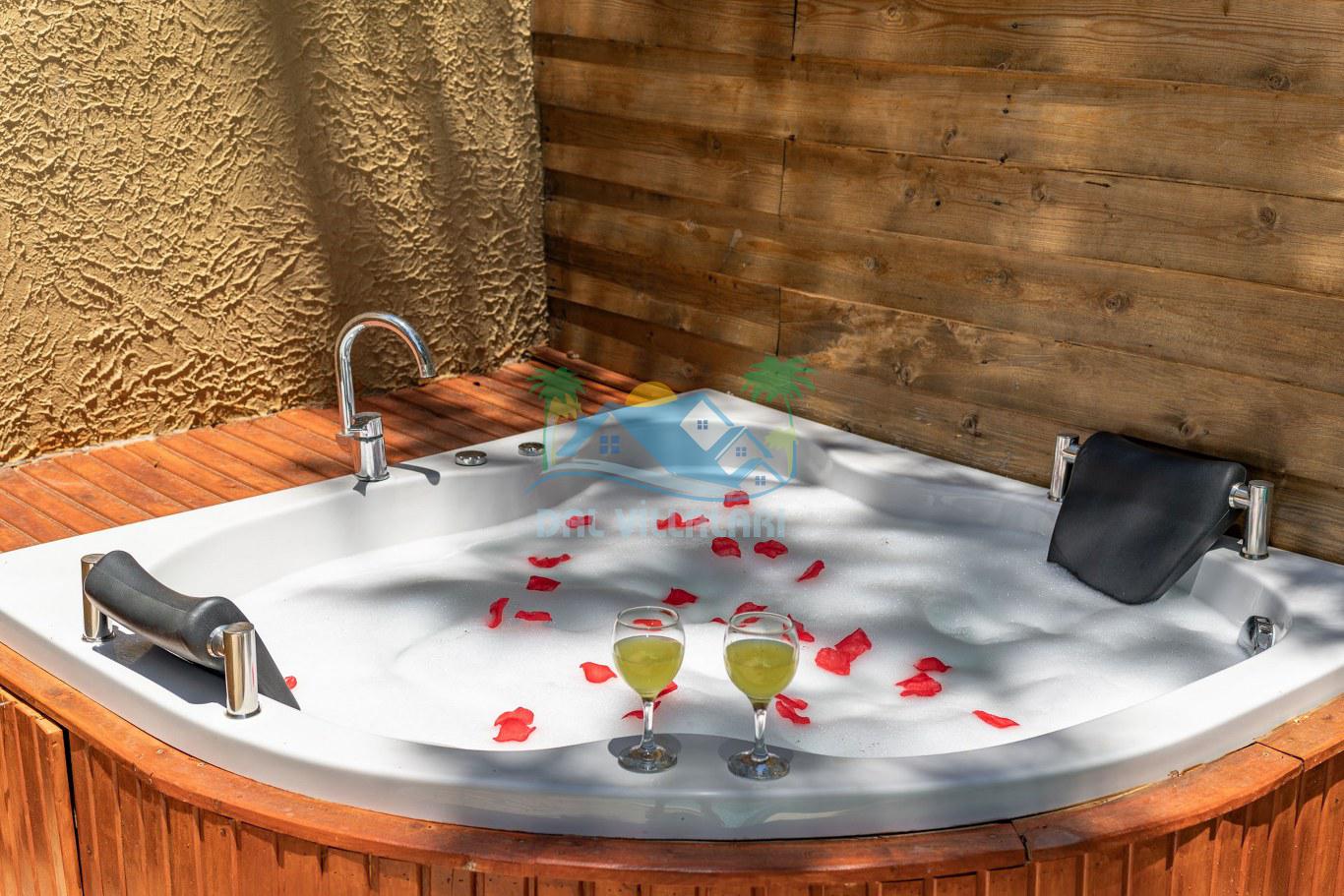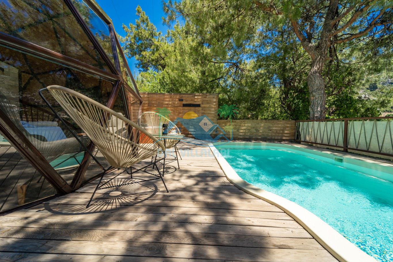Villalarımızın dış mekanında, 6x3 metre boyutlarında ve 1.35 metre derinliğinde özel bir yüzme havuzu yer almaktadır. Basamaklı girişi ve hidromasajlı jakuzisi ile konuklara keyifli bir havuz deneyimi sunmaktadır. Ayrıca, her villada iki adet şezlong, şemsiye, salıncak, geniş yemek masası, 2 sandalye ve yumurta tipi oturma grubu standart olarak bulunmaktadır. (No1 hariç, hepsinde 2 kişilik yumurta tipi oturma grubu ve sehpası mevcuttur. No5 özel bir gölgelik geodesik kamelya ve bu kamelyada 2 adet ekstra ahşap şezlong içermektedir.)