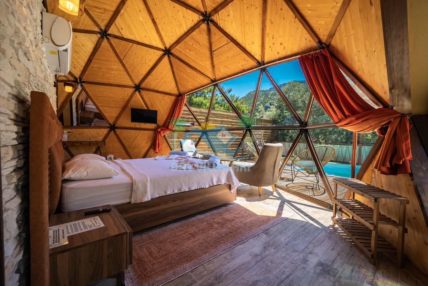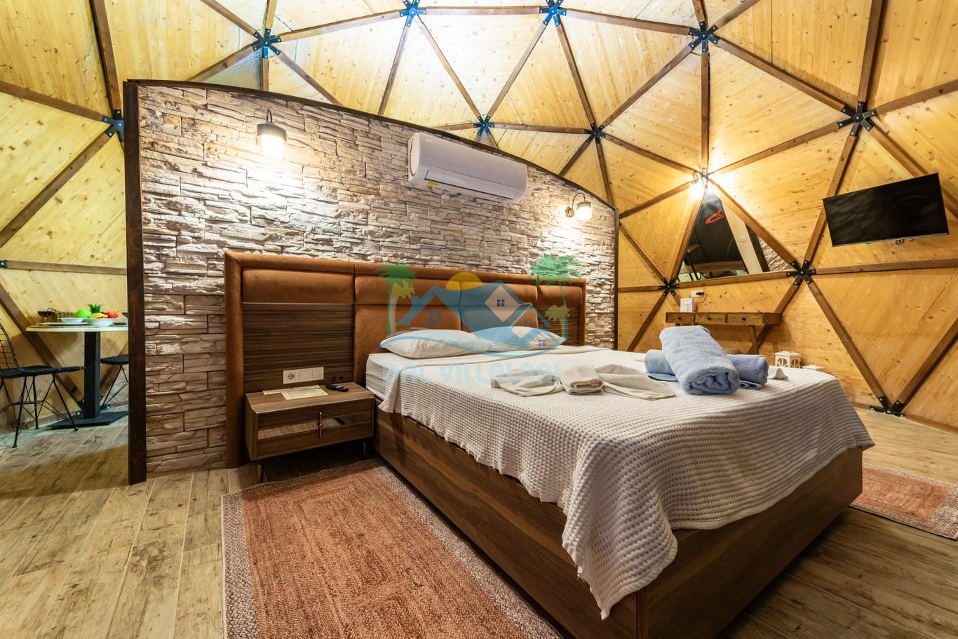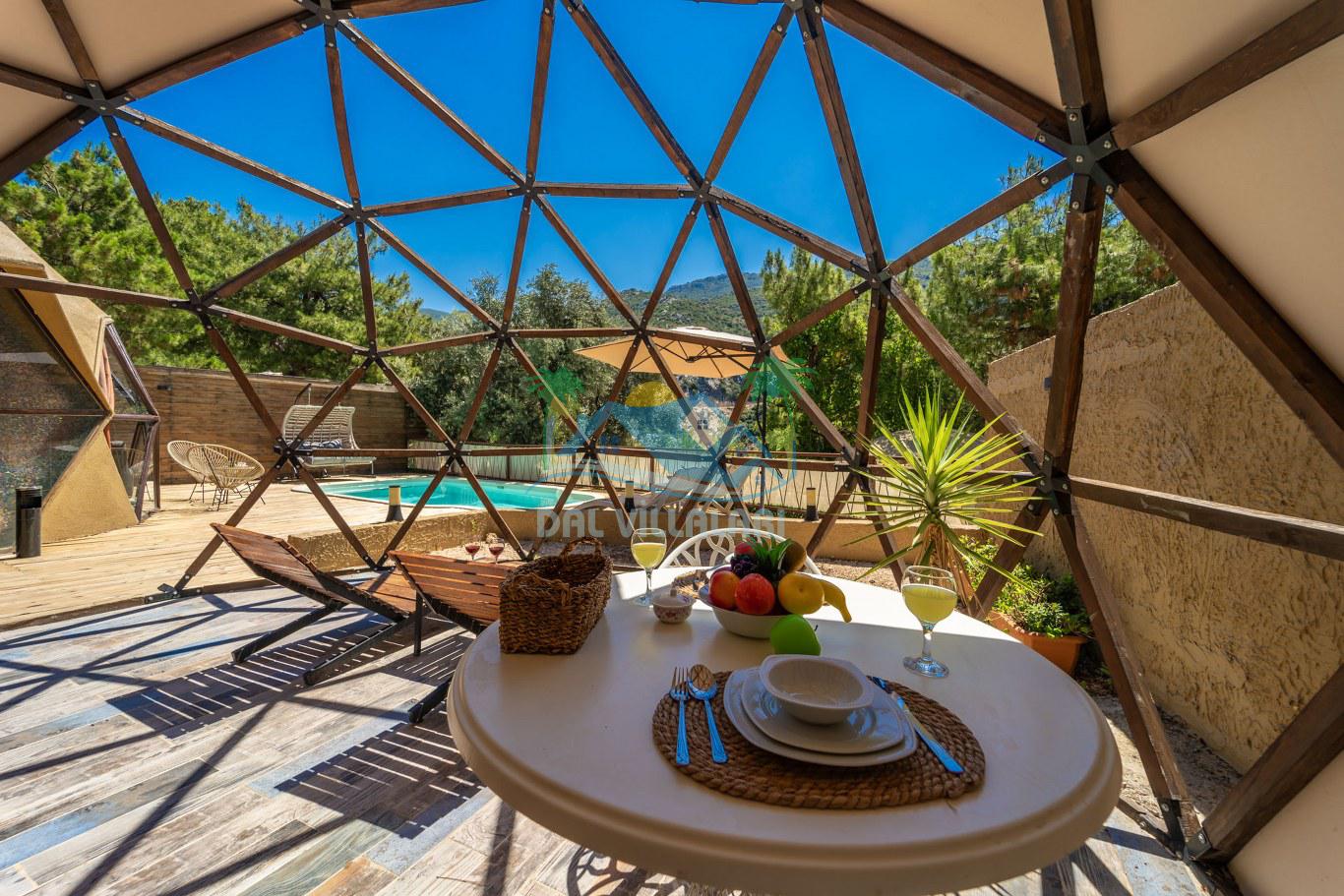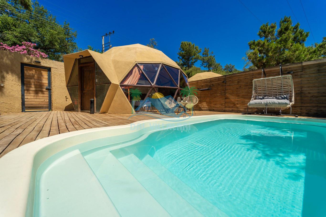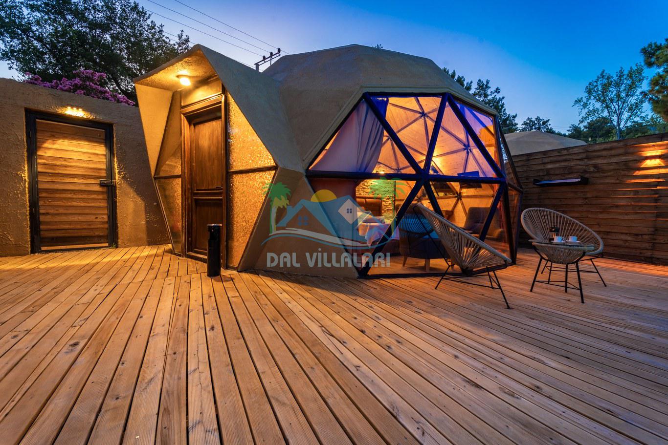 Her biri ayrı bir havuz terasına sahip olan kubbe tipi villalarımız, Türkiye'de ilk defa 7 metre çapında, 4.30 metre kubbe yüksekliğinde ve 38 metrekarelik AHŞAP yapısıyla üretilmiştir. Konforlu bir konaklama sağlamak amacıyla binalarımız, güvenlik ve iklim endişelerini göz önünde bulundurularak tasarlanmıştır.
