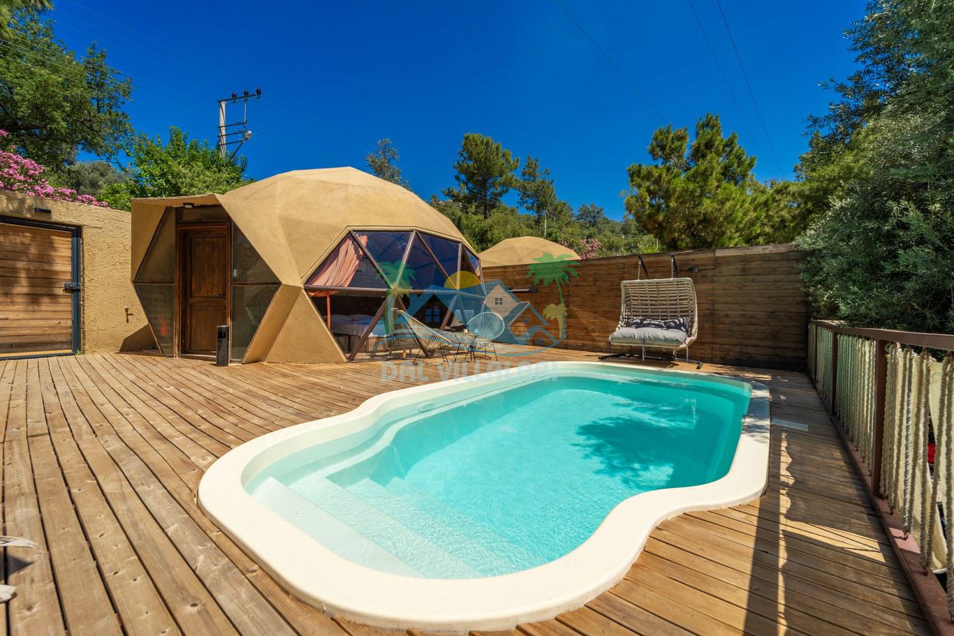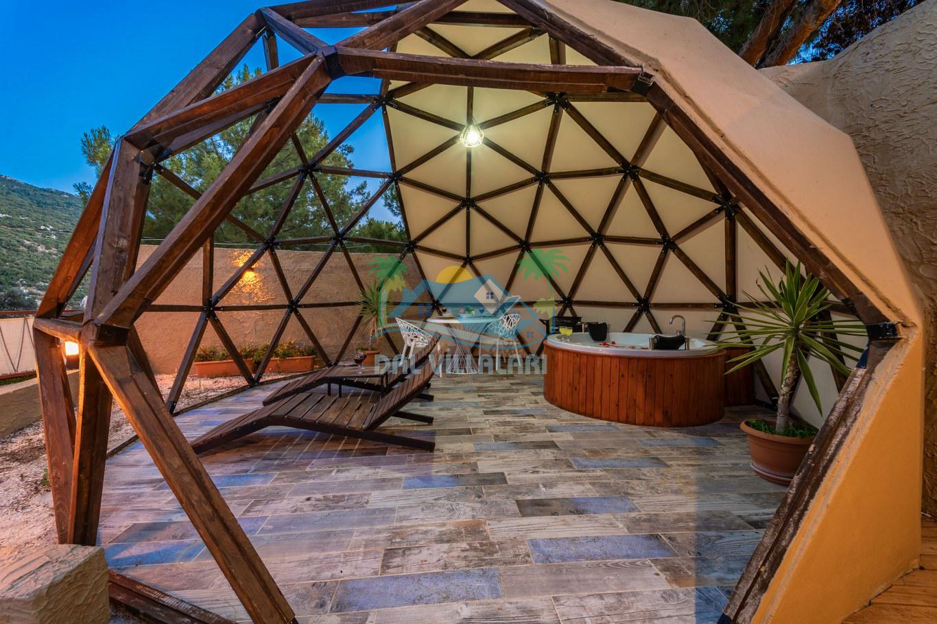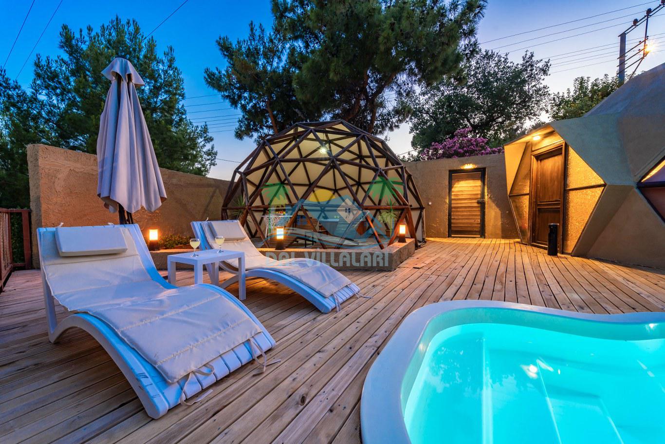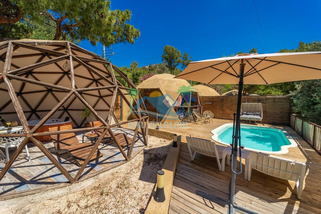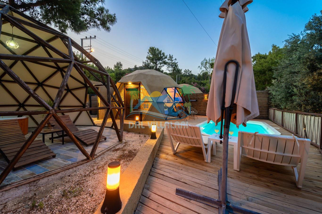 Her biri ayrı bir havuz terasına sahip olan kubbe tipi villalarımız, Türkiye'de ilk defa 7 metre çapında, 4.30 metre kubbe yüksekliğinde ve 38 metrekarelik AHŞAP yapısıyla üretilmiştir. Konforlu bir konaklama sağlamak amacıyla binalarımız, güvenlik ve iklim endişelerini göz önünde bulundurularak tasarlanmıştır.