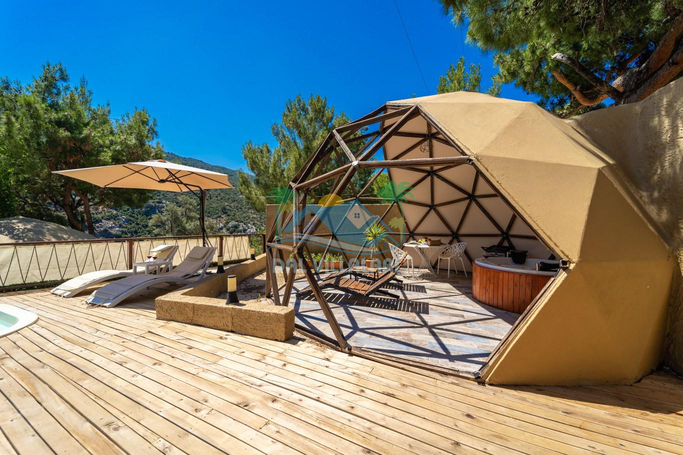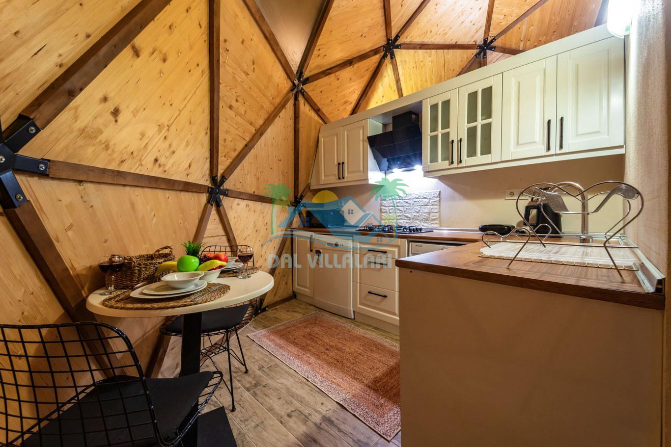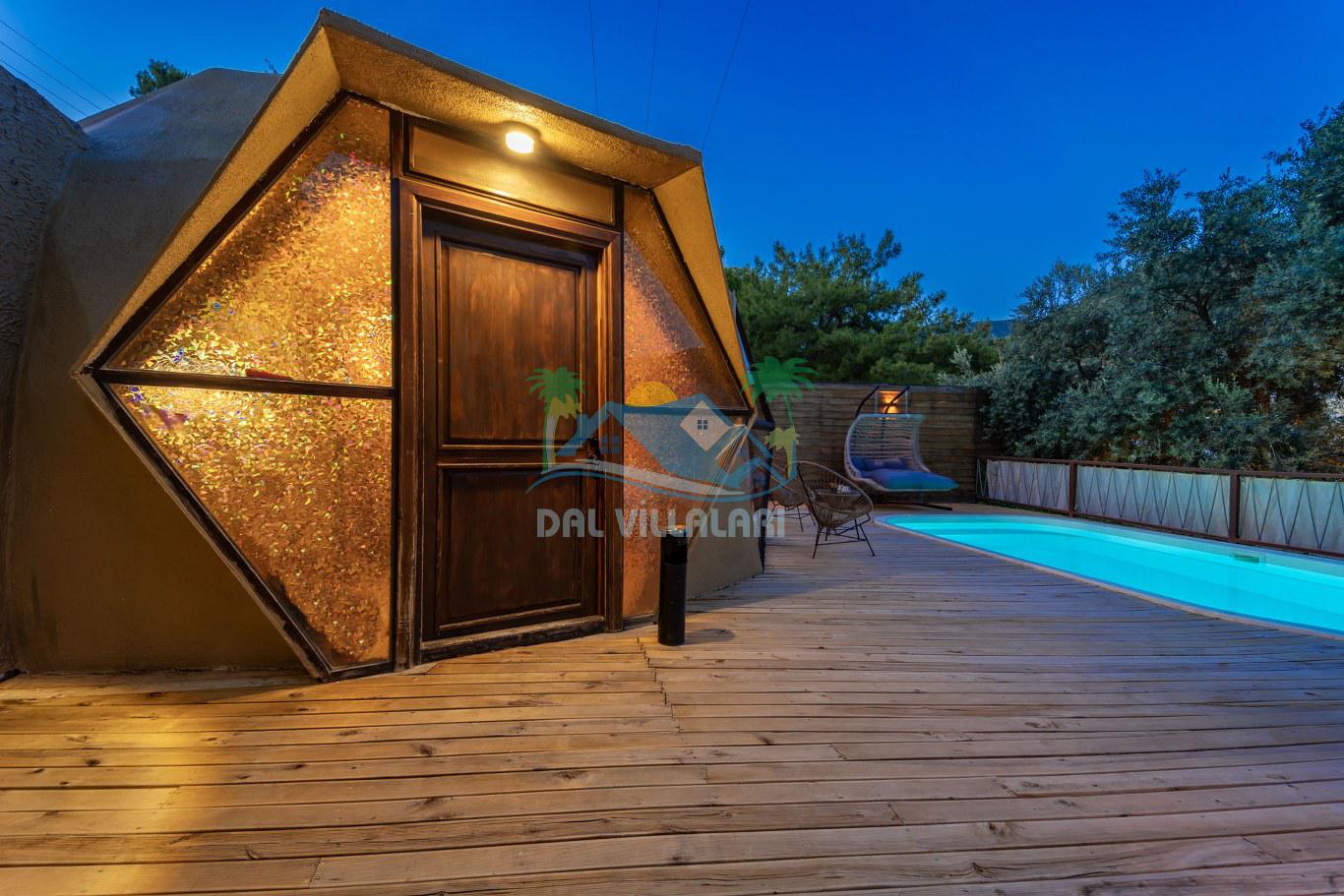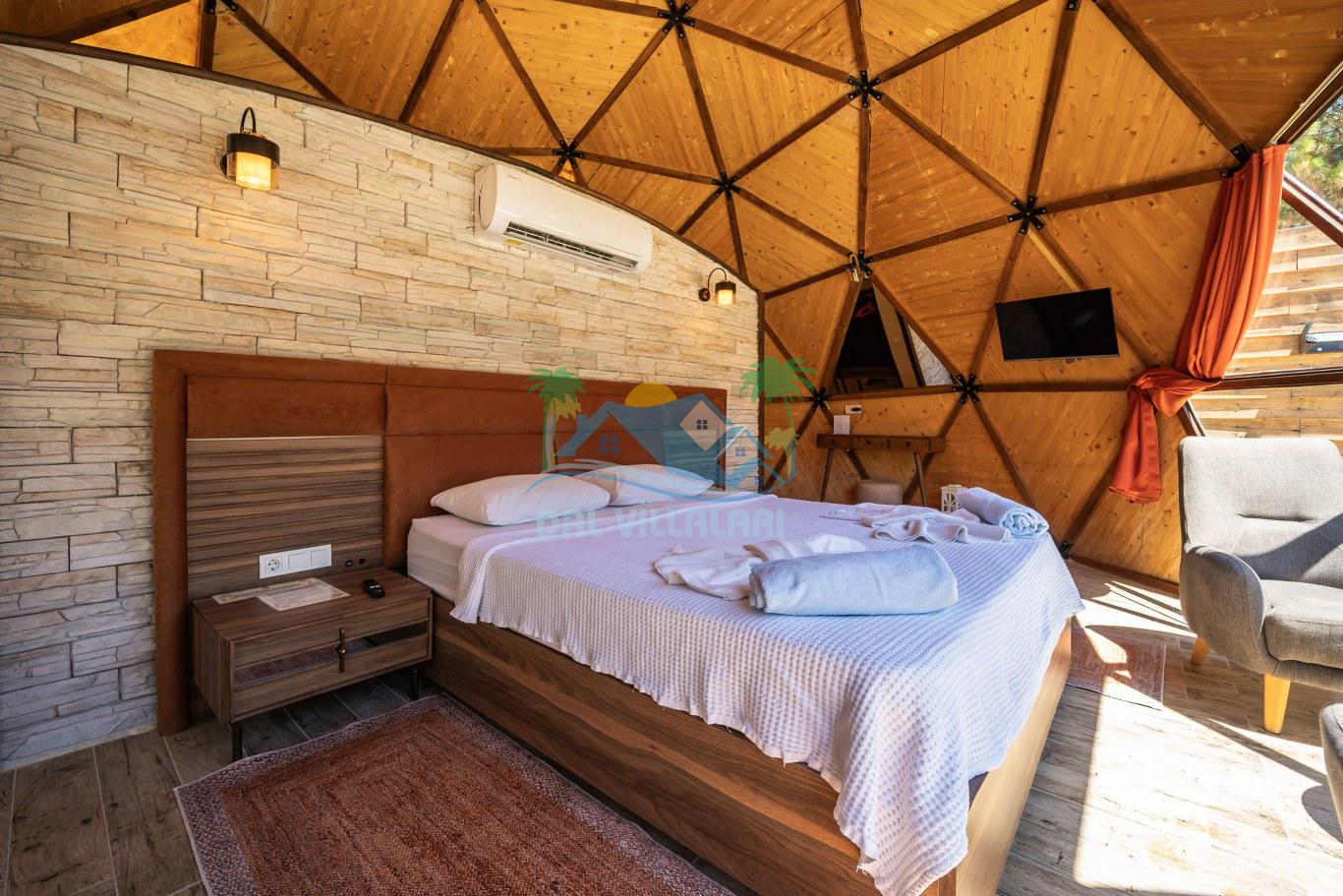 Her biri ayrı bir havuz terasına sahip olan kubbe tipi villalarımız, Türkiye'de ilk defa 7 metre çapında, 4.30 metre kubbe yüksekliğinde ve 38 metrekarelik AHŞAP yapısıyla üretilmiştir. Konforlu bir konaklama sağlamak amacıyla binalarımız, güvenlik ve iklim endişelerini göz önünde bulundurularak tasarlanmıştır.