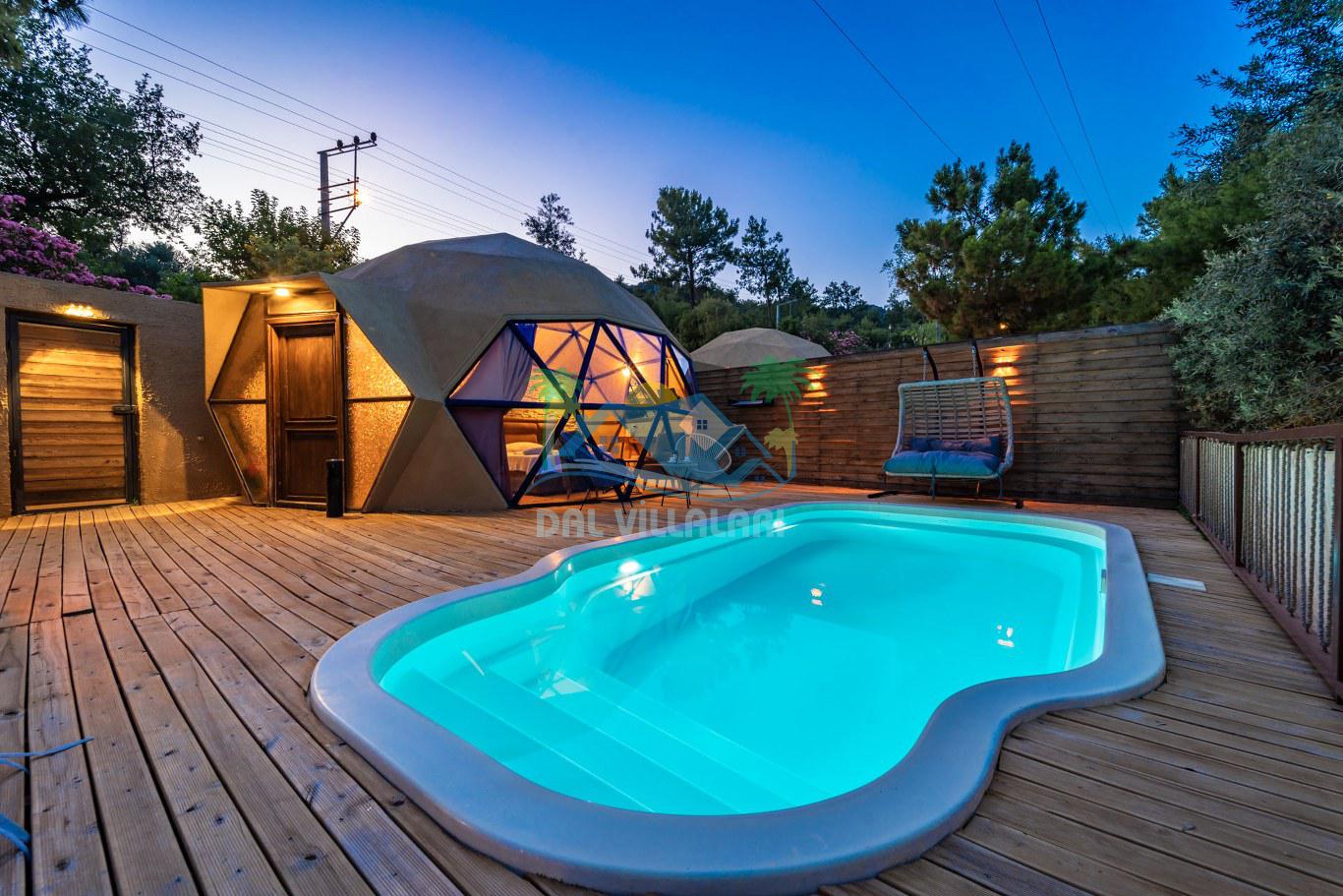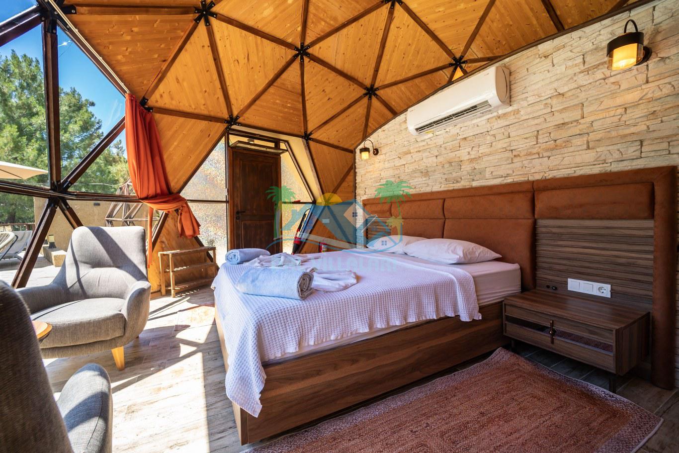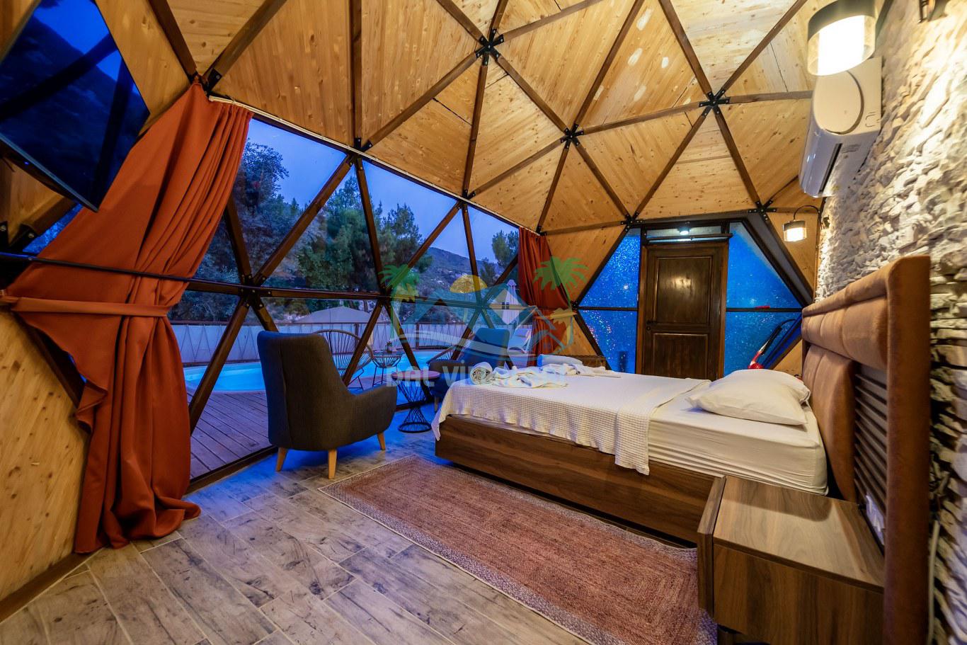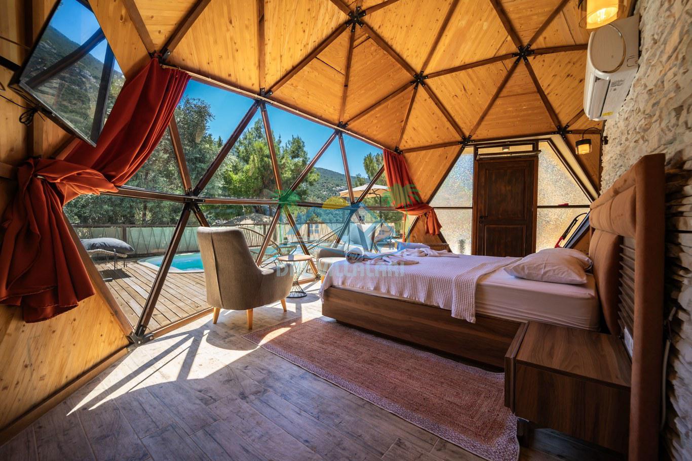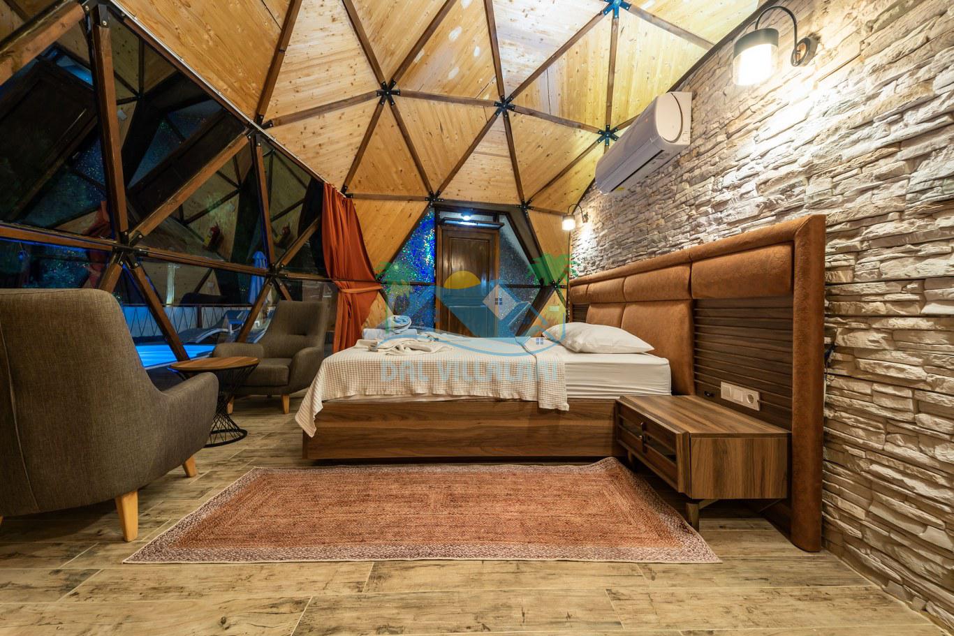 Her biri ayrı bir havuz terasına sahip olan kubbe tipi villalarımız, Türkiye'de ilk defa 7 metre çapında, 4.30 metre kubbe yüksekliğinde ve 38 metrekarelik AHŞAP yapısıyla üretilmiştir. Konforlu bir konaklama sağlamak amacıyla binalarımız, güvenlik ve iklim endişelerini göz önünde bulundurularak tasarlanmıştır.