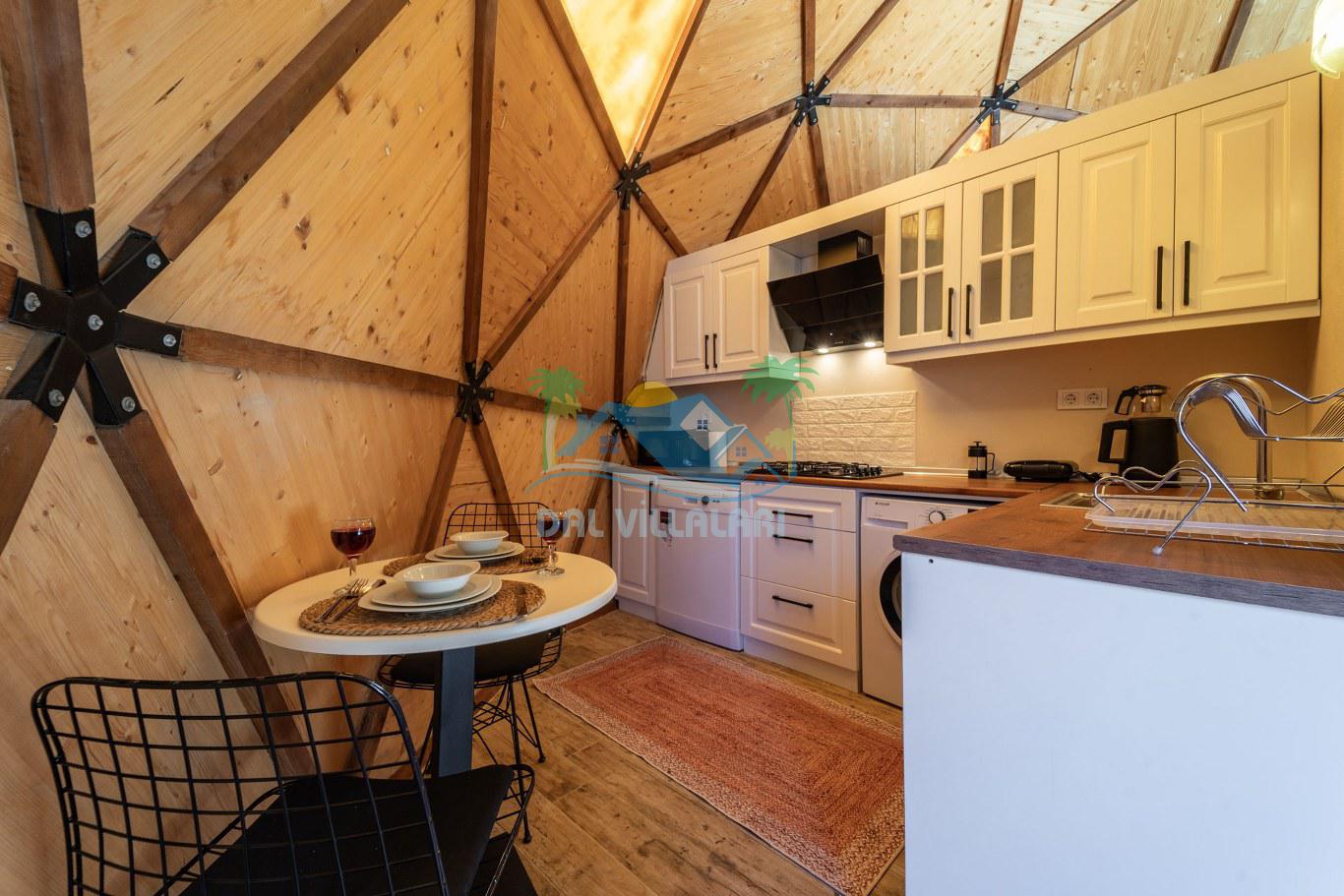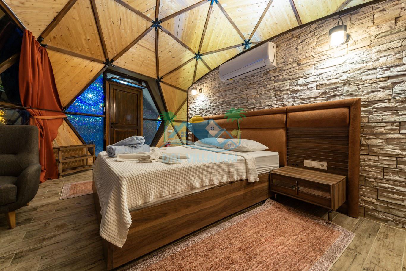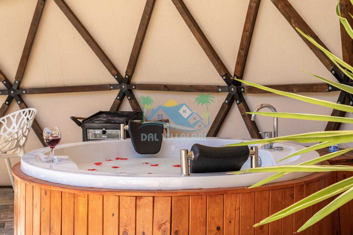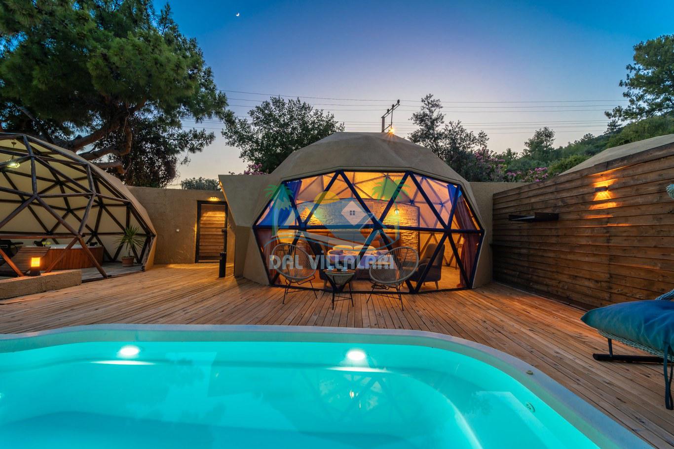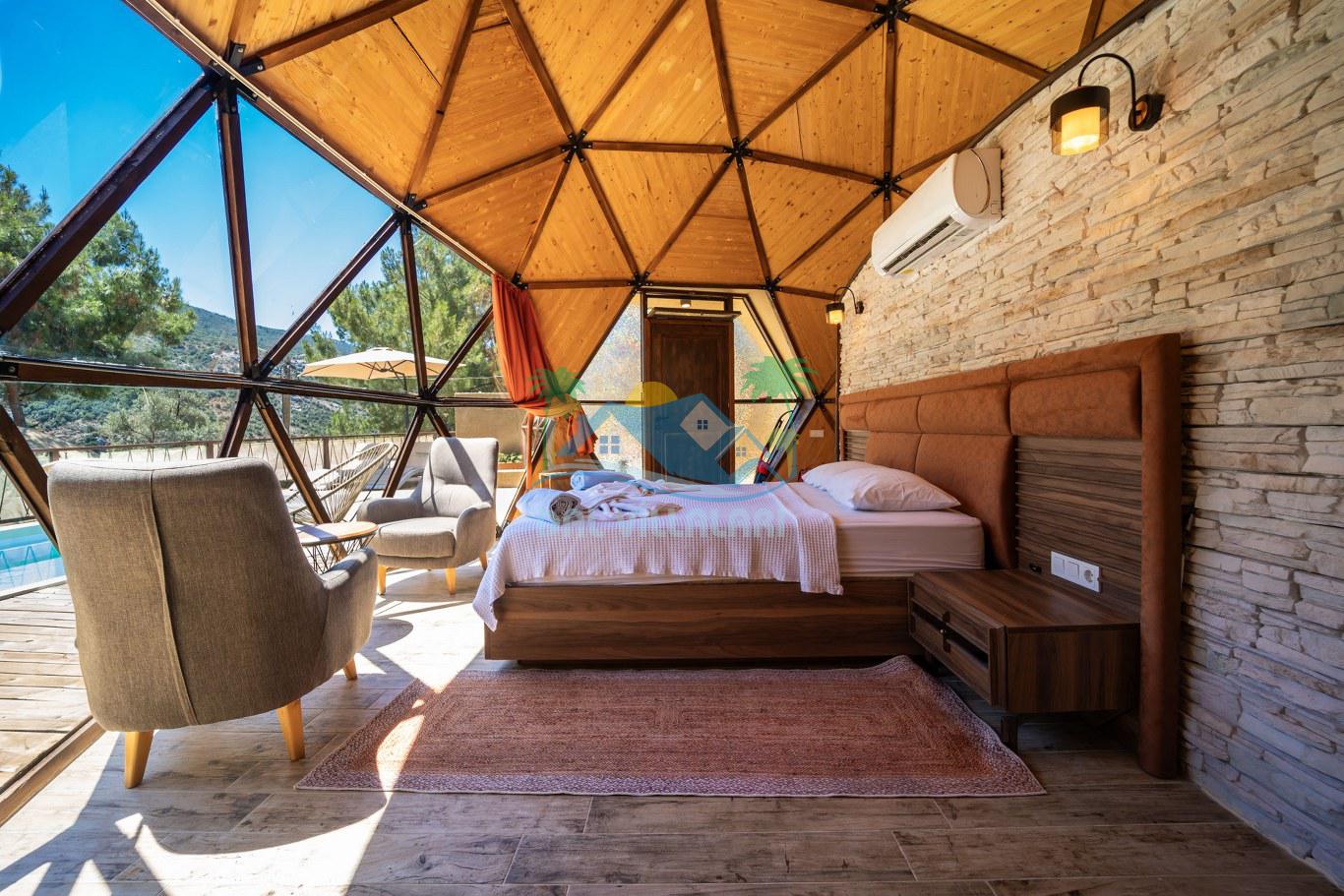 Her biri ayrı bir havuz terasına sahip olan kubbe tipi villalarımız, Türkiye'de ilk defa 7 metre çapında, 4.30 metre kubbe yüksekliğinde ve 38 metrekarelik AHŞAP yapısıyla üretilmiştir. Konforlu bir konaklama sağlamak amacıyla binalarımız, güvenlik ve iklim endişelerini göz önünde bulundurularak tasarlanmıştır.