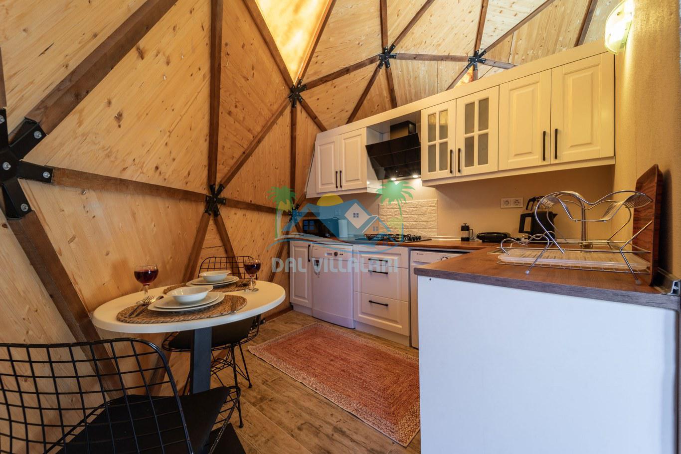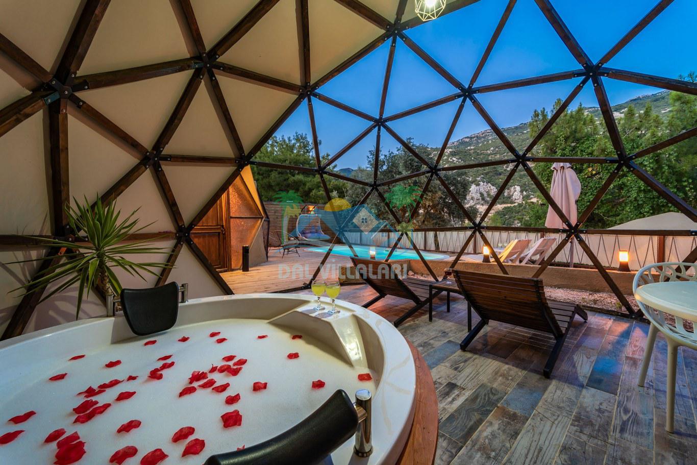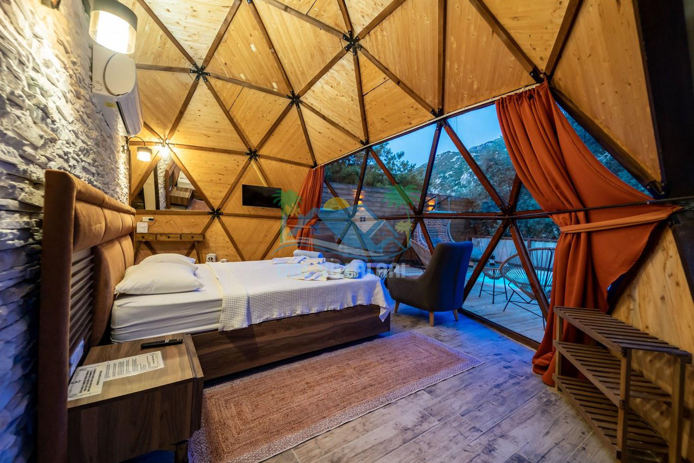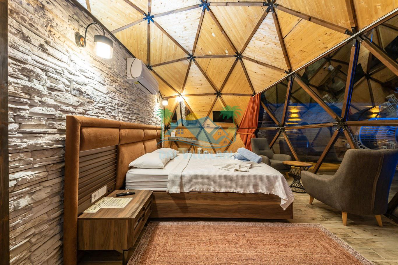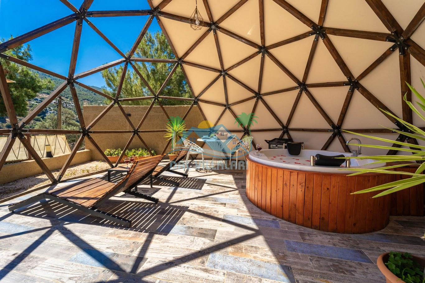 Her biri ayrı bir havuz terasına sahip olan kubbe tipi villalarımız, Türkiye'de ilk defa 7 metre çapında, 4.30 metre kubbe yüksekliğinde ve 38 metrekarelik AHŞAP yapısıyla üretilmiştir. Konforlu bir konaklama sağlamak amacıyla binalarımız, güvenlik ve iklim endişelerini göz önünde bulundurularak tasarlanmıştır.