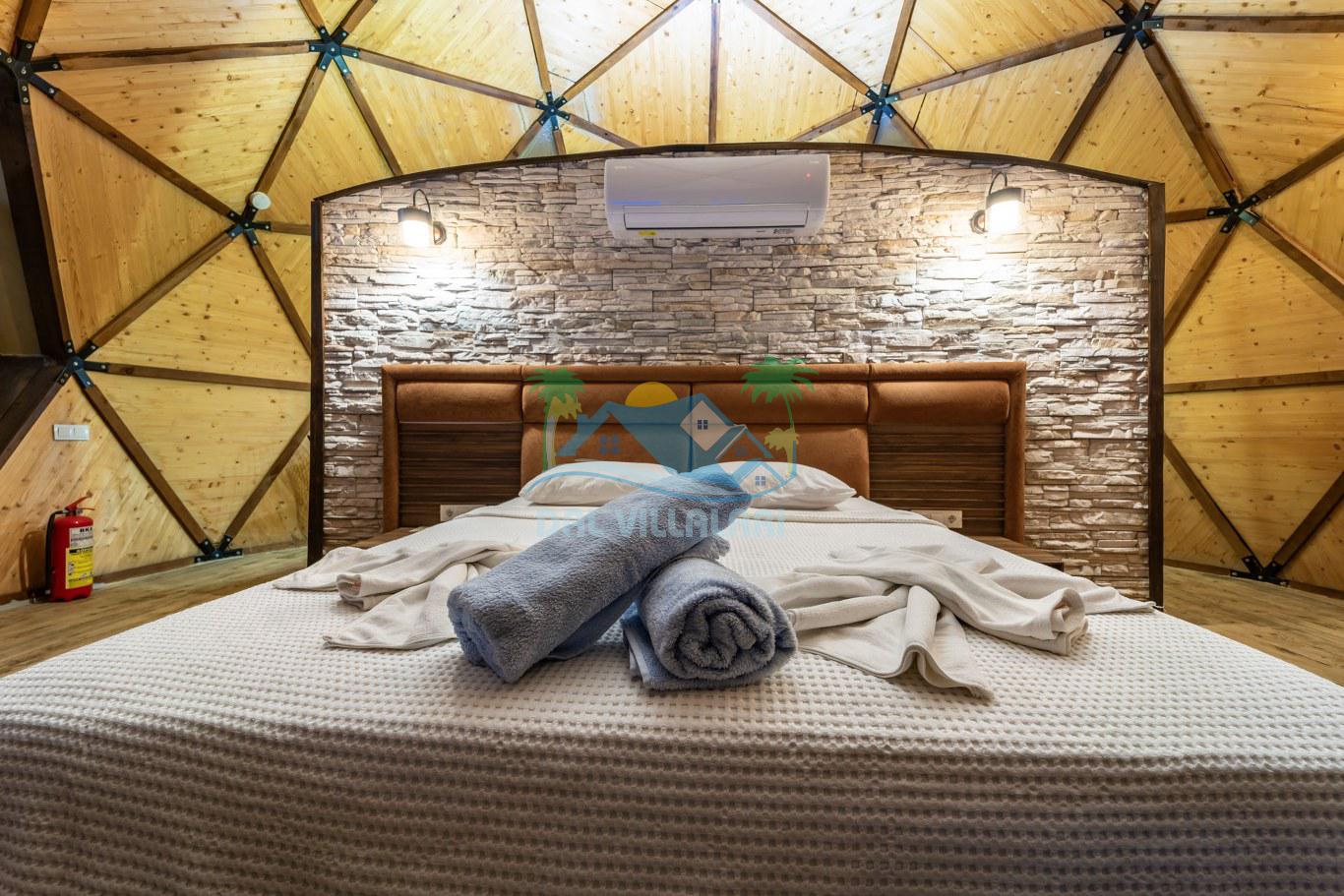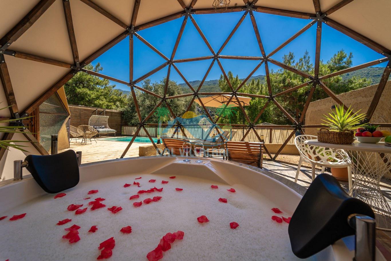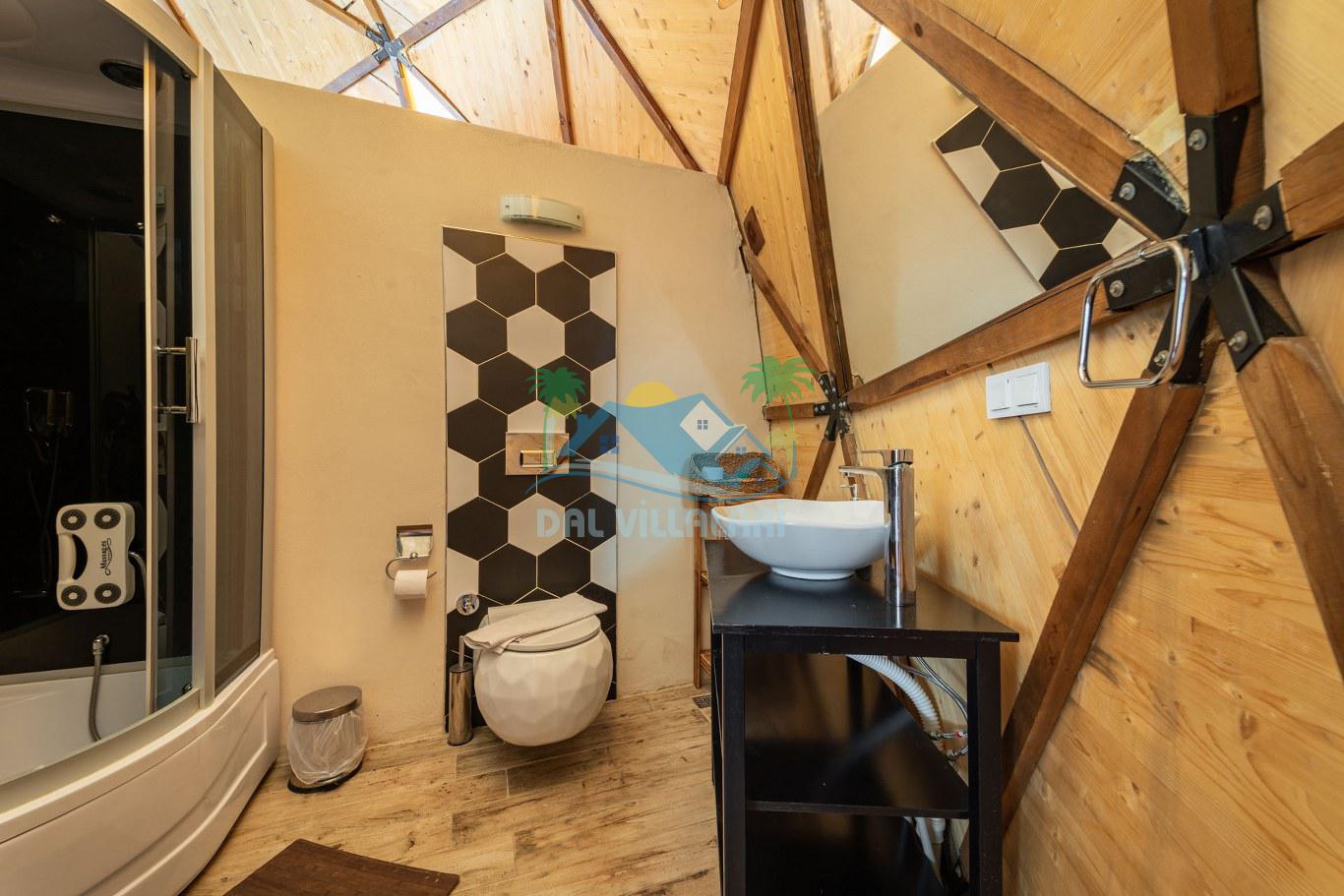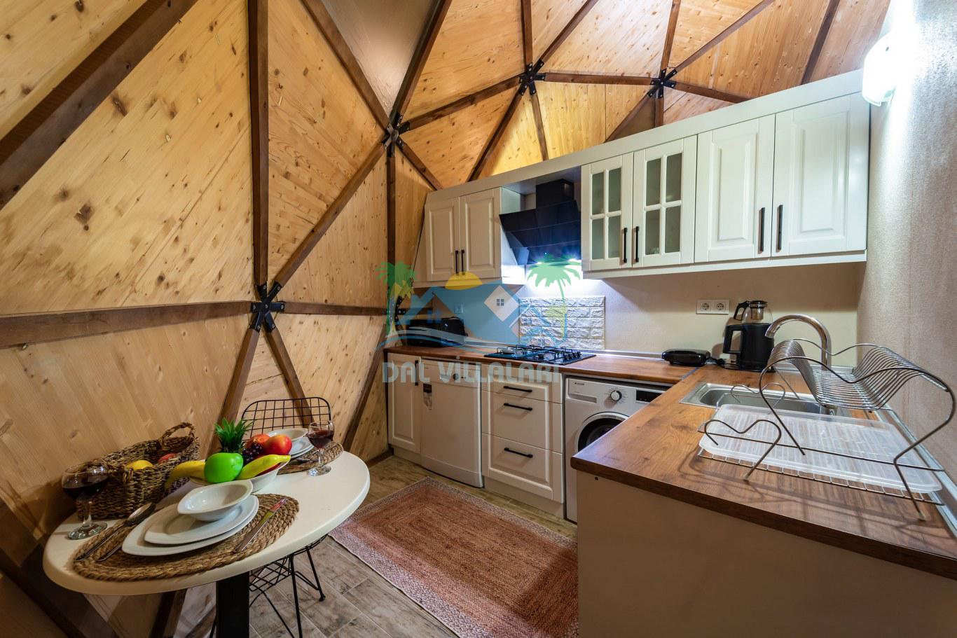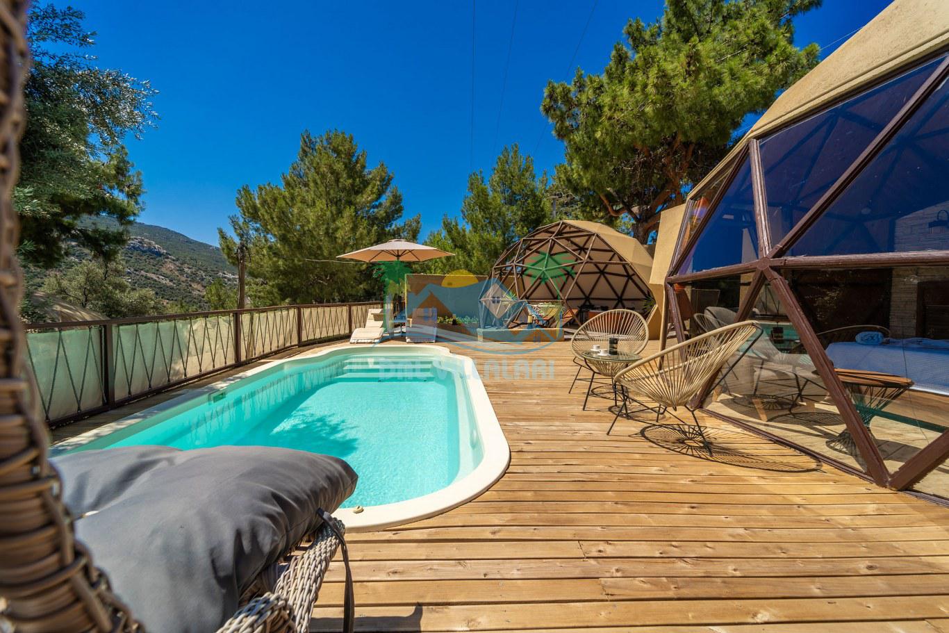 Her biri ayrı bir havuz terasına sahip olan kubbe tipi villalarımız, Türkiye'de ilk defa 7 metre çapında, 4.30 metre kubbe yüksekliğinde ve 38 metrekarelik AHŞAP yapısıyla üretilmiştir. Konforlu bir konaklama sağlamak amacıyla binalarımız, güvenlik ve iklim endişelerini göz önünde bulundurularak tasarlanmıştır.