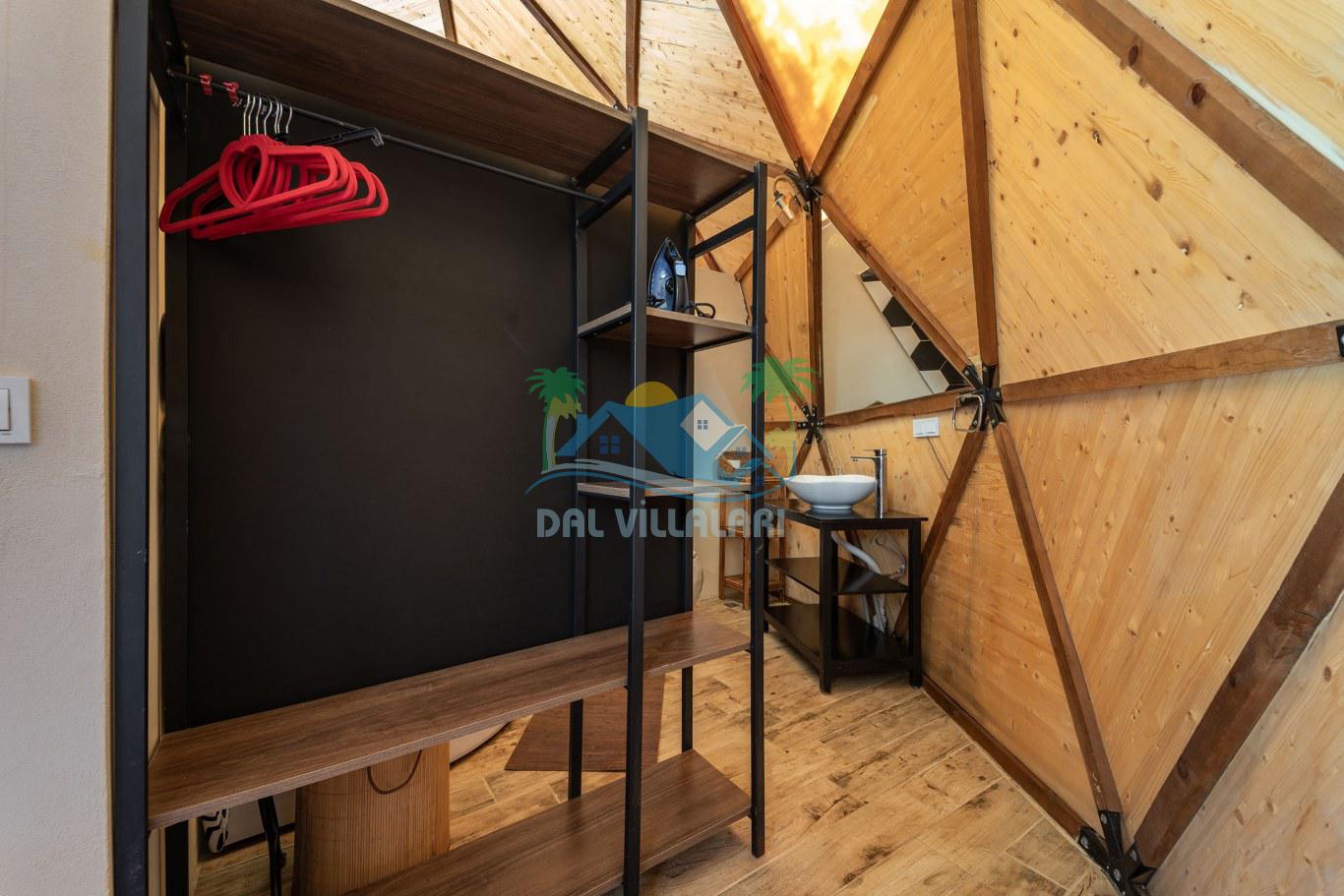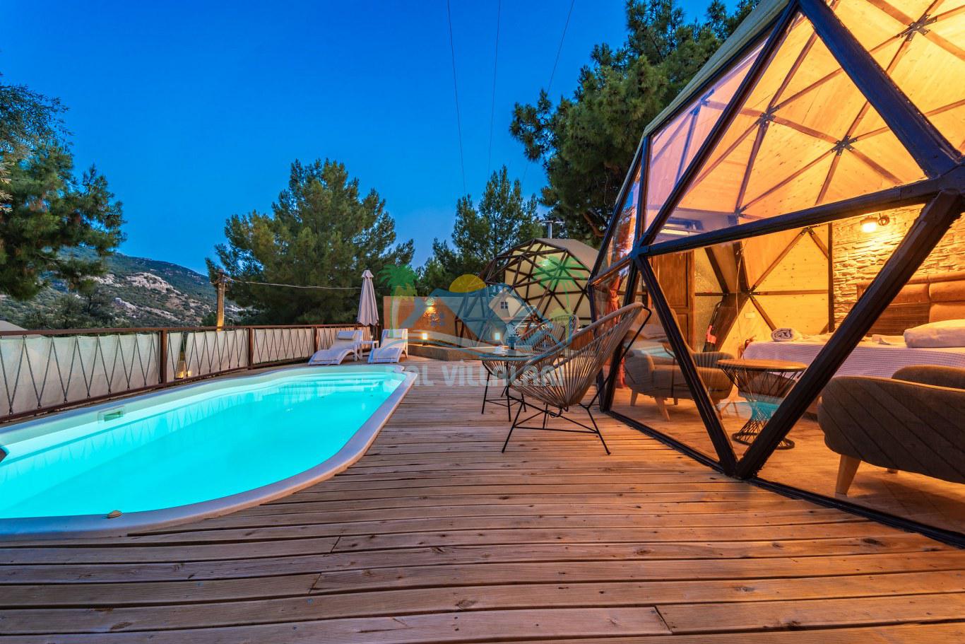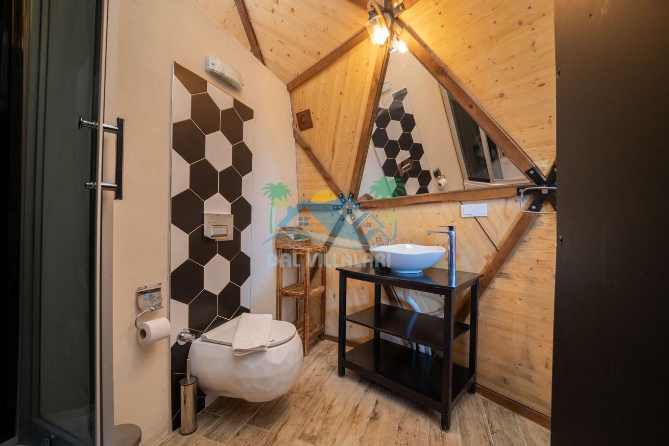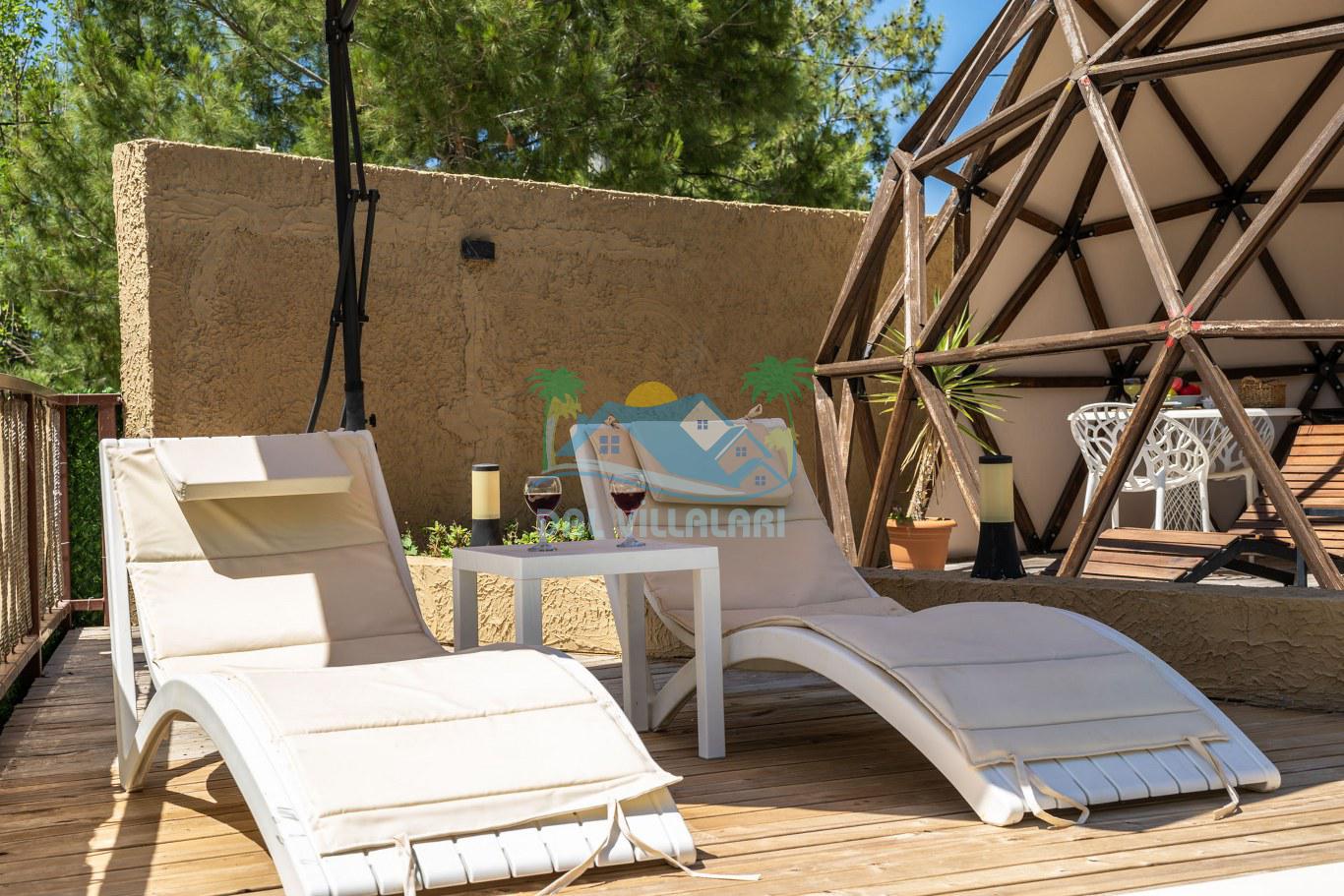 Her biri ayrı bir havuz terasına sahip olan kubbe tipi villalarımız, Türkiye'de ilk defa 7 metre çapında, 4.30 metre kubbe yüksekliğinde ve 38 metrekarelik AHŞAP yapısıyla üretilmiştir. Konforlu bir konaklama sağlamak amacıyla binalarımız, güvenlik ve iklim endişelerini göz önünde bulundurularak tasarlanmıştır.