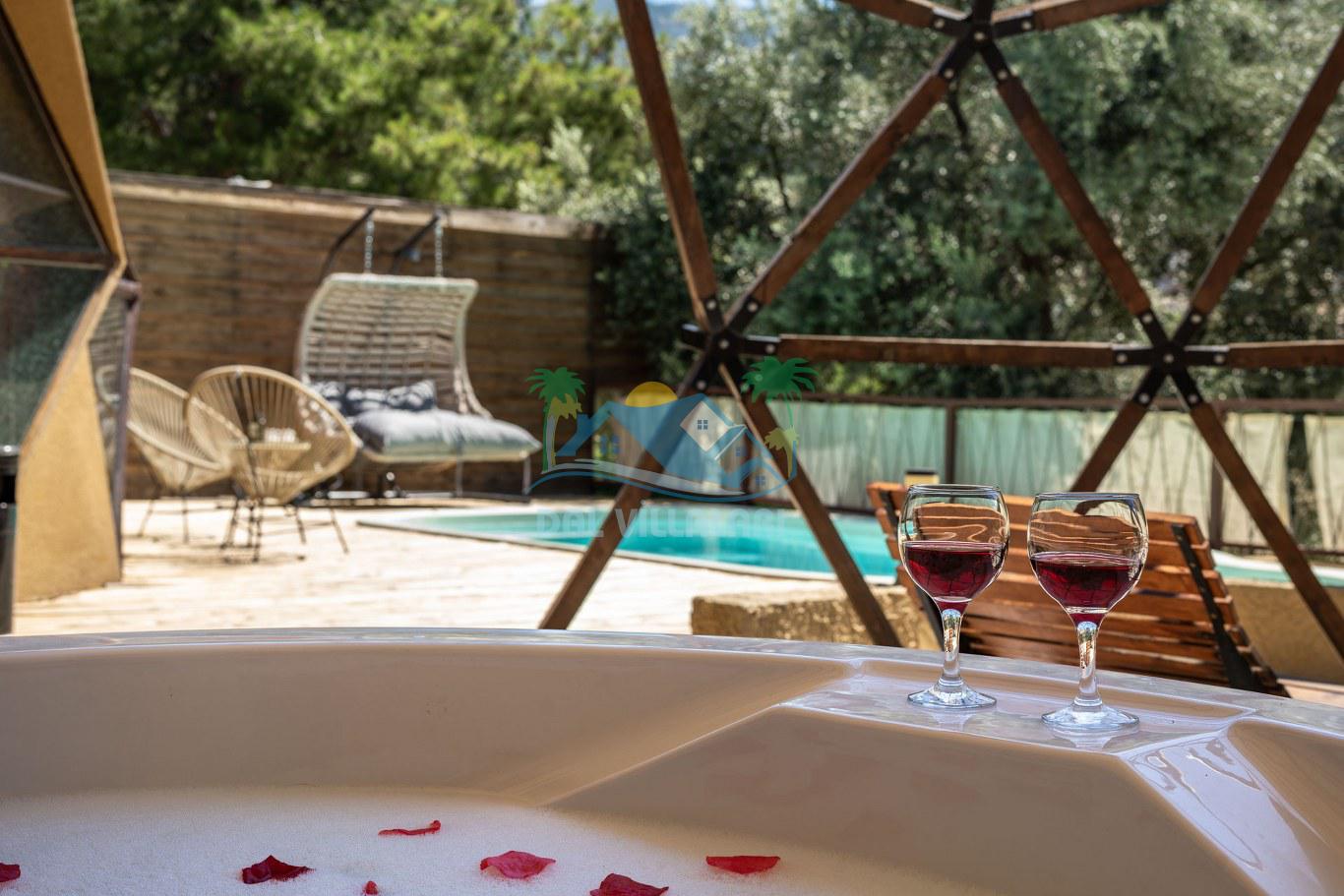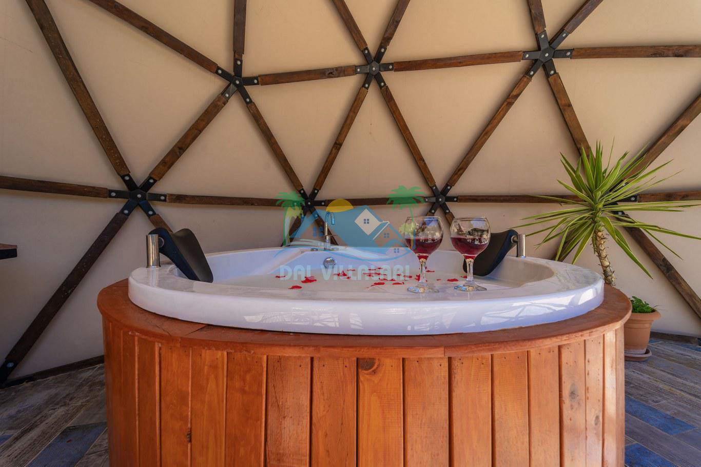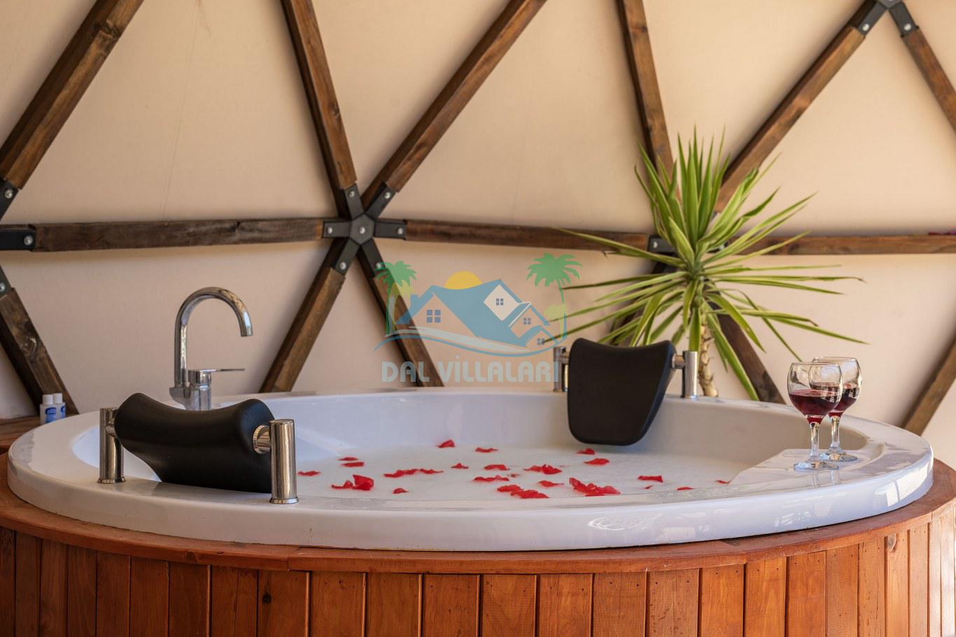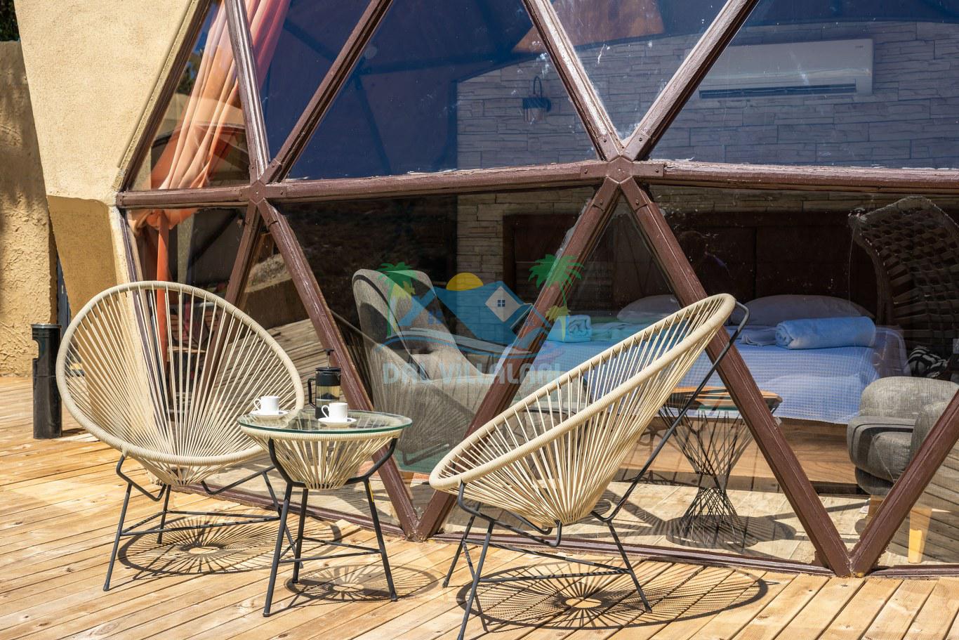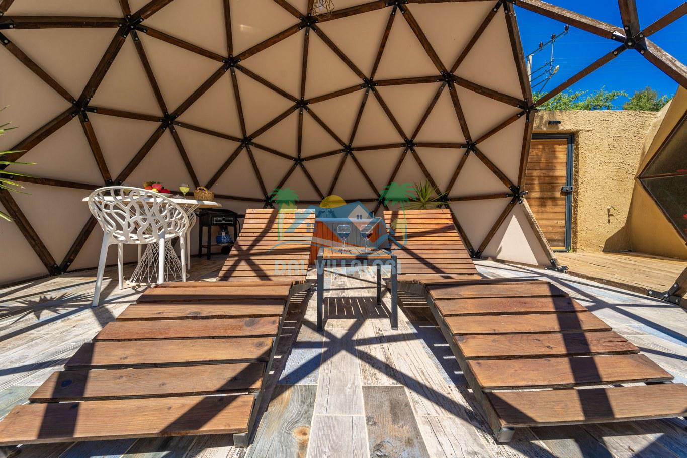 Her biri ayrı bir havuz terasına sahip olan kubbe tipi villalarımız, Türkiye'de ilk defa 7 metre çapında, 4.30 metre kubbe yüksekliğinde ve 38 metrekarelik AHŞAP yapısıyla üretilmiştir. Konforlu bir konaklama sağlamak amacıyla binalarımız, güvenlik ve iklim endişelerini göz önünde bulundurularak tasarlanmıştır.