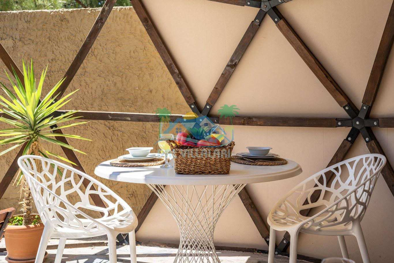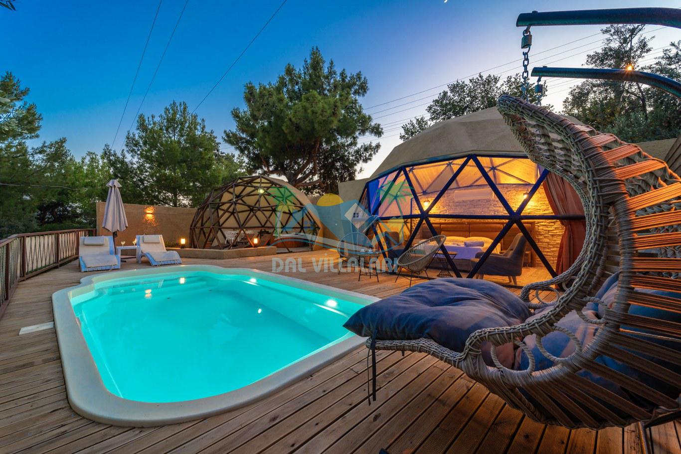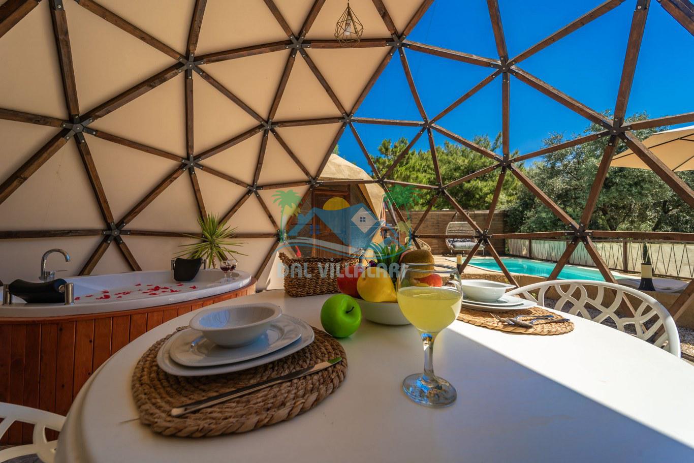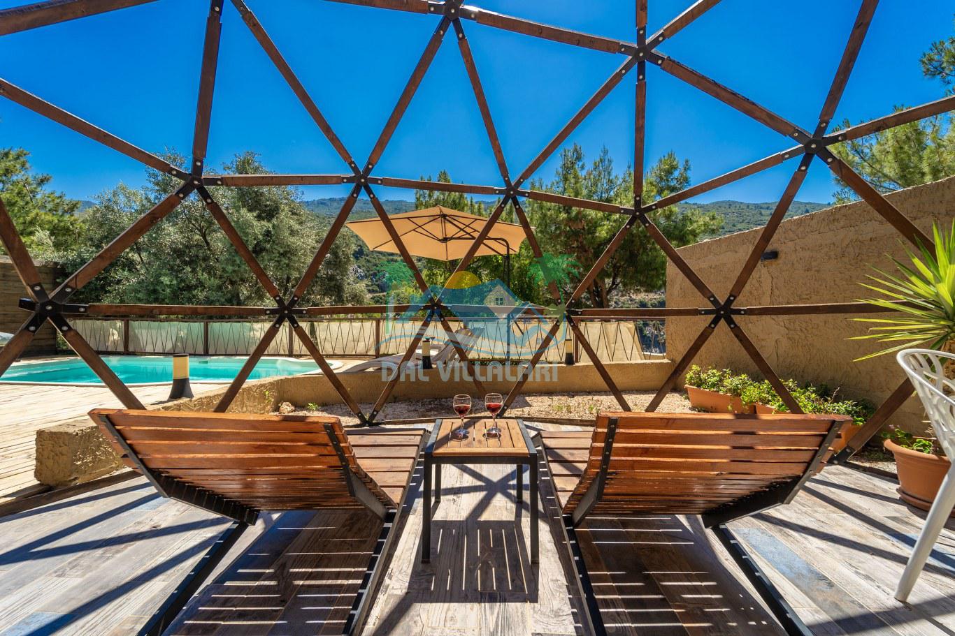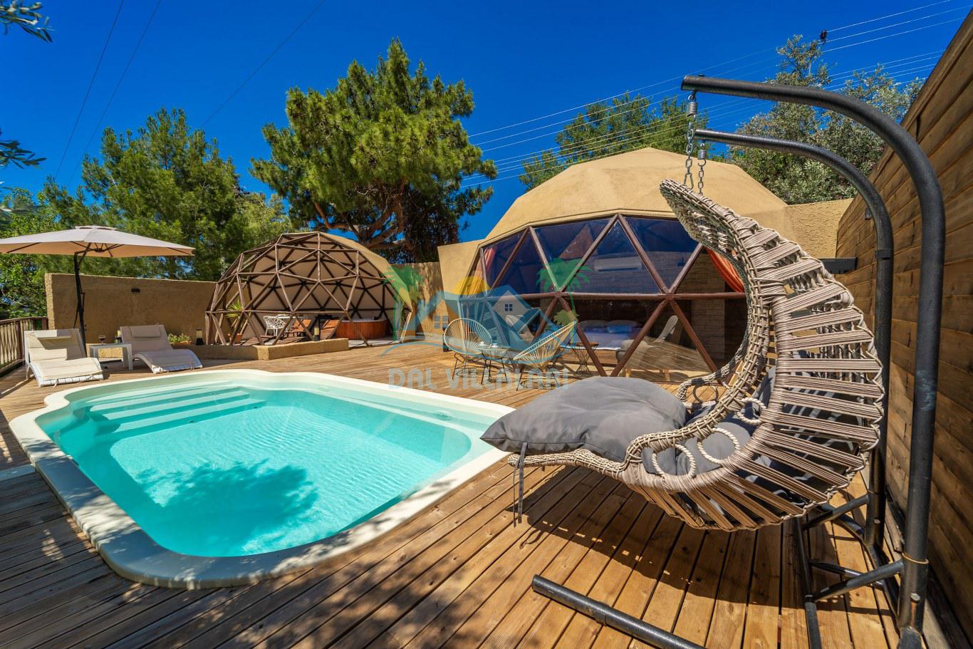 Her biri ayrı bir havuz terasına sahip olan kubbe tipi villalarımız, Türkiye'de ilk defa 7 metre çapında, 4.30 metre kubbe yüksekliğinde ve 38 metrekarelik AHŞAP yapısıyla üretilmiştir. Konforlu bir konaklama sağlamak amacıyla binalarımız, güvenlik ve iklim endişelerini göz önünde bulundurularak tasarlanmıştır.