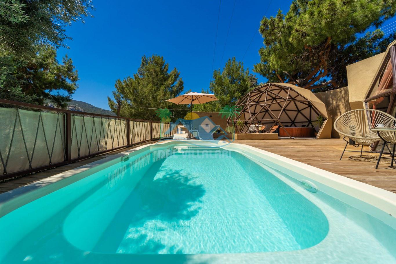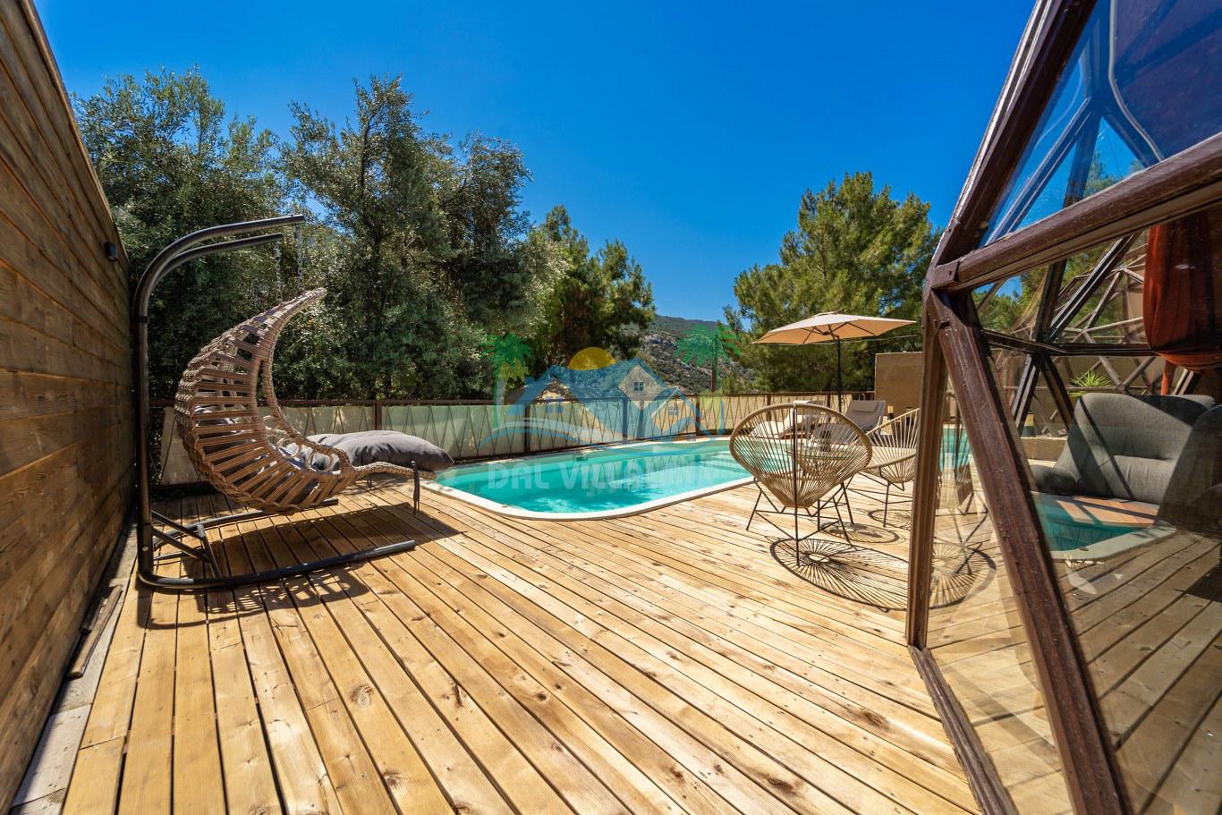 Villalarımızın dış mekanında, 6x3 metre boyutlarında ve 1.35 metre derinliğinde özel bir yüzme havuzu yer almaktadır. Basamaklı girişi ve hidromasajlı jakuzisi ile konuklara keyifli bir havuz deneyimi sunmaktadır. Ayrıca, her villada iki adet şezlong, şemsiye, salıncak, geniş yemek masası, 2 sandalye ve yumurta tipi oturma grubu standart olarak bulunmaktadır. (No1 hariç, hepsinde 2 kişilik yumurta tipi oturma grubu ve sehpası mevcuttur. No5 özel bir gölgelik geodesik kamelya ve bu kamelyada 2 adet ekstra ahşap şezlong içermektedir.)