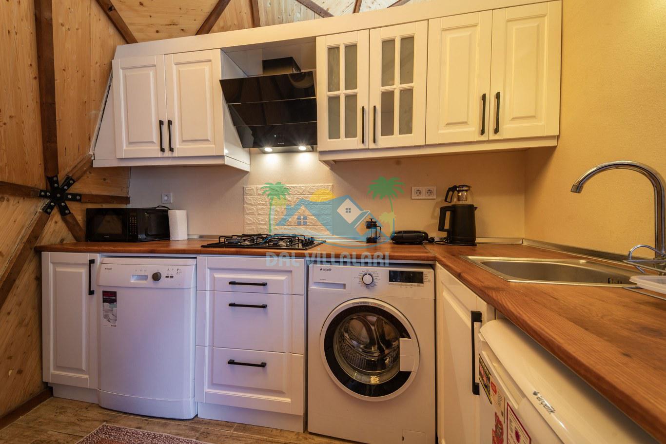 Villalarımızın iç mekanında standart olarak 2 kişilik yatak, 2 koltuk ve sehpa, makyaj masası, küçük bir yemek masası, Akıllı TV ve Uydu yayını, açık gardrop, yangın söndürme tüpü, klima ve uzaktan kumandalı tavan vantilatörü gibi olanaklar bulunmaktadır. Mutfak bölümünde ise çamaşır-bulaşık makinesi, mini buzdolabı (114 litre), mikrodalga fırın, ankastre ocak-davlumbaz ve yeterli mutfak malzemeleri mevcuttur. Kısa süreli konaklamalar için çay-kahve seti ve tek kullanımlık şampuan, saç kremi, sabun gibi malzemeler temin edilmektedir.