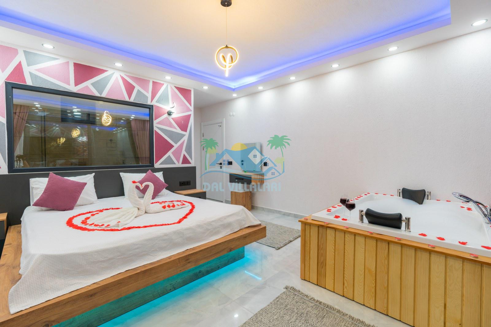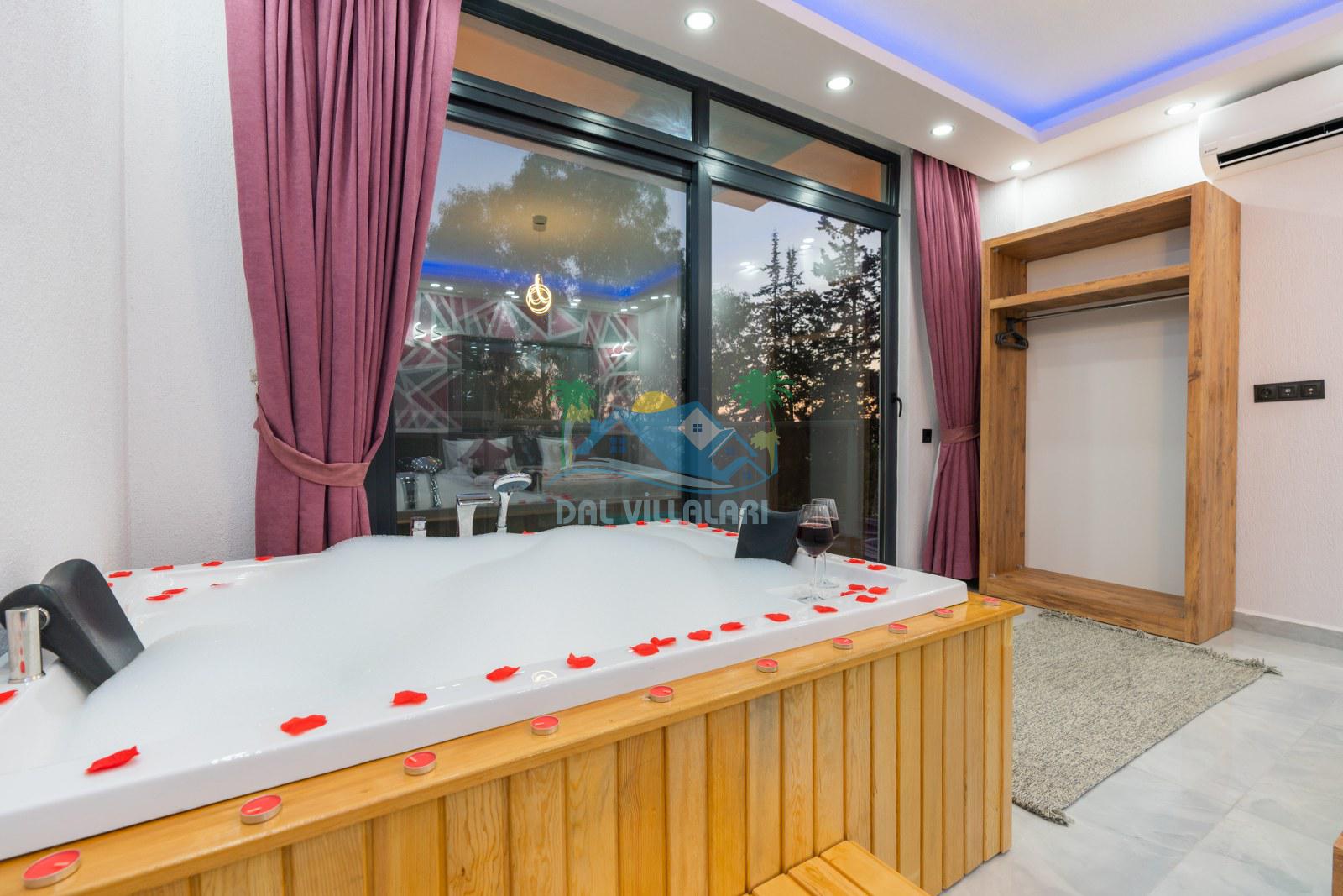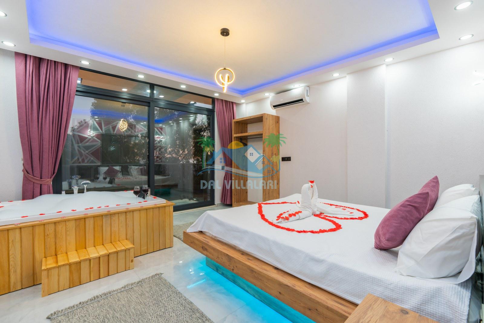 Kalkan'ın İslamlar köyünde bulunan havuzundaki korunaklı villalar , balayı villaları ve jakuzili villalar içindekiki villa Lilyum, 2 yatak odalı ve 4 kişi konaklama imkanına sahiptir. Doğadaki konumu, bahçesi ve şık tasarımı ile dikkat çeken villamızın çevresindeki perdeleme işlemlerinin dolayısıyla odası ve bahçesi dışarıdan görünmüyor. Muhafazakar ailelerimiz ya da da özel hissetmek isteyen balayı çiftlerimiz için tasarlanmış villa Lilyum, güzel hatıralar biriktireceğiniz huzurlu bir tatil sizi bekliyor. Modern yapısı ile özellikle balayı çiftleri tarafından sıklıkla tercih edilen Villa Lilyum kusursuz bir tatil isteyenlerin ilk tercih ettikleri villamızdır. Kiralık balayı villası Lilyum ile muhteşem bir balayı tatiline hazır mısınız?