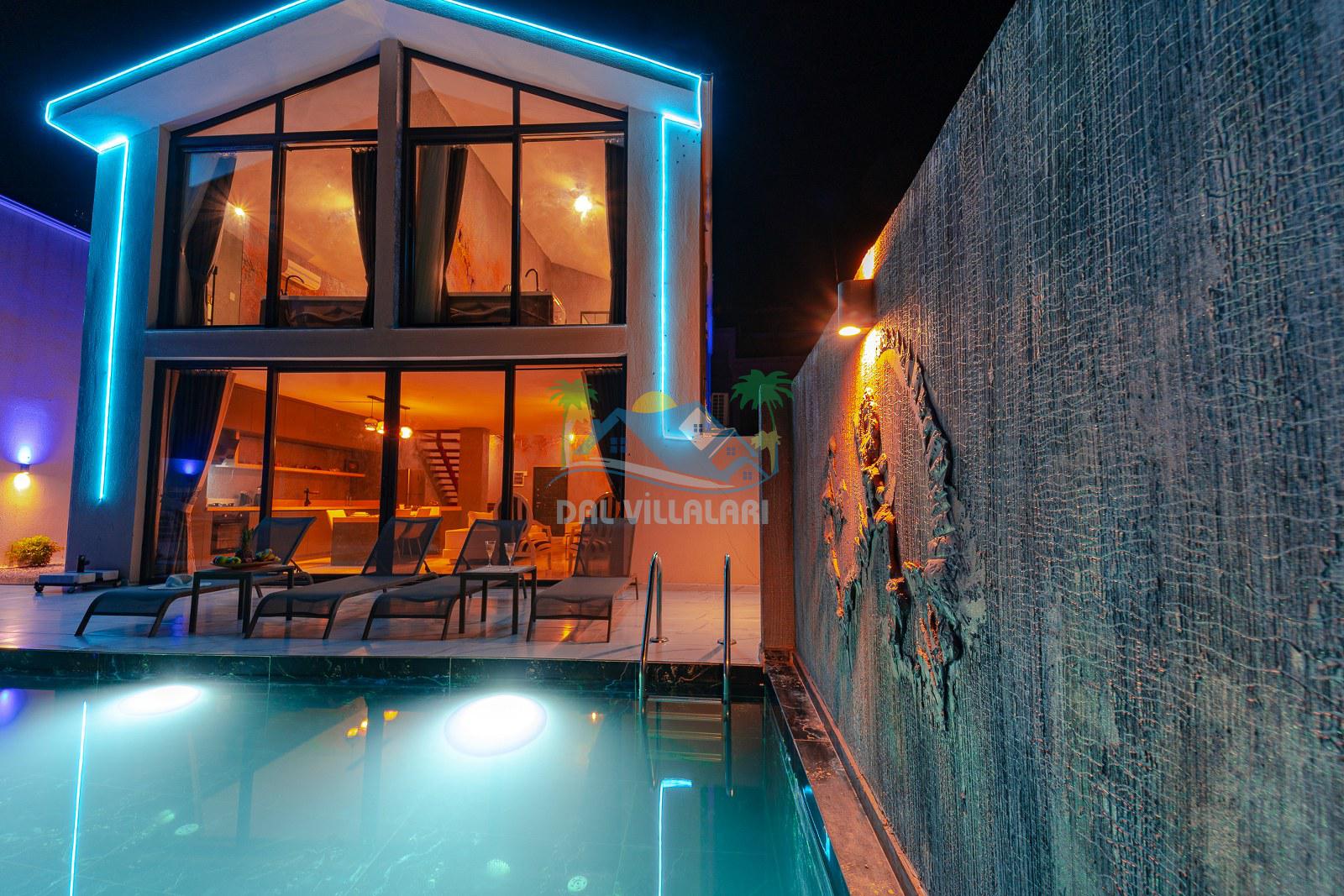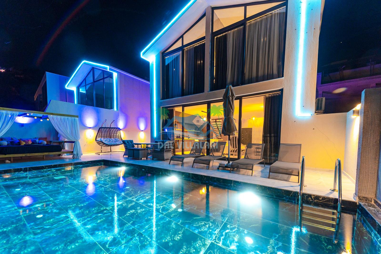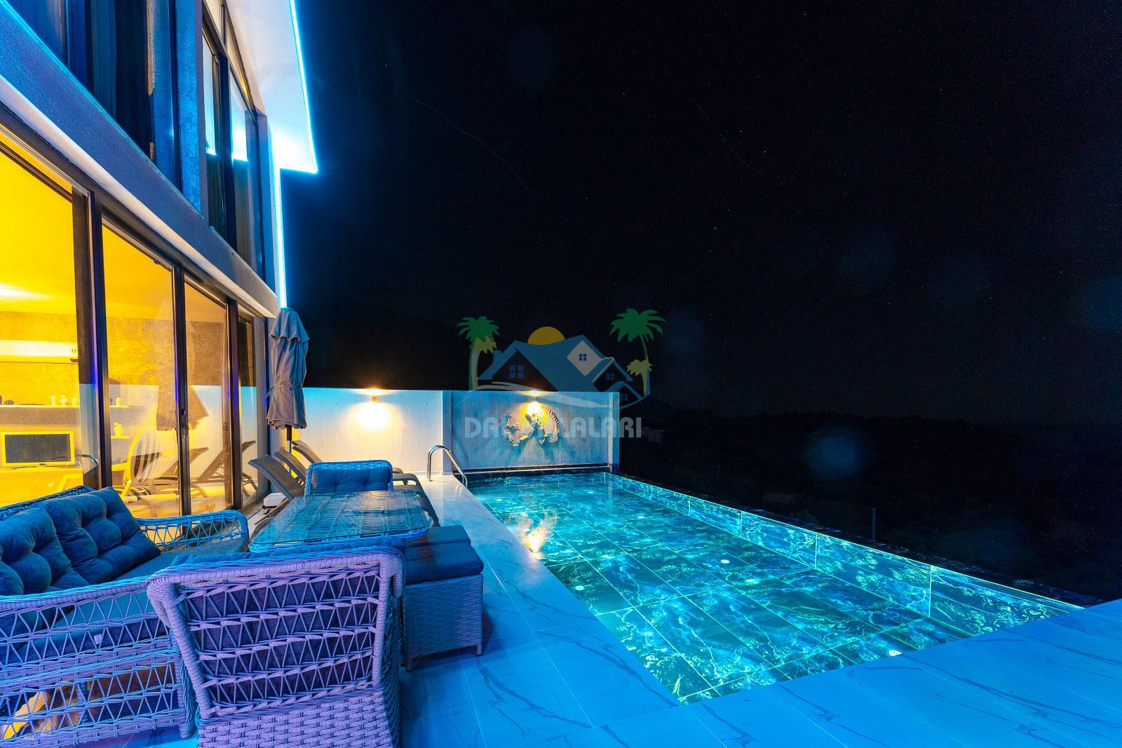 Villanın dış alanında özel yüzme havuzu, güneşlenme terası ve dinlenme alanı bulunmaktadır. Özellikle görsellerde de dikkat çeken, şık dinlenme köşesi, günün yorgunluğunu atmak, akşam saatlerinde keyif yapmak ve tatilin tadını daha özel hissetmek isteyen misafirlerimiz için harika bir atmosfer sunmaktadır. Hem gündüz hem akşam kullanıma uygun olan bu alan, villaya farklı ve estetik bir hava katmaktadır.