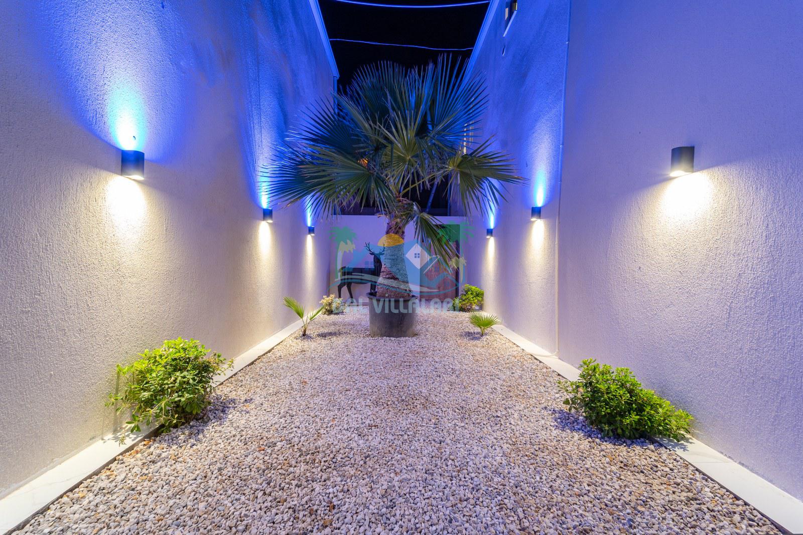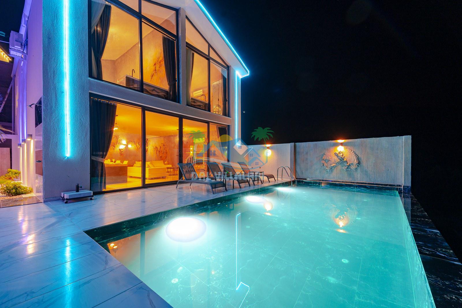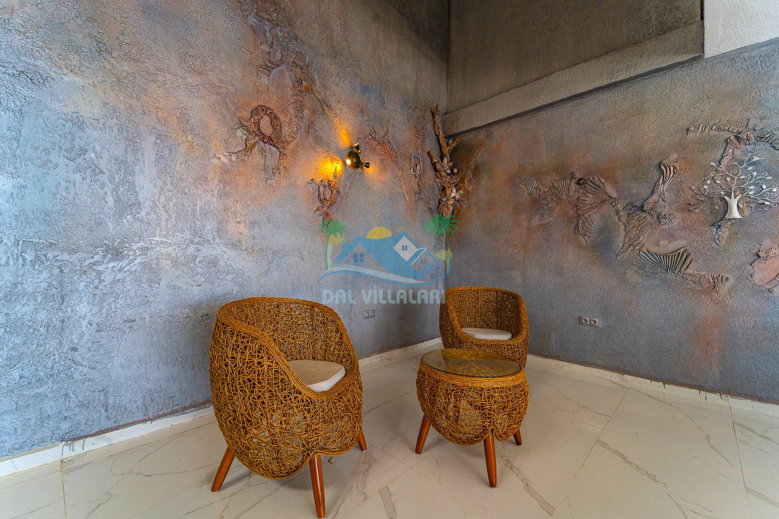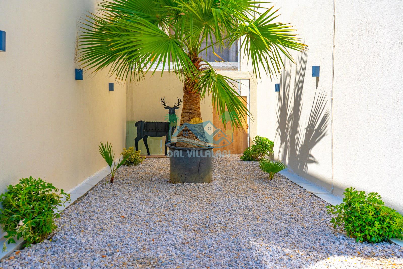 Villanın dış alanında özel yüzme havuzu, güneşlenme terası ve dinlenme alanı bulunmaktadır. Özellikle görsellerde de dikkat çeken, şık dinlenme köşesi, günün yorgunluğunu atmak, akşam saatlerinde keyif yapmak ve tatilin tadını daha özel hissetmek isteyen misafirlerimiz için harika bir atmosfer sunmaktadır. Hem gündüz hem akşam kullanıma uygun olan bu alan, villaya farklı ve estetik bir hava katmaktadır.